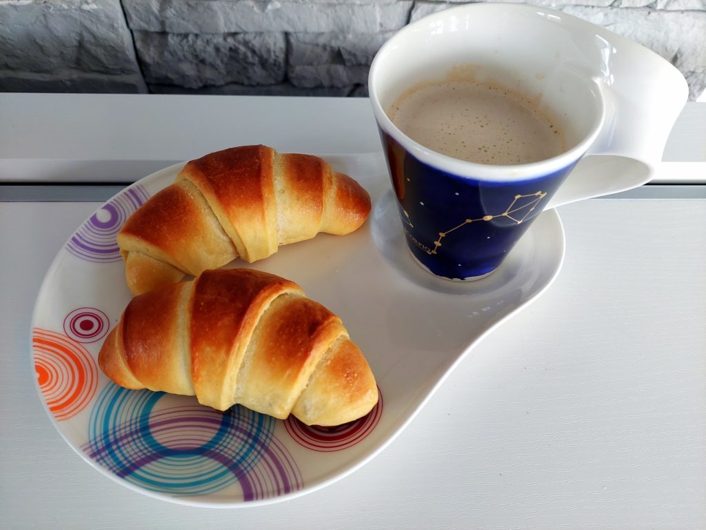 Herausgekommen sind nicht nur unglaublich fluffige, sondern auch wunderbar buttrige Hörnchen mit einem Hauch von weißer Schokolade. Vielen Dank, liebe Britta, für dieses tolle Sonntagsfrühstück, Du hast uns wirklich den Morgen versüßt!