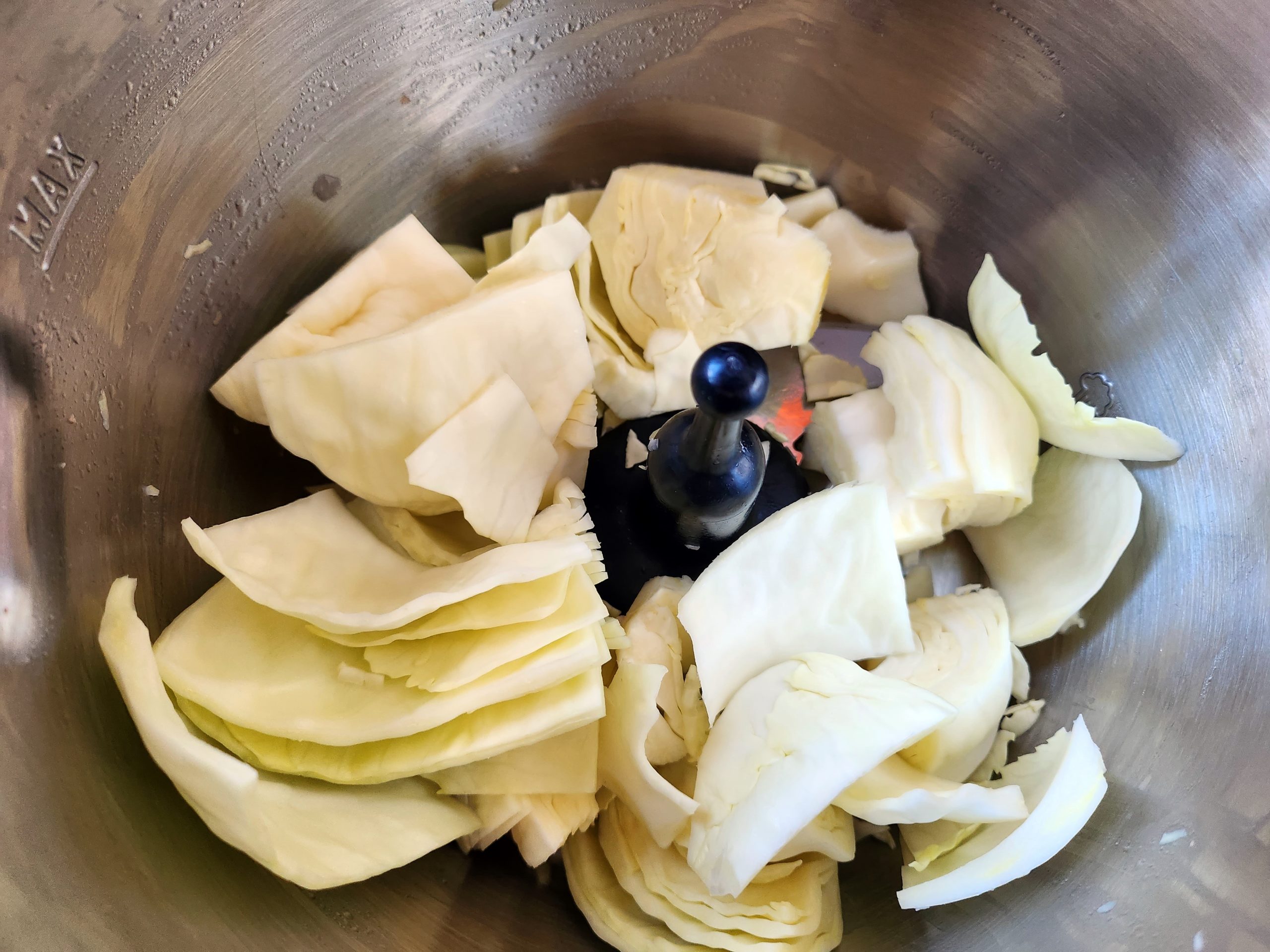 Den Kohl grob zerteilen und in der Küchenmaschine schreddern. Dazu bei der Prep&Cook das Ultrablade-Messer einsetzen. Auf Stufe 10 stellen und 15s anstellen. Anschließend den Weißkohl in eine ausreichend große Schüssel füllen.