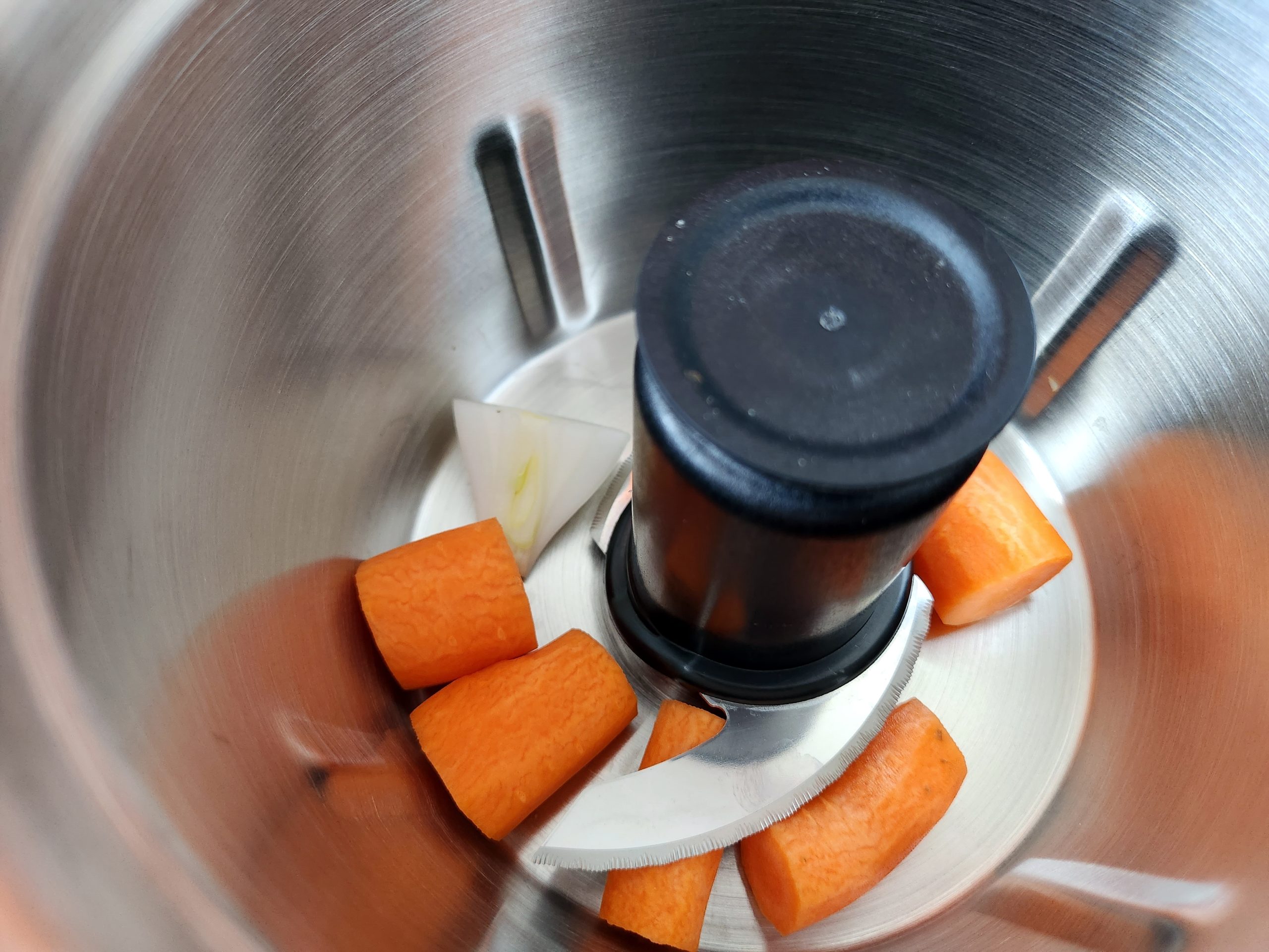 Bei Verwendung der Prep&Cook sollte unbedingt die Minischüssel auf Grund der geringen Menge verwendet werden. Auch hier auf Stufe 10 stellen und 1min raspeln lassen, dabei zwischendurch vom Rand abschaben.
