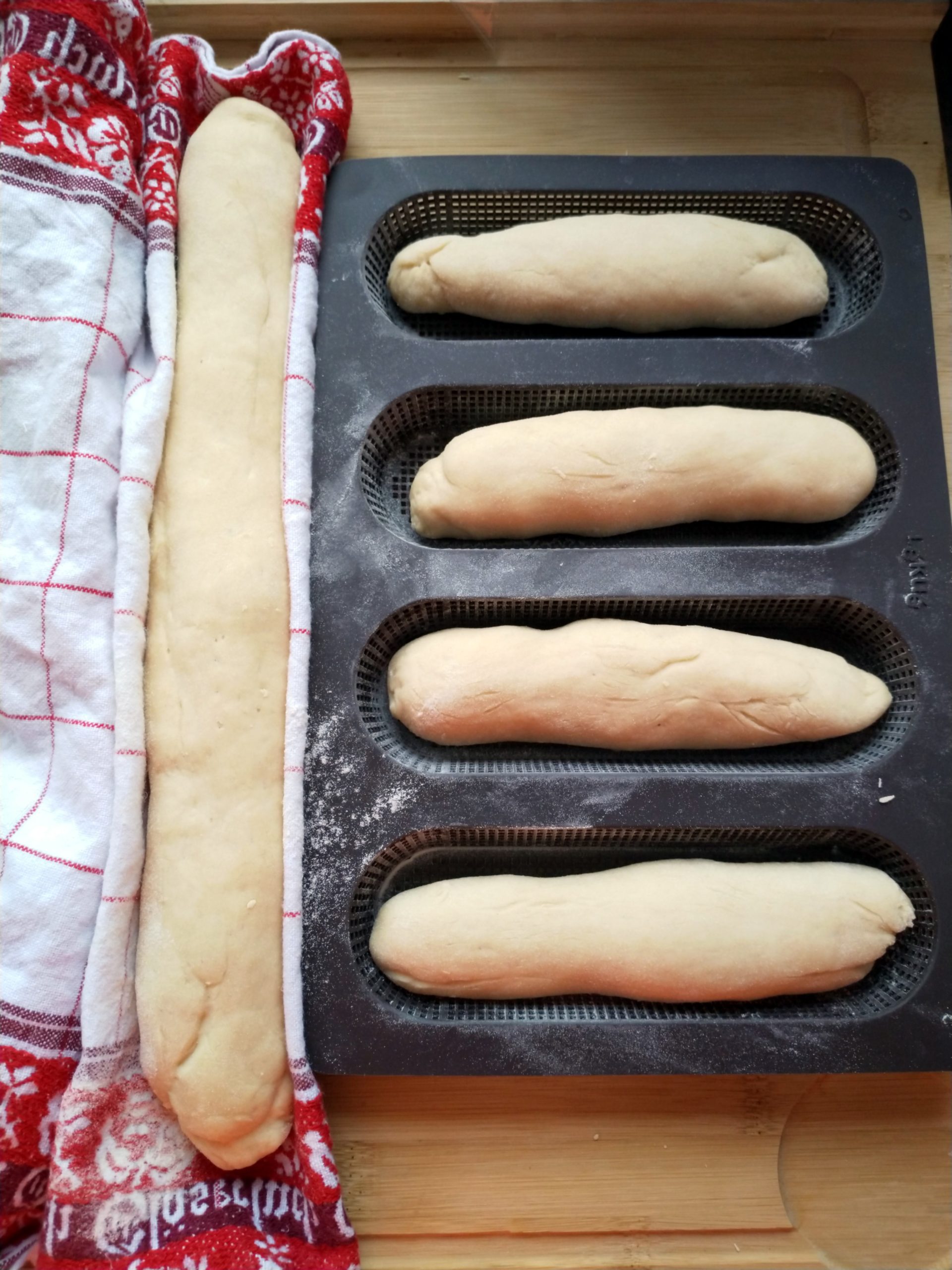 Danach den Teig zu Baguettes formen. Dabei den Teig mehrmals übereinander falten und andrücken, damit das Baguette Festigkeit erhält. Entweder in entsprechende Formen* setzen oder in ein bemehltes Küchentuch legen. Die Ränder dabei hochschlagen, damit das Baguette nicht zur Seite auseinanderläuft. Erneut mit Folie abdecken und 1h gehen lassen.