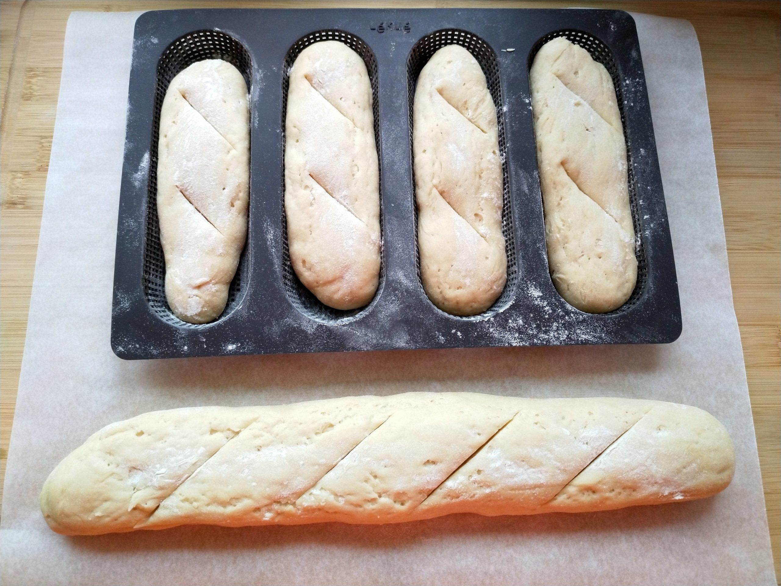 Ofen auf 240°C vorheizen und die Fettpfanne mit Wasser befüllen um Dampf zu erzeugen. Das Backblech ebenfalls vorheizen. Die Baguettes mit einem scharfen Messer schräg einschneiden und vom Tuch auf's Backpapier setzen. Ist der Ofen heiß, auf 200°C runterstellen und das Backpapier mit den Baguettes auf das heiße Blech ziehen und backen.