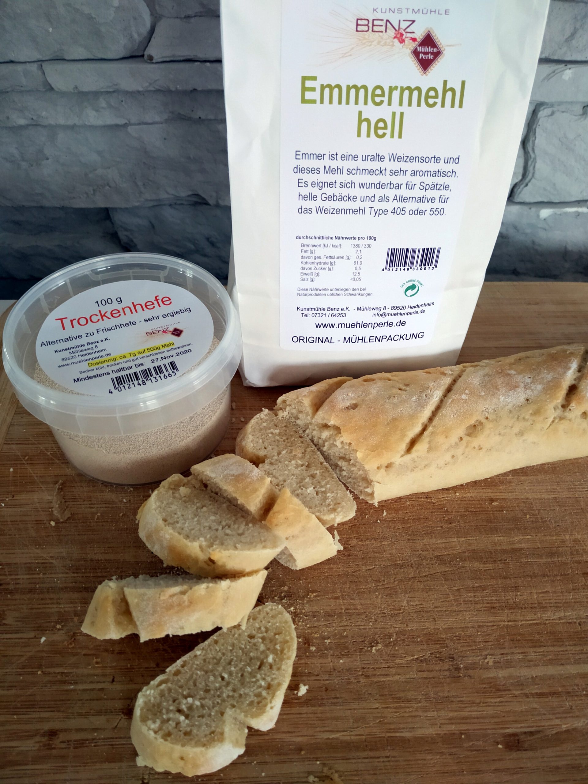Anstatt Emmermehl* kann man auch Weizenmehl Type 550 verwenden. Dieses ist etwas mineralreicher als das "normale" Type 405 und nimmt beim Aufgehen des Teiges die Flüssigkeit langsamer auf.