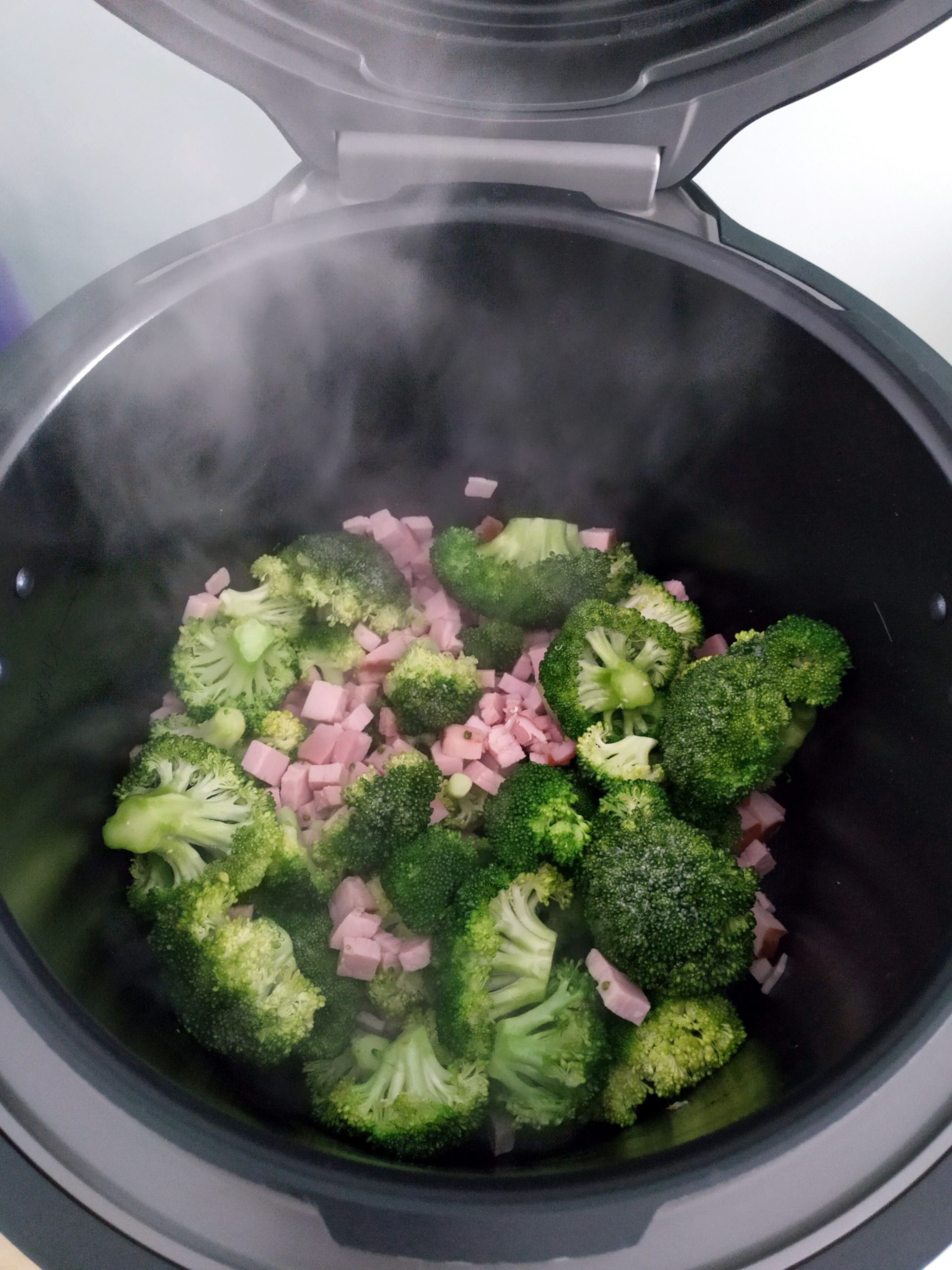 Broccoli-Röschen vom Strunk trennen und waschen. Schinken würfeln und gemeinsam mit dem Broccoli in den Topf geben. Etwas Öl dazugeben und 5min bei offenem Deckel anbraten.