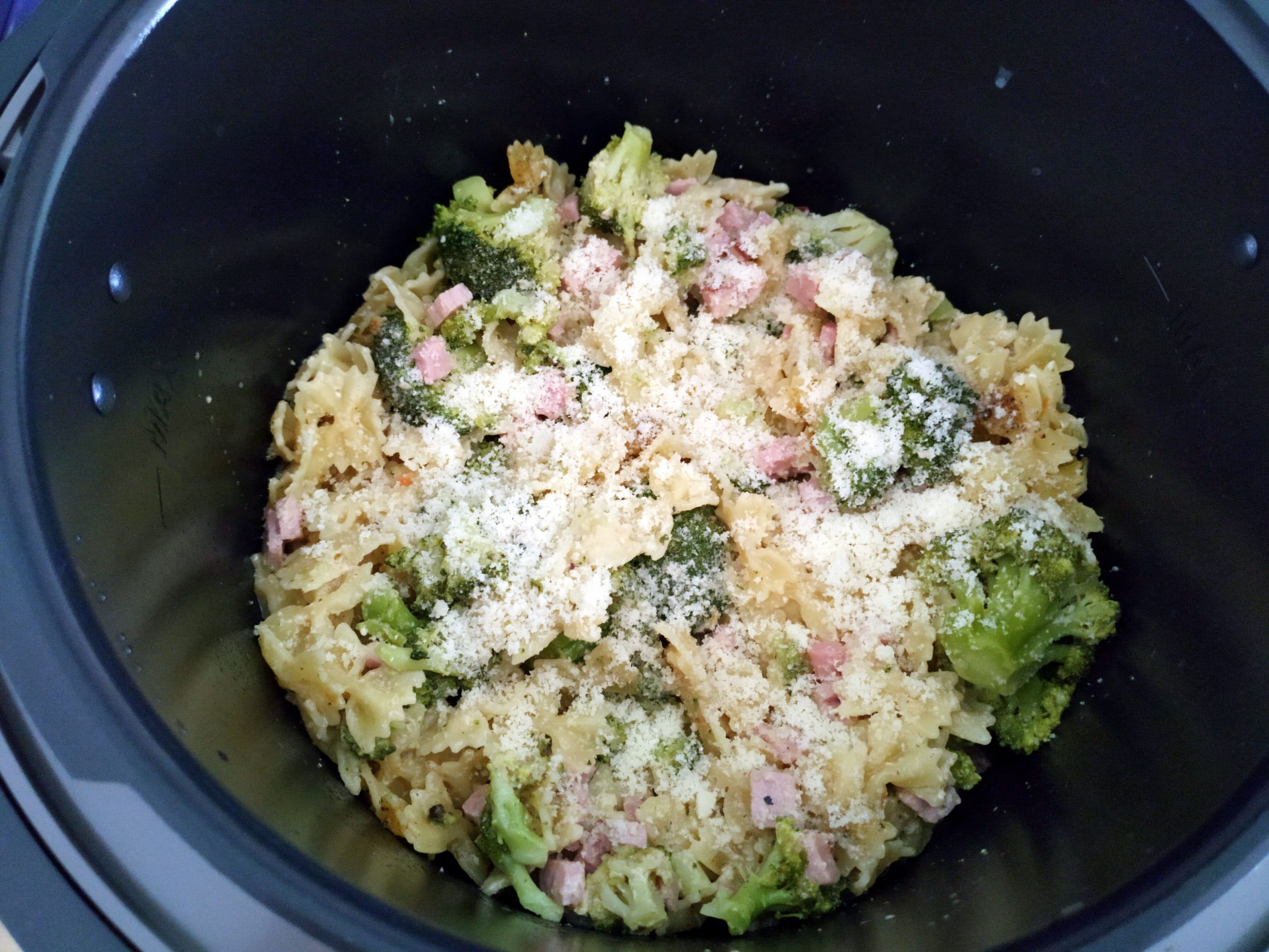 Broccoli und Nudeln zu Schinken-Sauce geben, durchrühren und vor dem Servieren mit Parmesan bestreuen.