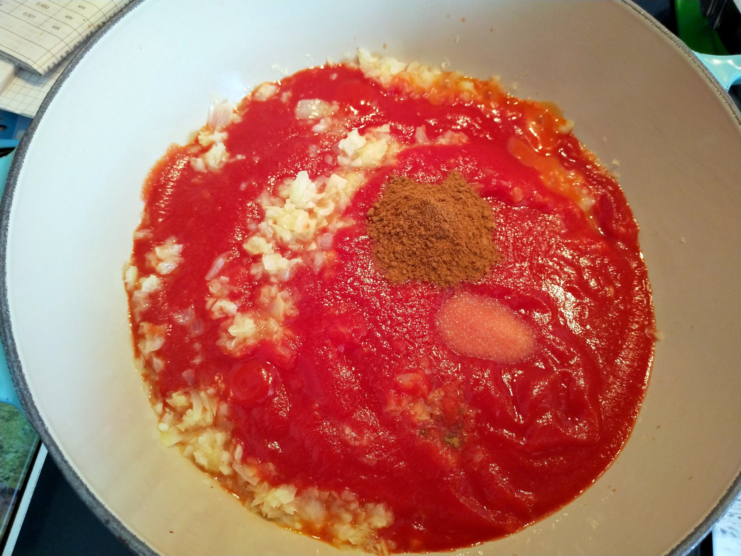 Die passierten Tomaten mit dem Zimt, Salz, Pfeffer und Knoblauch zugeben und 20min mit Deckel bei niedriger Temperatur köcheln lassen, dabei gelegentlich umrühren.