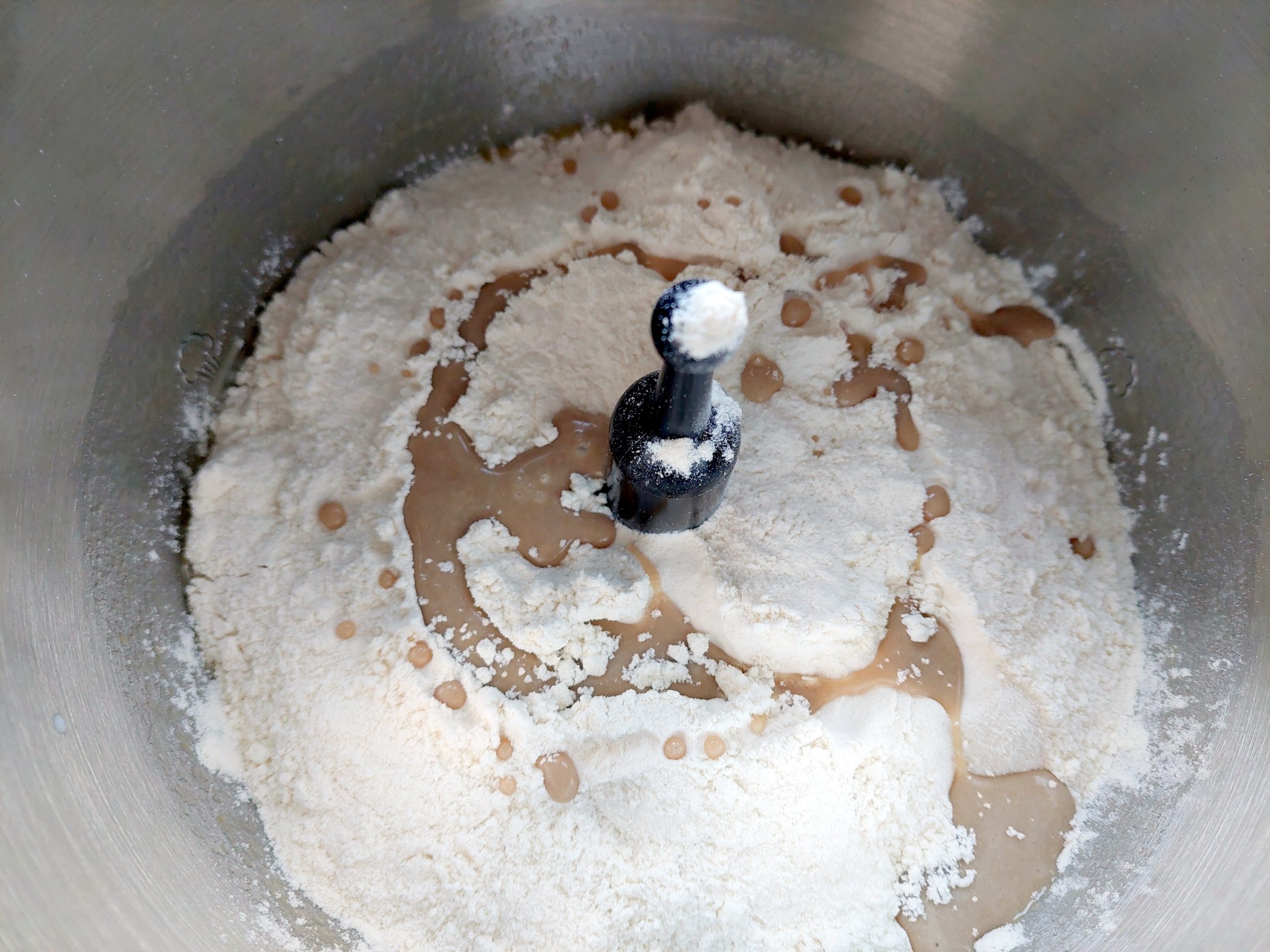 Bei Verwendung der Prep&Cook Salz aufstreuen, dann das Mehl zugeben und zum Schluss die Hefe-Honig-Mischung darübergießen. Auf Stufe 5 für 5min kneten lassen.