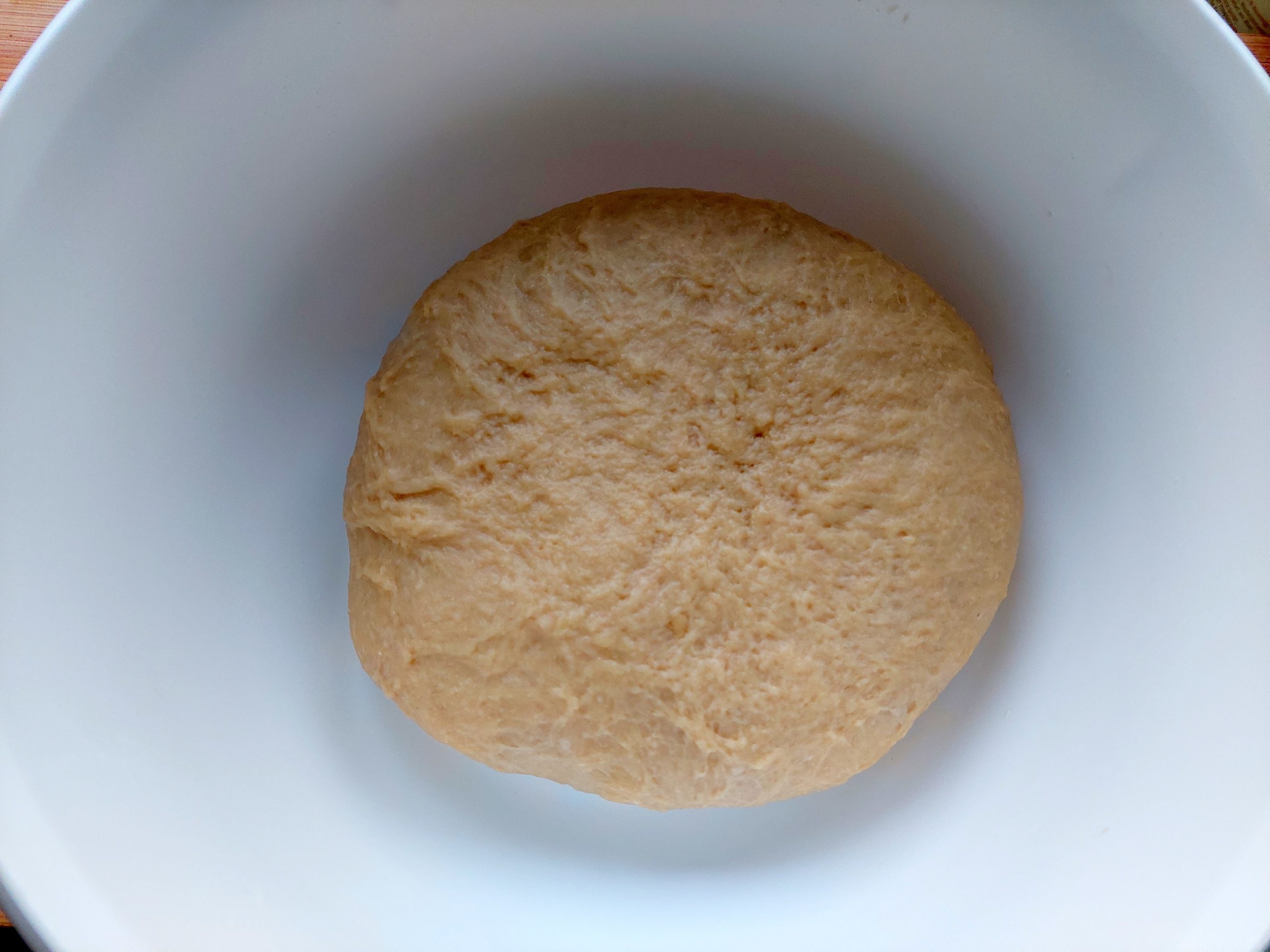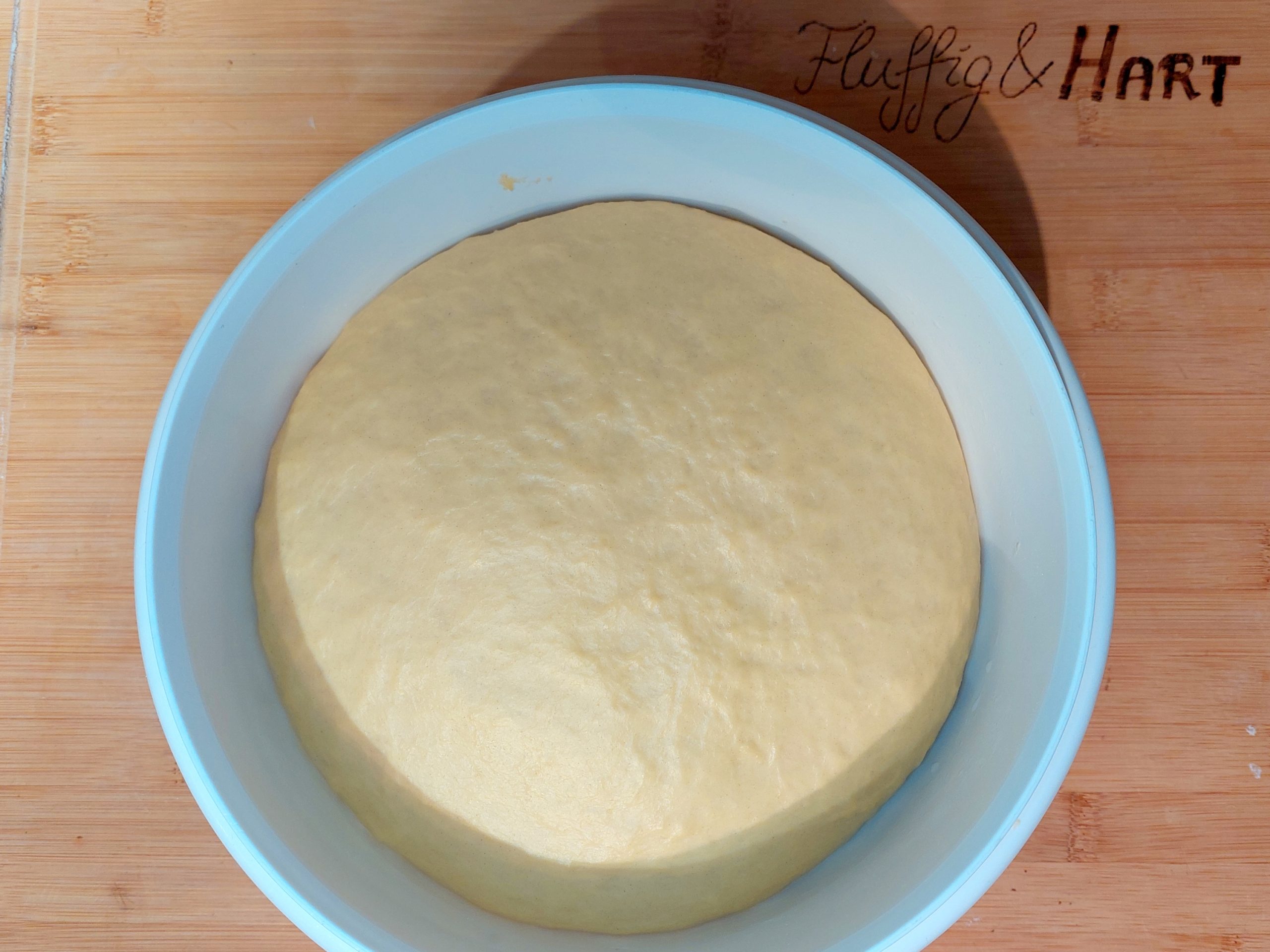 4. Den Teig in eine große Schüssel geben und 1,5h gehen lassen, bis er sich ordentlich vergrößert hat.