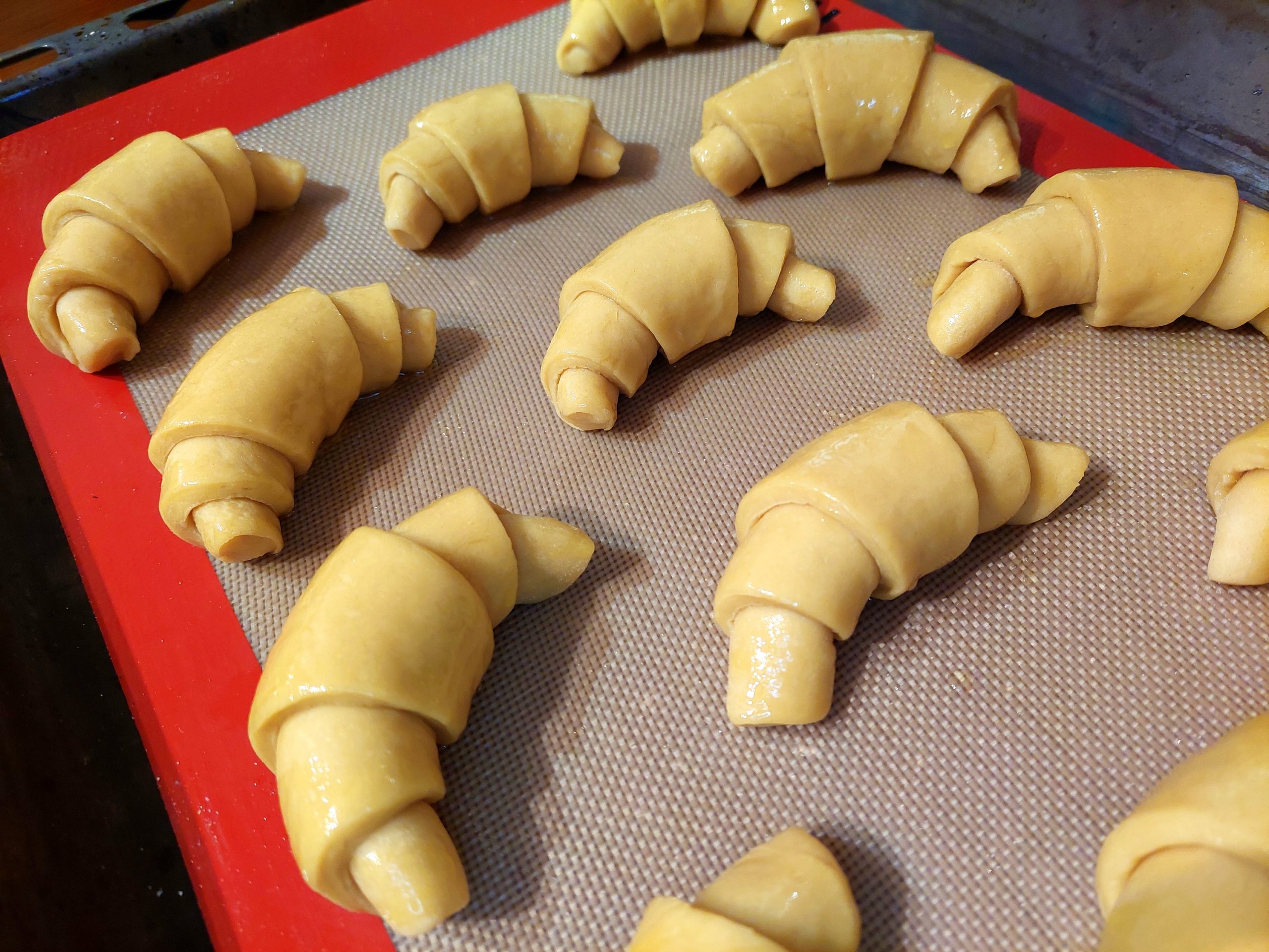 1. Anschließend durchkneten und auf einer bemehlten Arbeitsfläche zu einem runden Fladen ausrollen. In 12 Kuchenstücke schneiden und von der langen Seite her aufrollen. Zu einem Hörnchen biegen und auf Backpapier legen. Die fertigen Hörnchen mit etwas neutralem Öl bestreichen, damit der Teig nicht austrocknet über Nacht. Das Blech abdecken und in den Kühlschrank stellen.