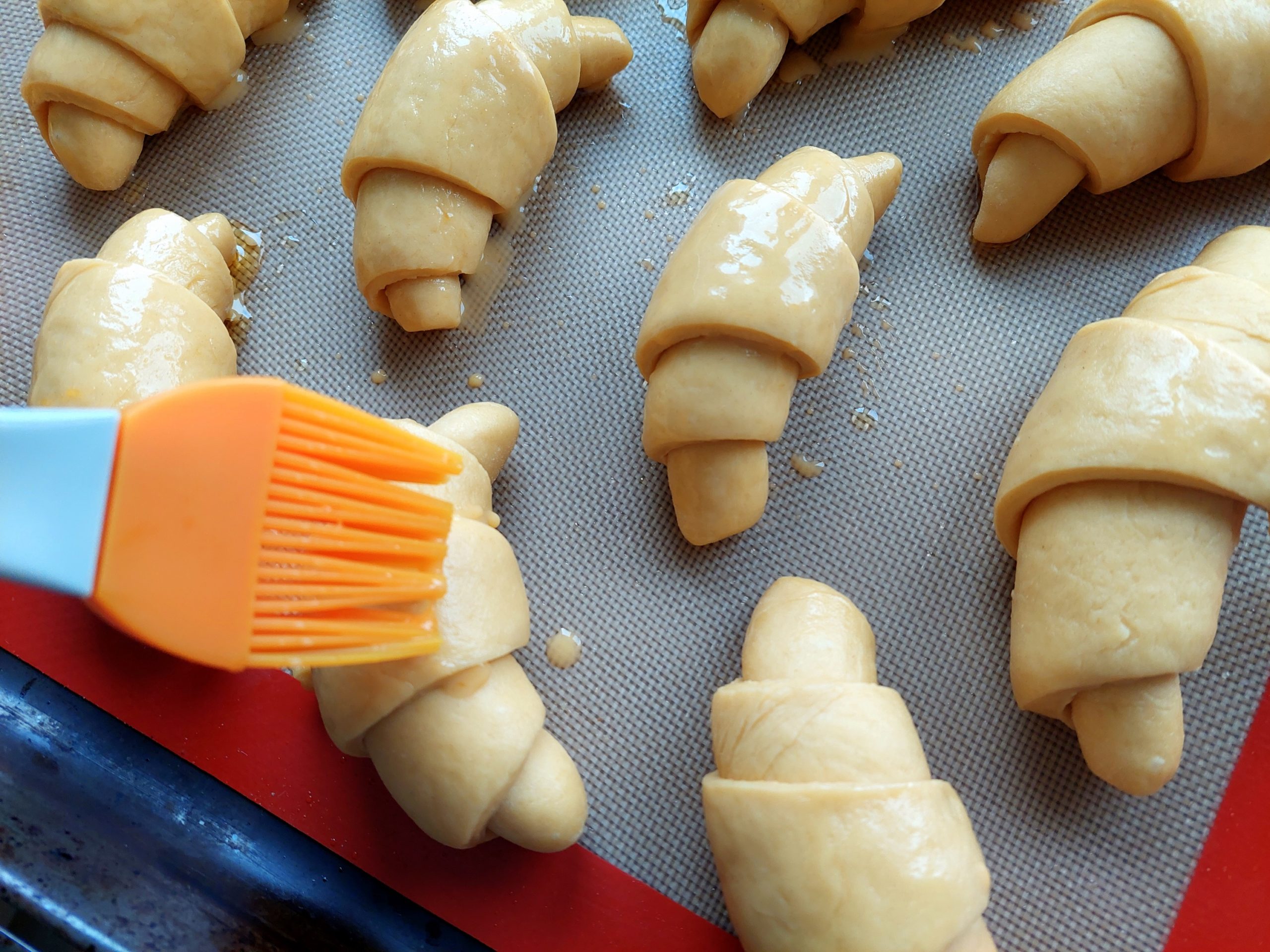 1. Zimmerwarmes (!) Eigelb mit lauwarmer Milch und etwas Zucker verquirlen und auf die Hörnchen streichen. In den Ofen schieben und goldbraun backen. Am besten warm genießen.