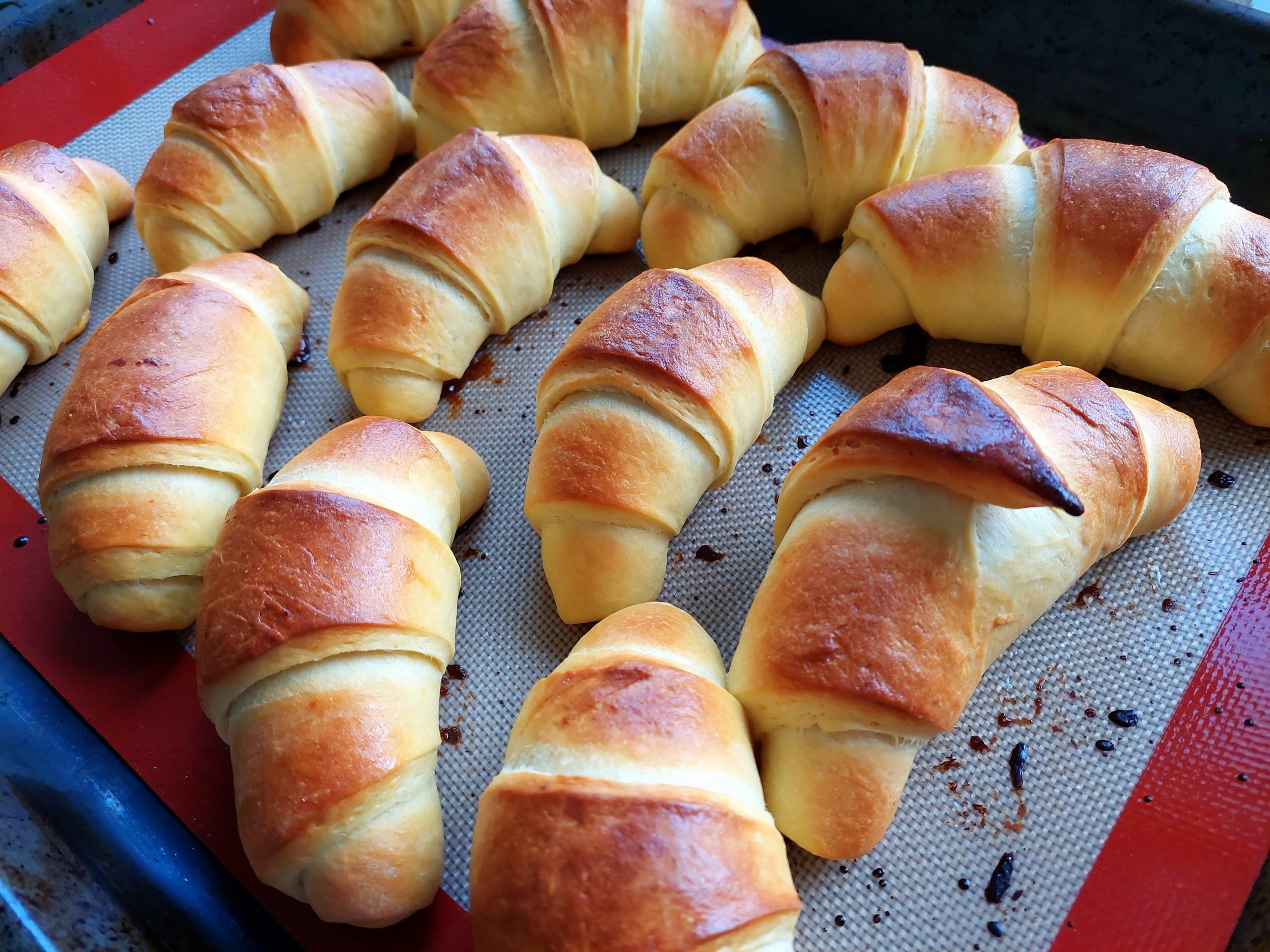 Die Hörnchen werden am Abend vorher geknetet, geformt und gehen gelassen. Dann müssen sie am nächsten Morgen nur noch auf Zimmertemperatur gebracht werden und ab geht's in den Ofen.