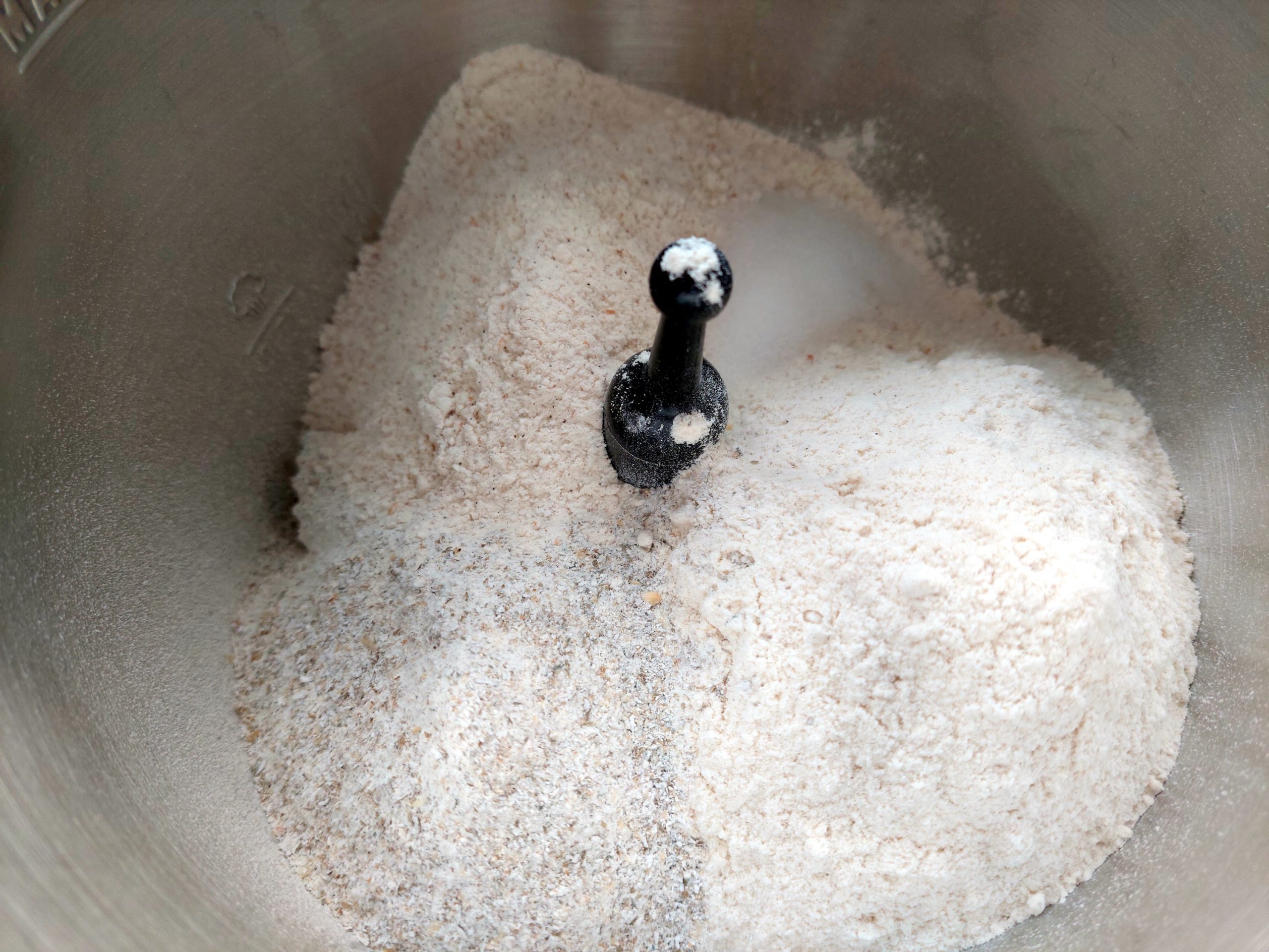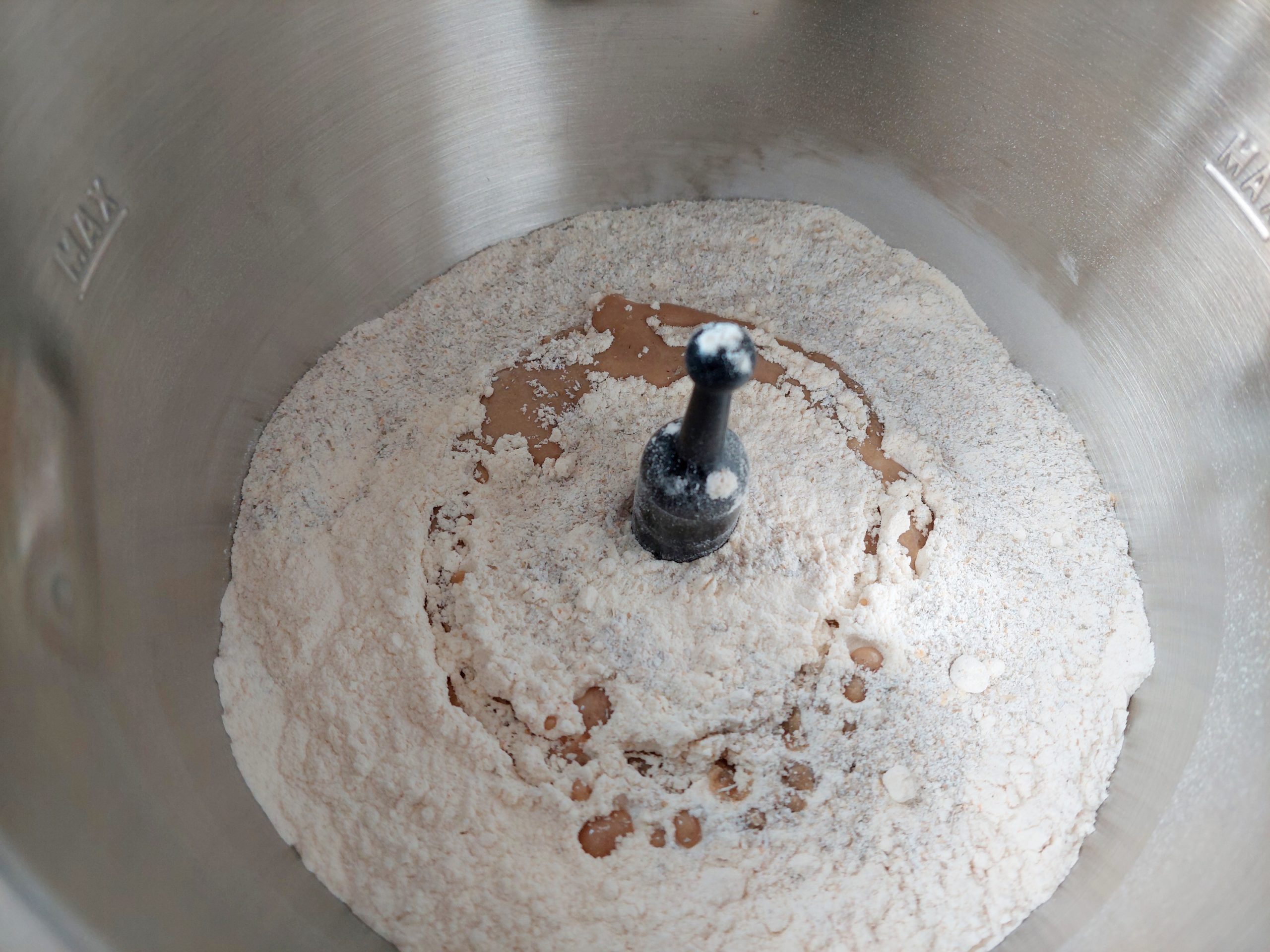 Bei Verwendung der Prep&Cook das Knet-/Mahlmesser einsetzen und die trockenen Zutaten vorlegen. Die mit Honig angerührte Hefe über die Mischung gießen und 10min stehen lassen. Anschließend auf Stufe 3 für 1min vermischen.
