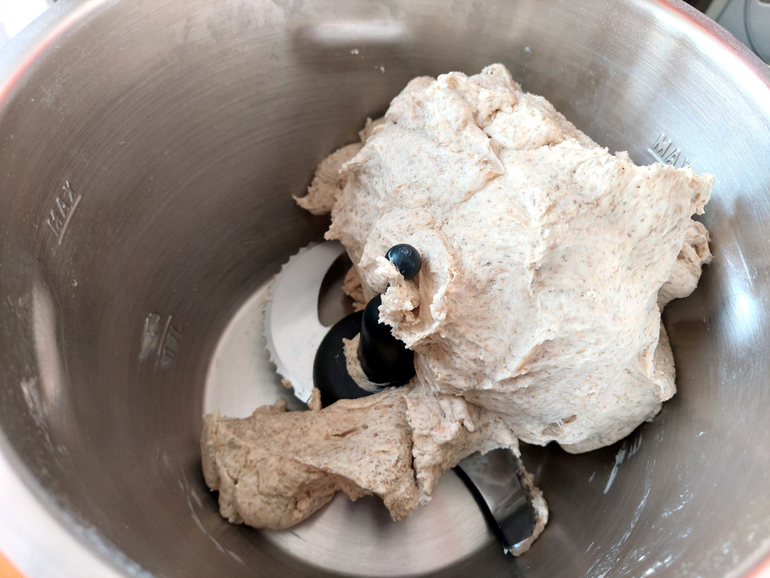 Bei Verwendung der Prep&Cook auf Stufe 4 stellen und durch die Deckelöffnung langsam die Buttermilch einfließen lassen. Alles zu einem geschmeidigen Teig kneten, der sich vom Schüsselrand löst. Anschließend in eine große Schüssel geben und 1h abgedeckt gehen lassen. Ich würde nicht in der Preppie gehen lassen, da die Teigmenge sehr groß ist.