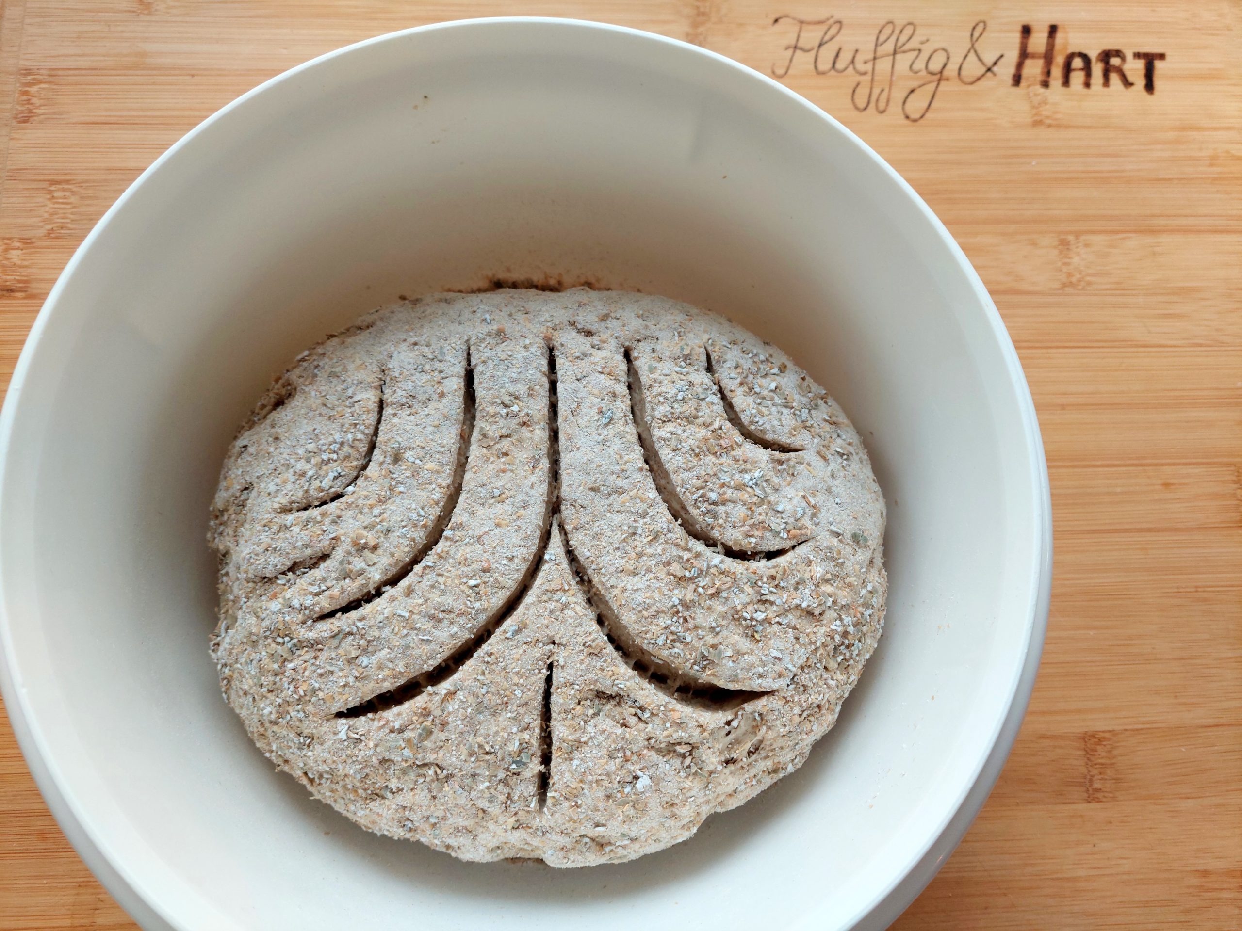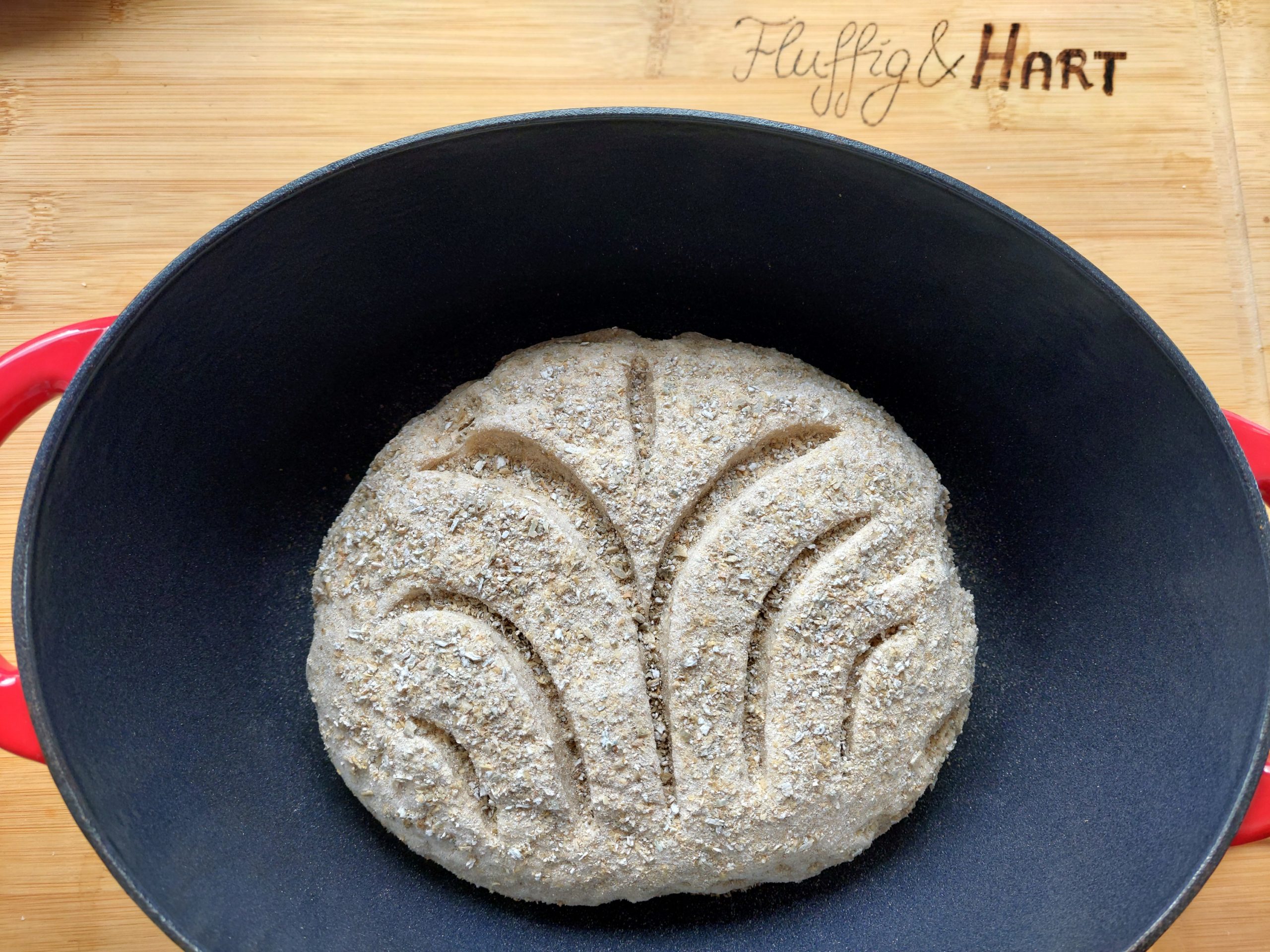 Den Ofen rechtzeitig auf Ober-/Unterhitze 220°C mit dem Topf inkl. Deckel vorheizen. Nach der Gehzeit den Teig einmal durchkneten und einen Brotlaib formen. Mit etwas Mehl bestäuben und nach Belieben ein Muster einritzen. In den heißen Topf setzen und mit Deckel zurück in den Ofen stellen, auf 200°C runterstellen. 50-55 min bis zur gewünschten Bräune backen.