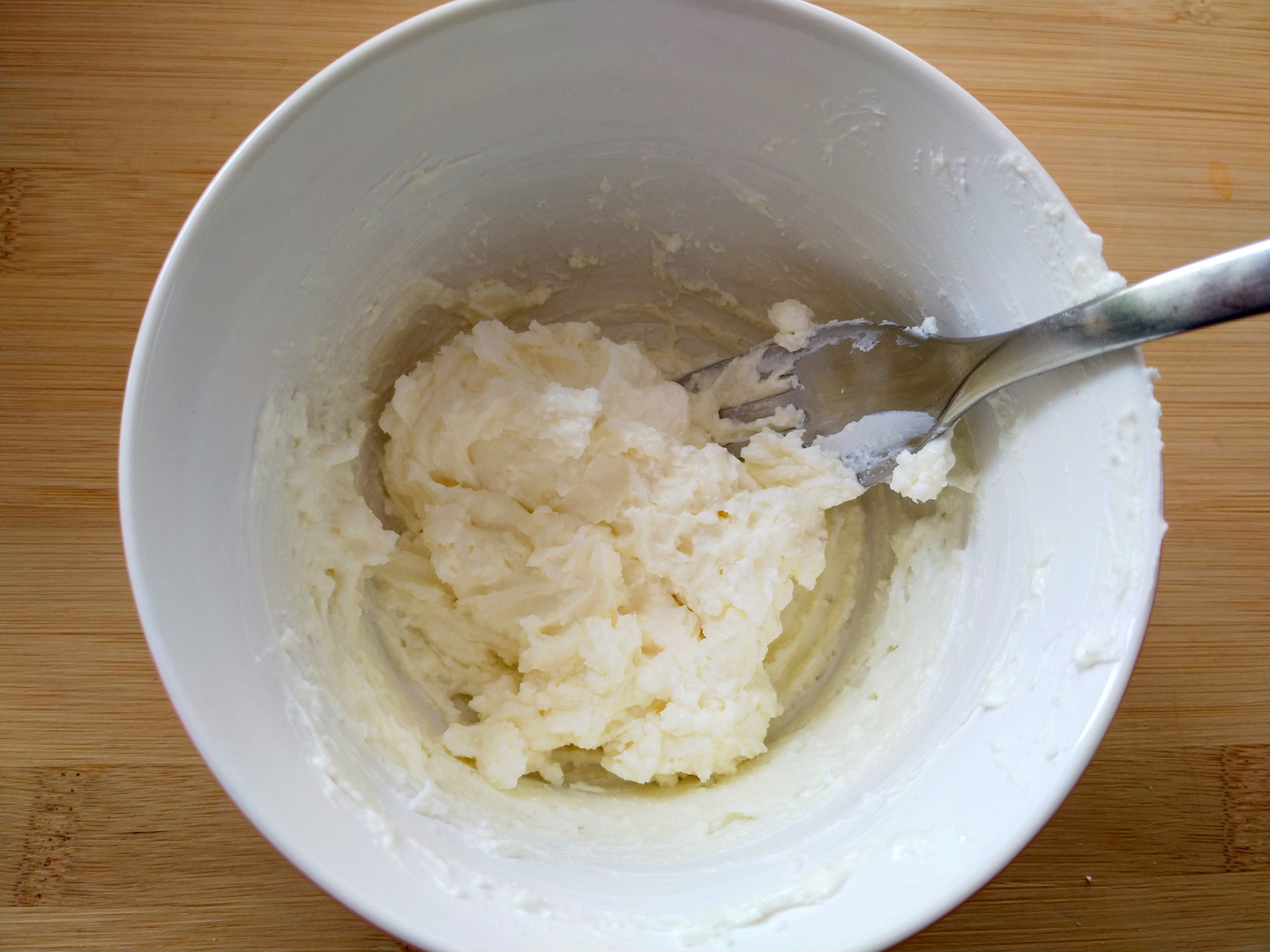 Schafskäse und Frischkäse mit dem Olivenöl mittels einer Gabel zu einer geschmeidigen Creme vermischen. Es sollten keine Klümpchen mehr drin sein, damit die Spritze nicht verstopft.