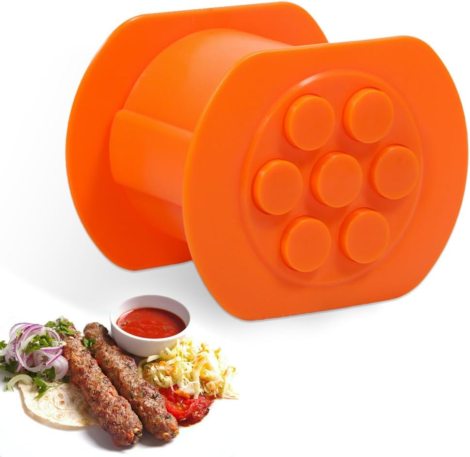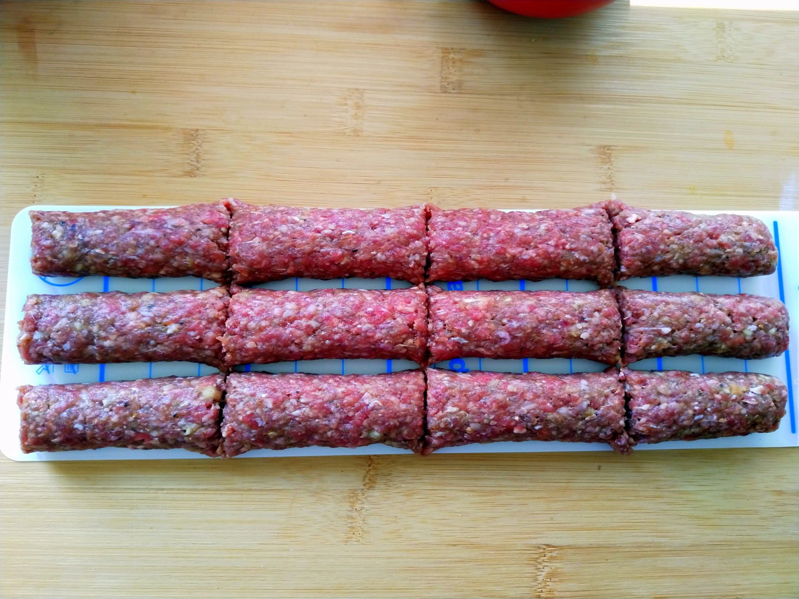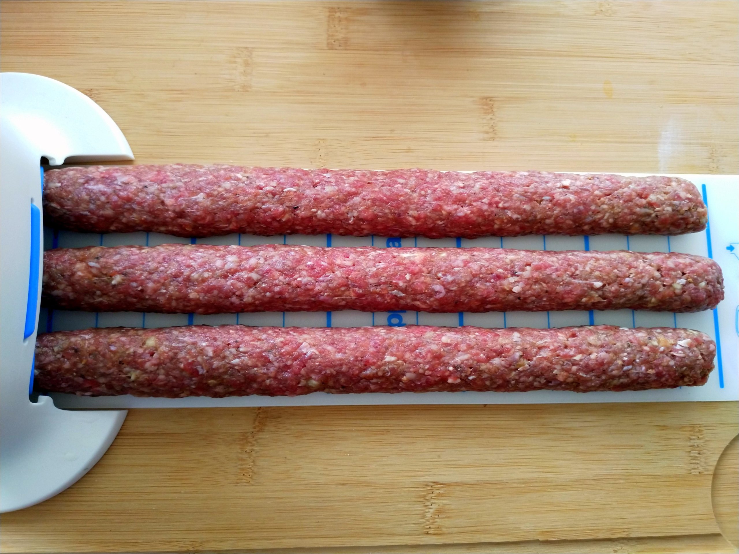 Die längliche Form der Cevapcici gelingen am einfachsten mit einer Presse. Wer so etwas nicht hat, kann entweder runde Frikadellen formen oder die Röllchen wie bei Plätzchenteig auf der Küchenplatte rollen.