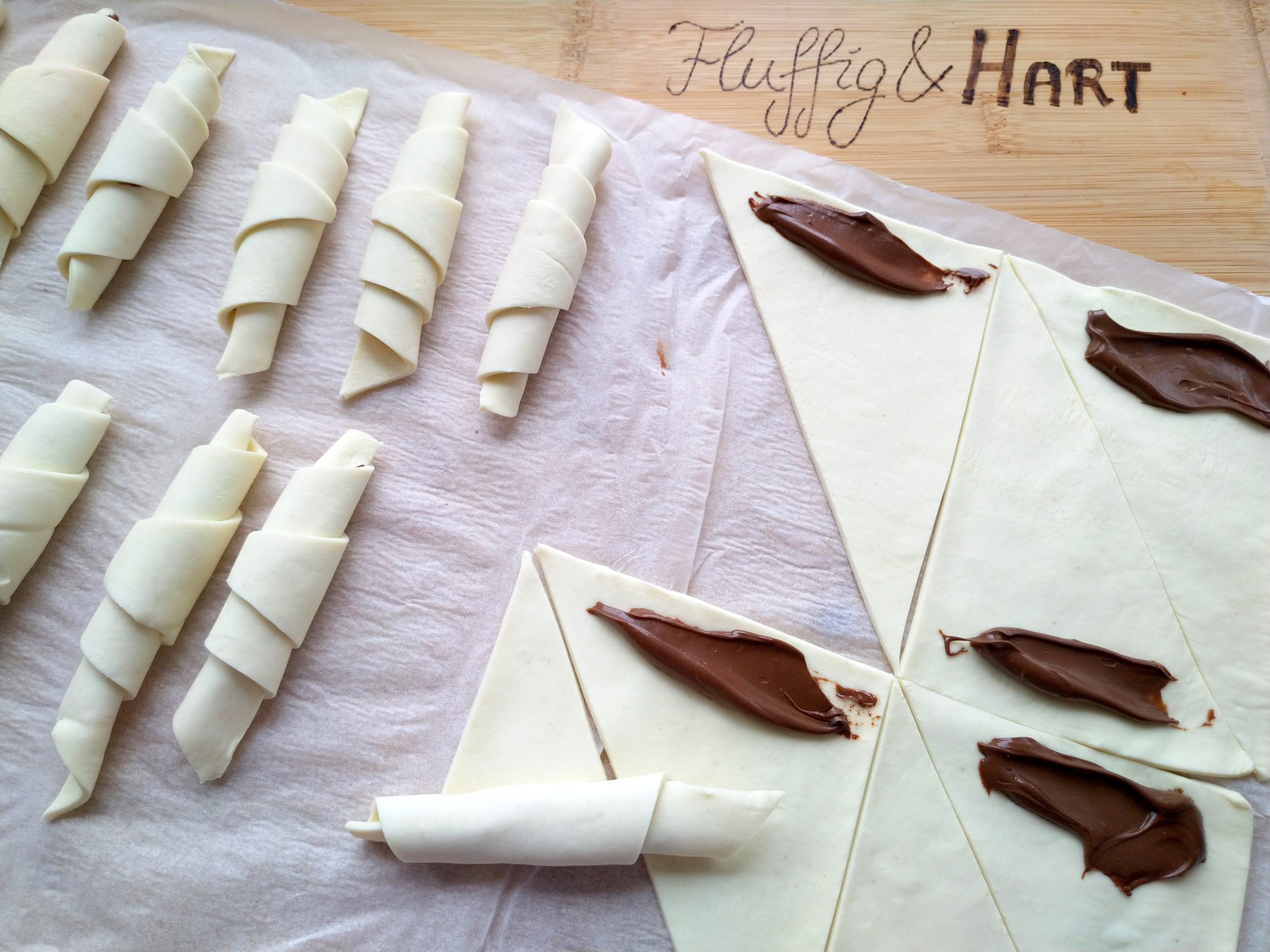 Zimmerwarmes Nutella jeweils an die kurze Kante streichen und zu einem Croissant aufrollen.