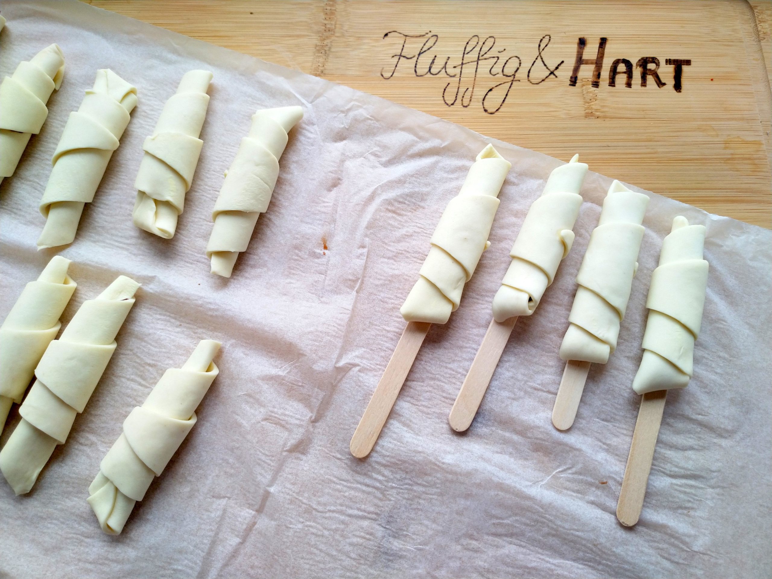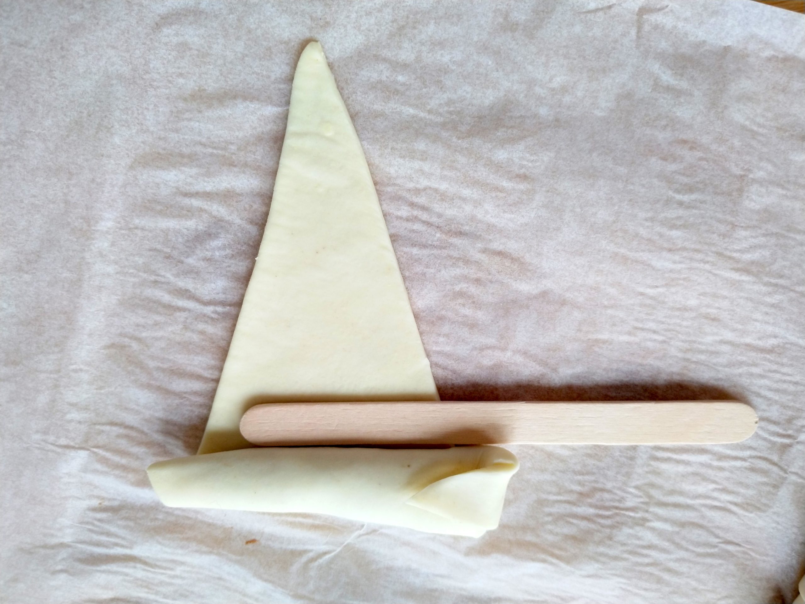 Blätterteig etwas warm werden lassen und ausrollen. Einmal der Länge nach halbieren, dann in 4 Streifen schneiden. Jedes Rechteck diagonal durchschneiden.