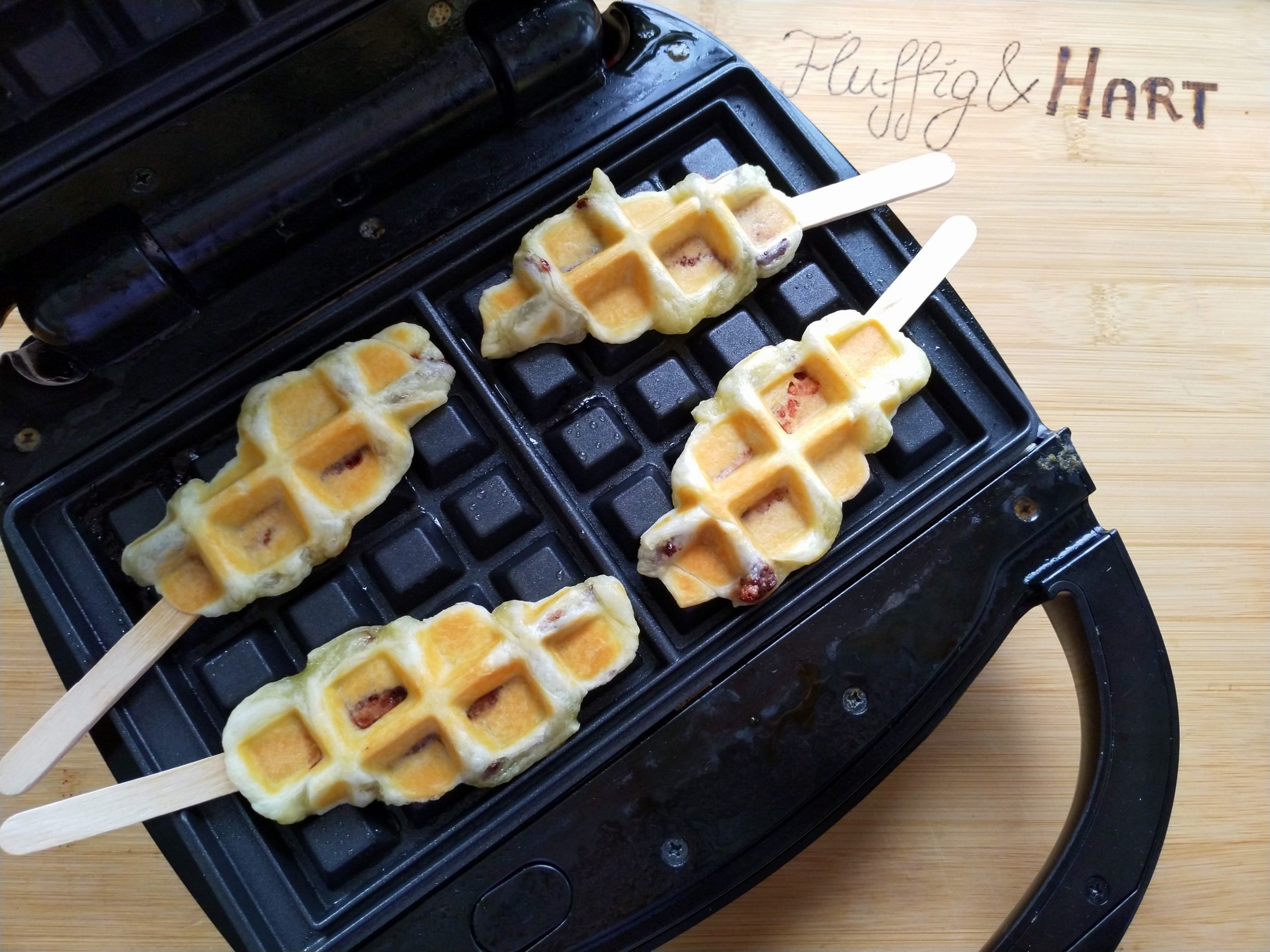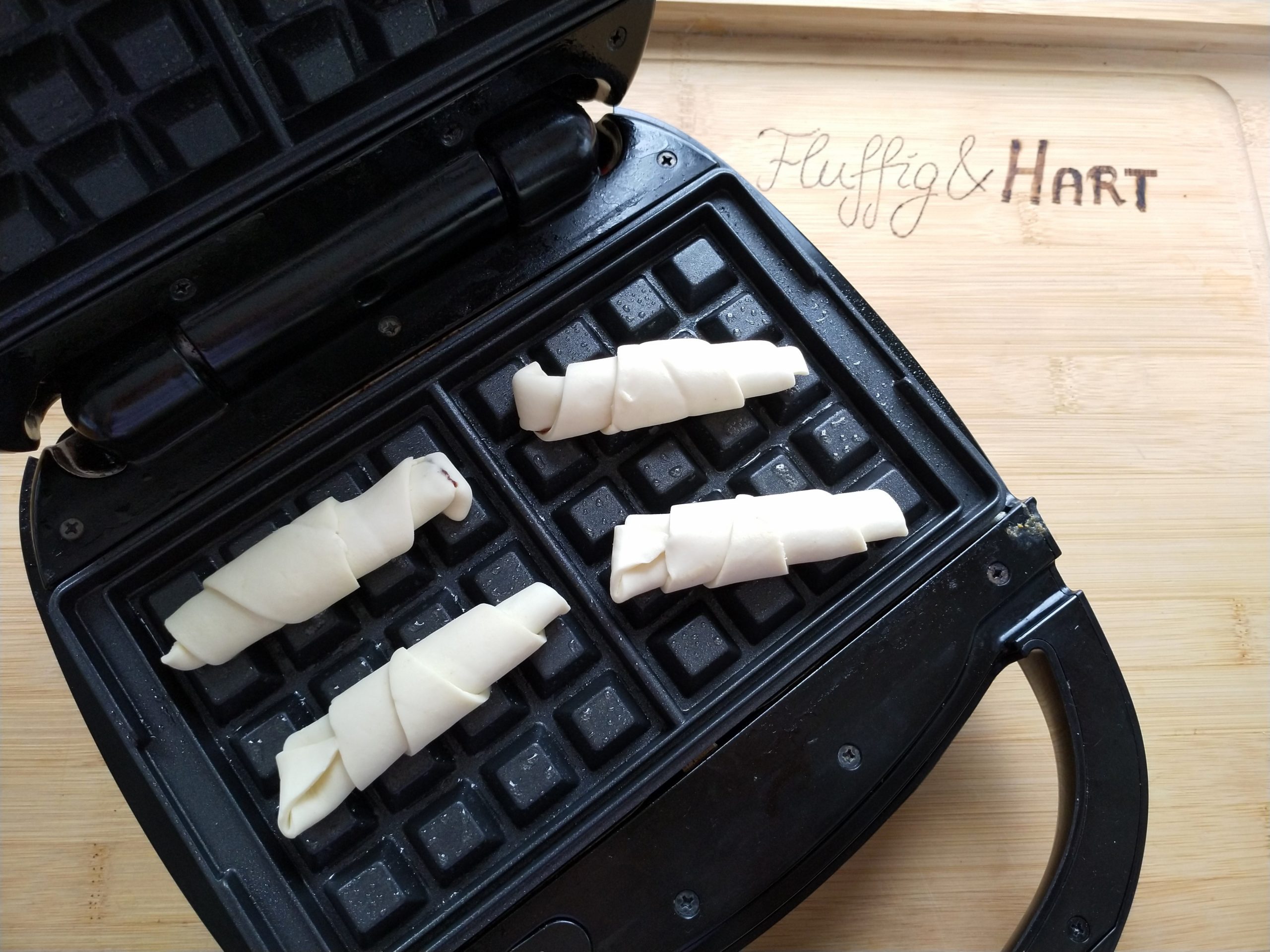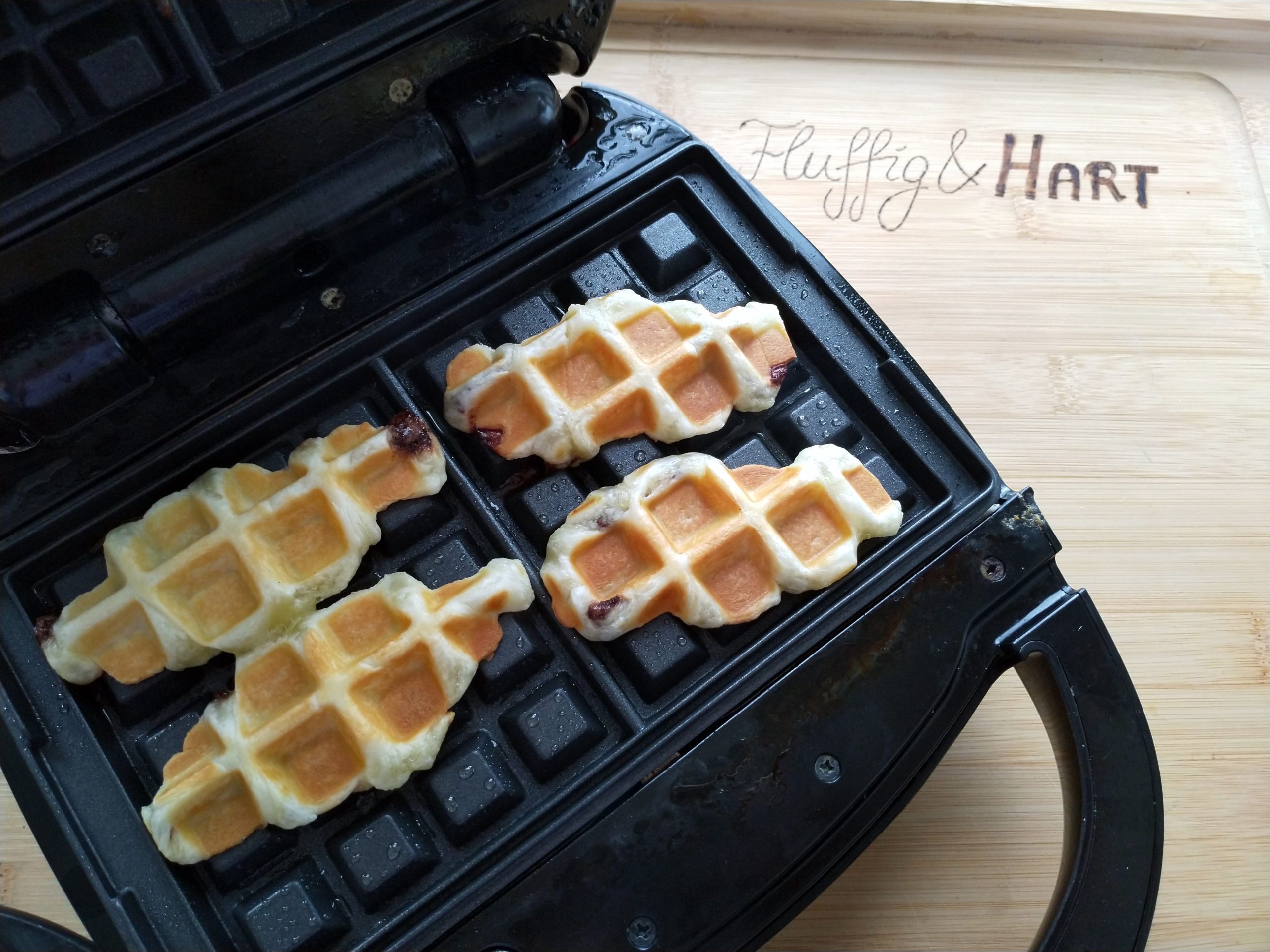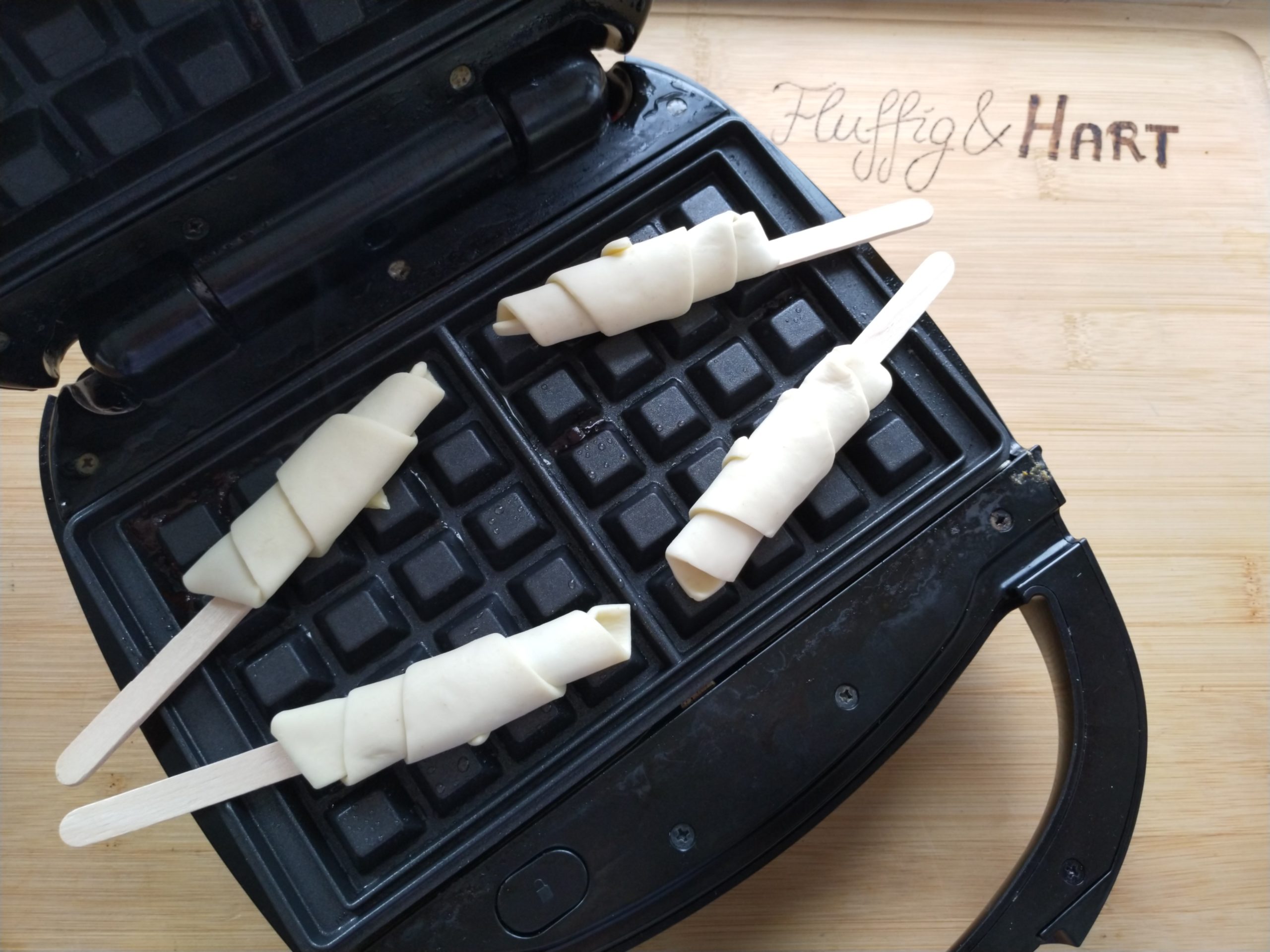 Das Waffeleisen vorheizen und einfetten. Jeweils zwei Croffles auf jede Seite legen. Schräg hat es ein schöneres Muster ergeben als gerade. Die Holzspatel sollten in den Aussparungen auf der Seite platziert werden.