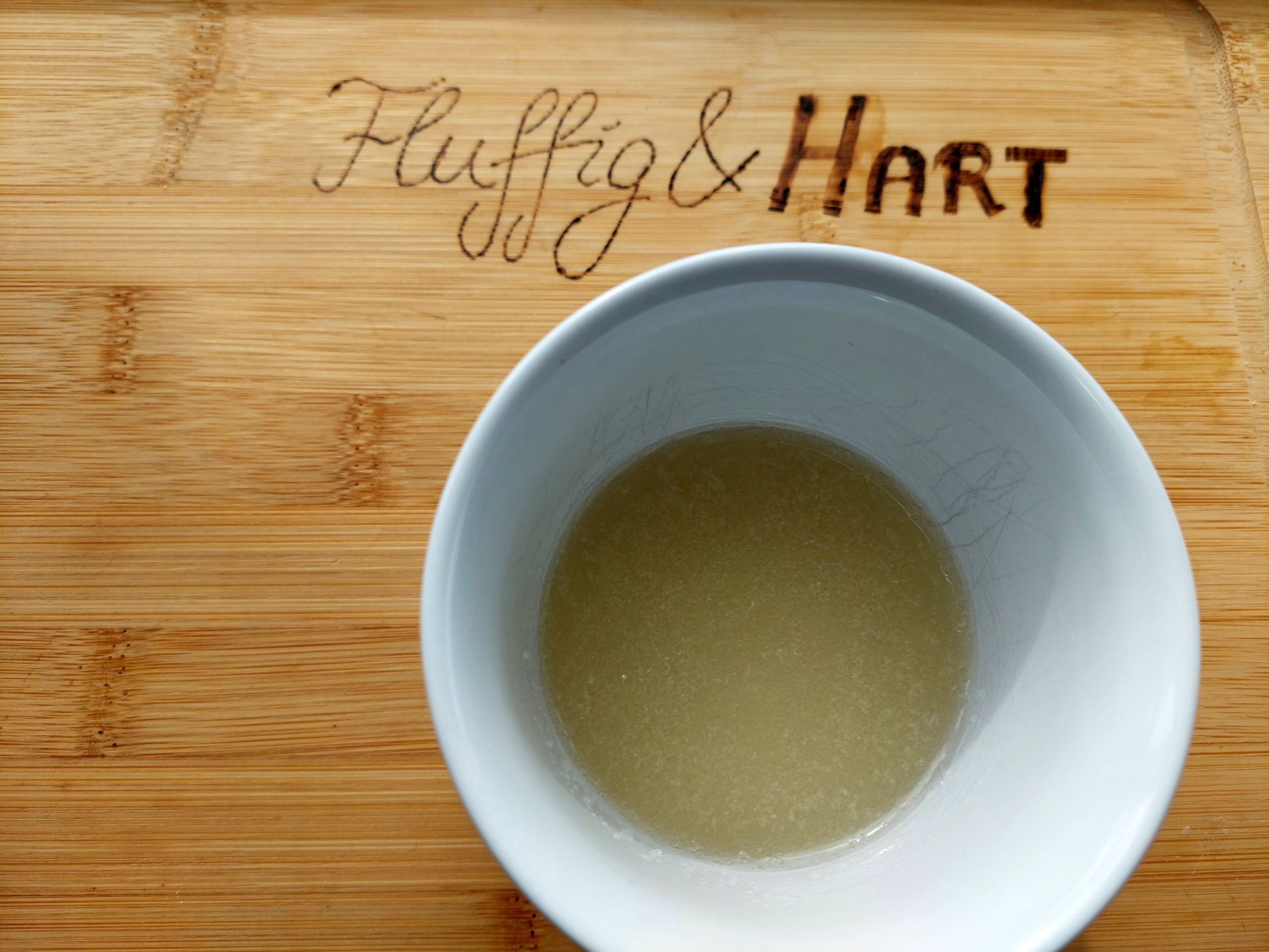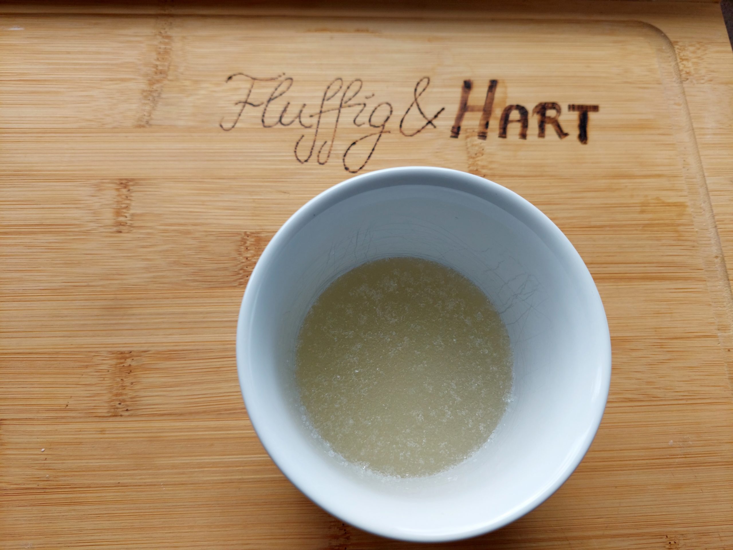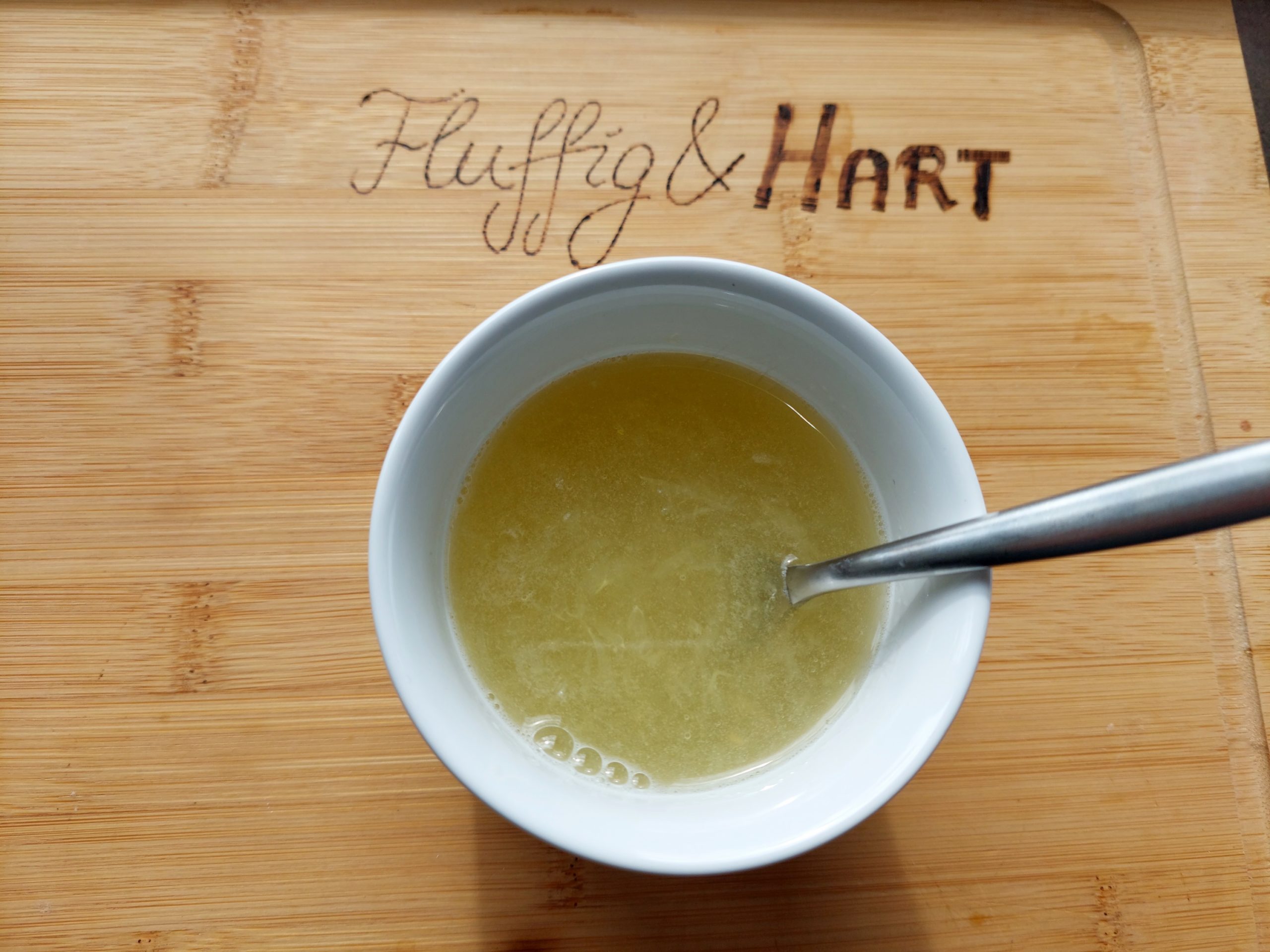 Die Gelatine 20s in die Mikrowelle geben und auflösen. Einige EL Zitronensaft dazugeben und verrühren. Anschließend die Eigelbe mit dem Zucker schaumig rühren. Die Gelatine-Mischung sowie den restlichen Zitronensaft dazugeben und gut verrühren.