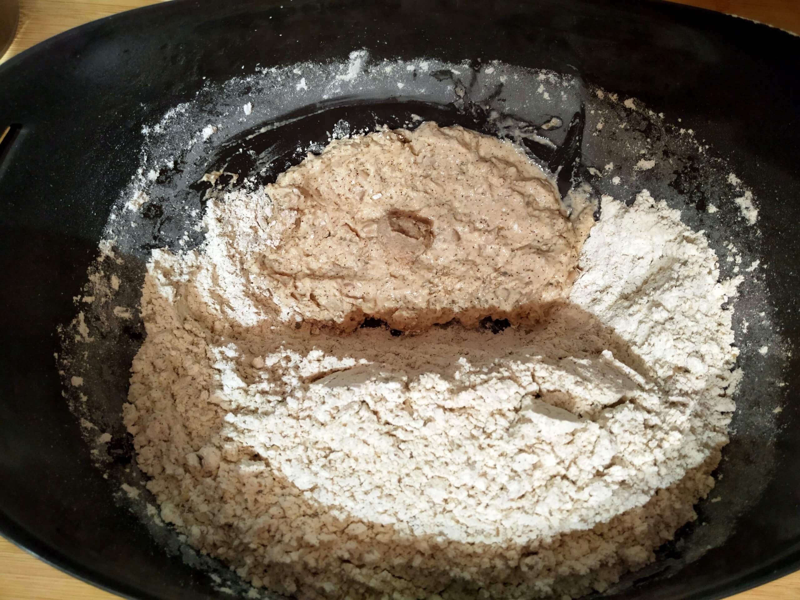 Einen kleinen Teil der Mischung mit etwas Wasser anrühren. Den Sauerteig dazugeben und miteinander vermischen. Dann erst das restliche Wasser mit der Mehlmischung einarbeiten. Es sollte ein fester Teig entstehen. Zu einer Kugel formen und abgedeckt 24h an einem warmen Ort gehen lassen.