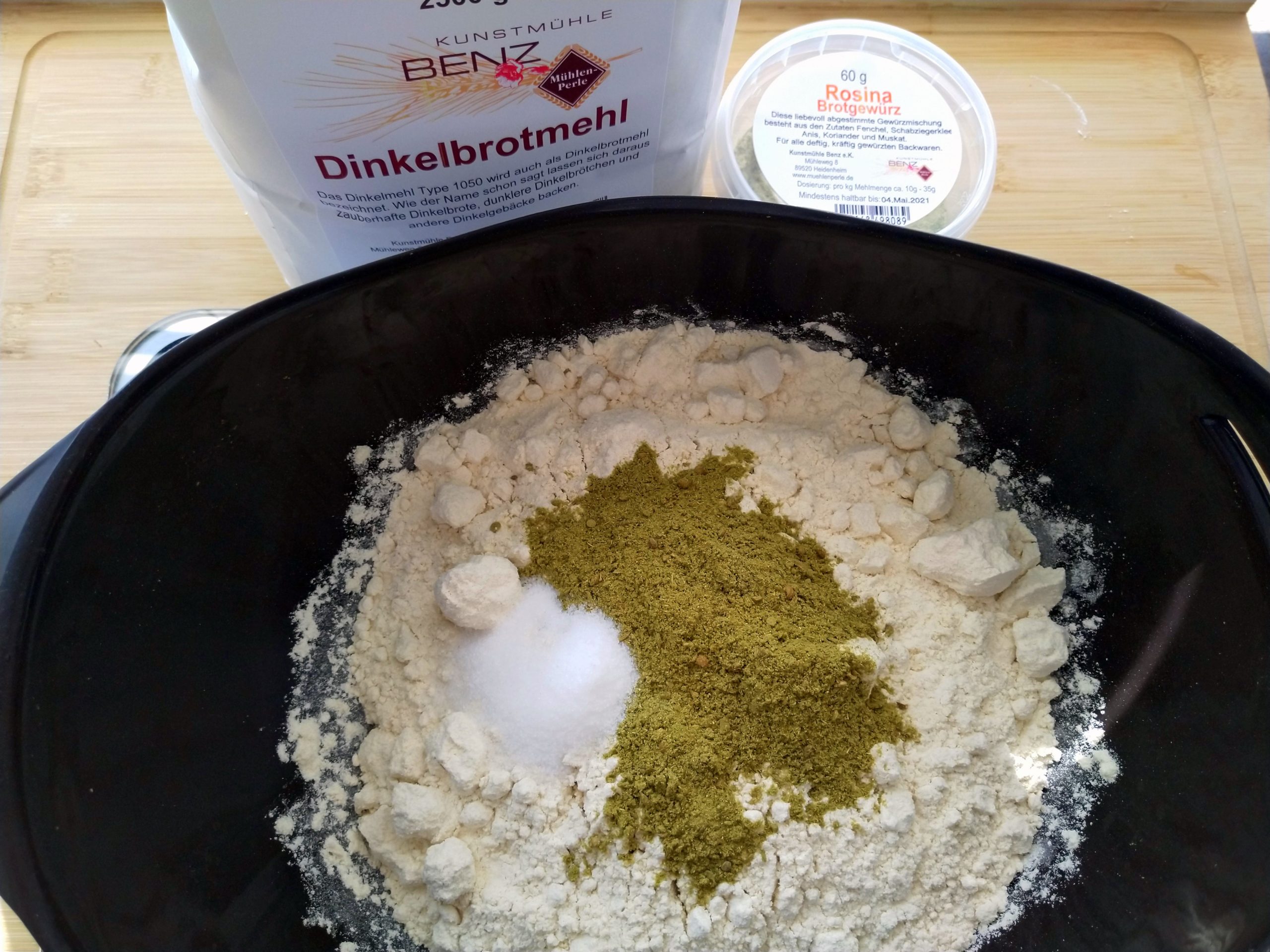 1. Mehl, Salz und Brotgewürz in der Schüssel vorlegen und vermischen.