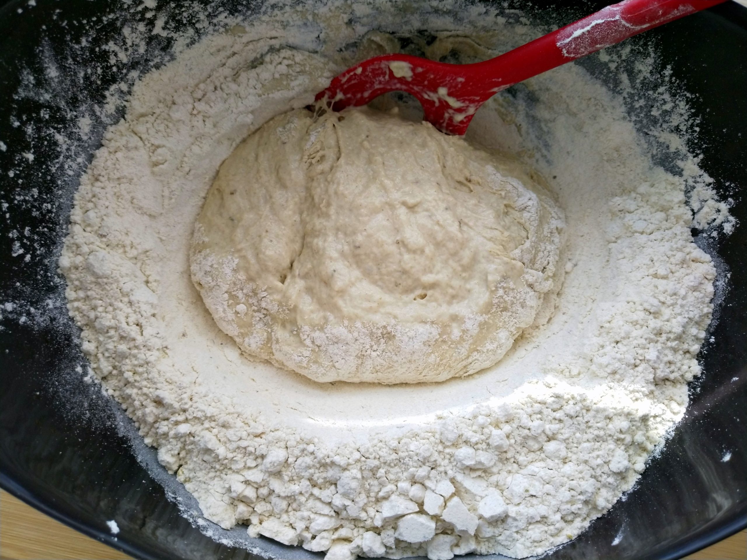 2. Mit ca. einem Drittel des Wassers und einem Teil der Mehlmischung einen breiigen Teig anrühren. Den frischen Sauerteig dazugeben und mit dem Brei vermischen. Anschließend das restliche Wasser und die übrige Mehlmischung einarbeiten.