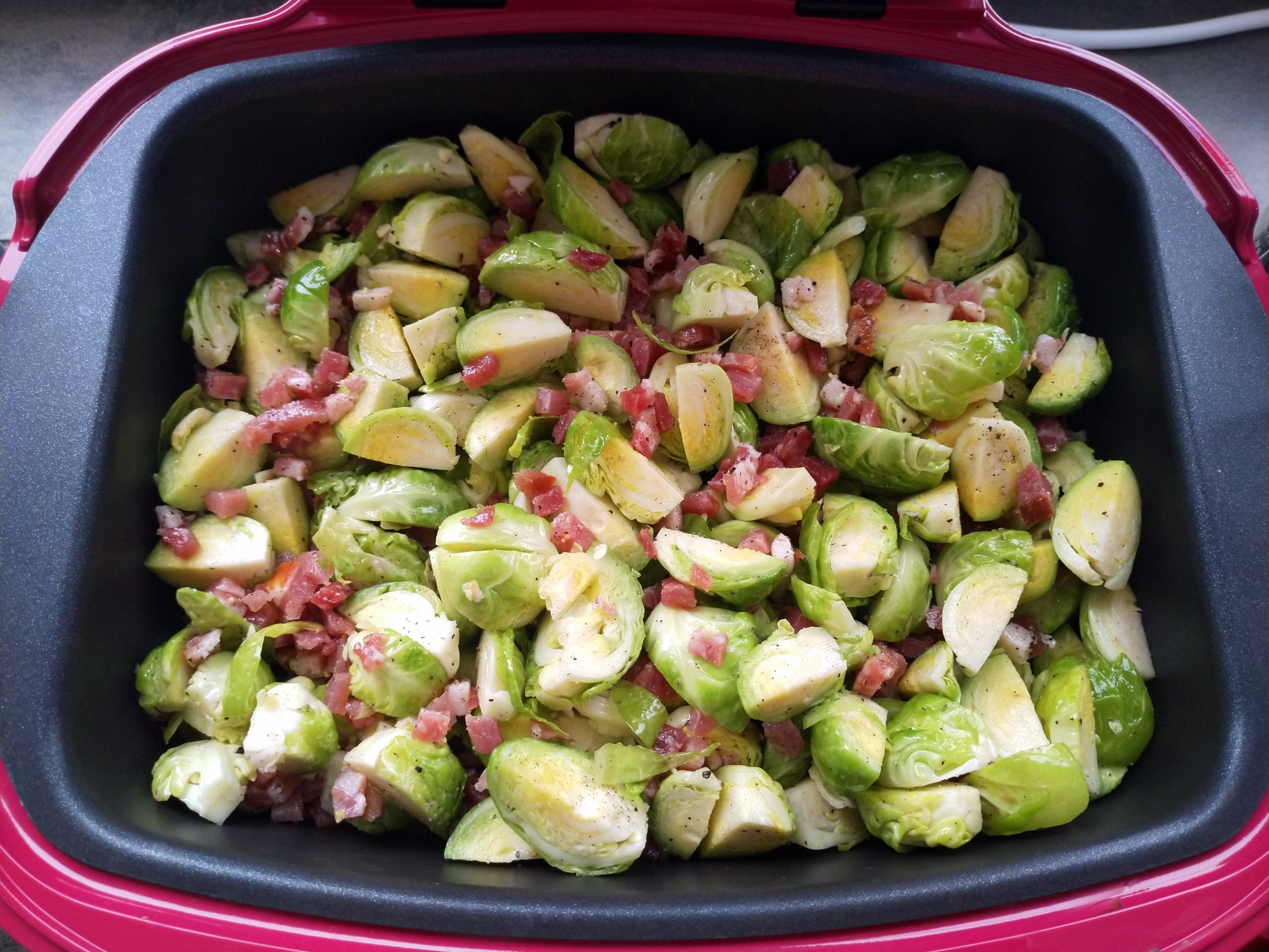 Im vorgeheizten Backofen bei 200°C ca. 30 min garen, zwischendurch einmal durchrühren. Wer den Rosenkohl gerne etwas angeröstet mag, der kann in den letzten 10 min auf Umluft schalten.