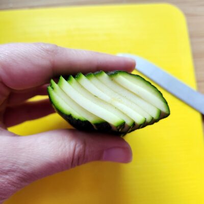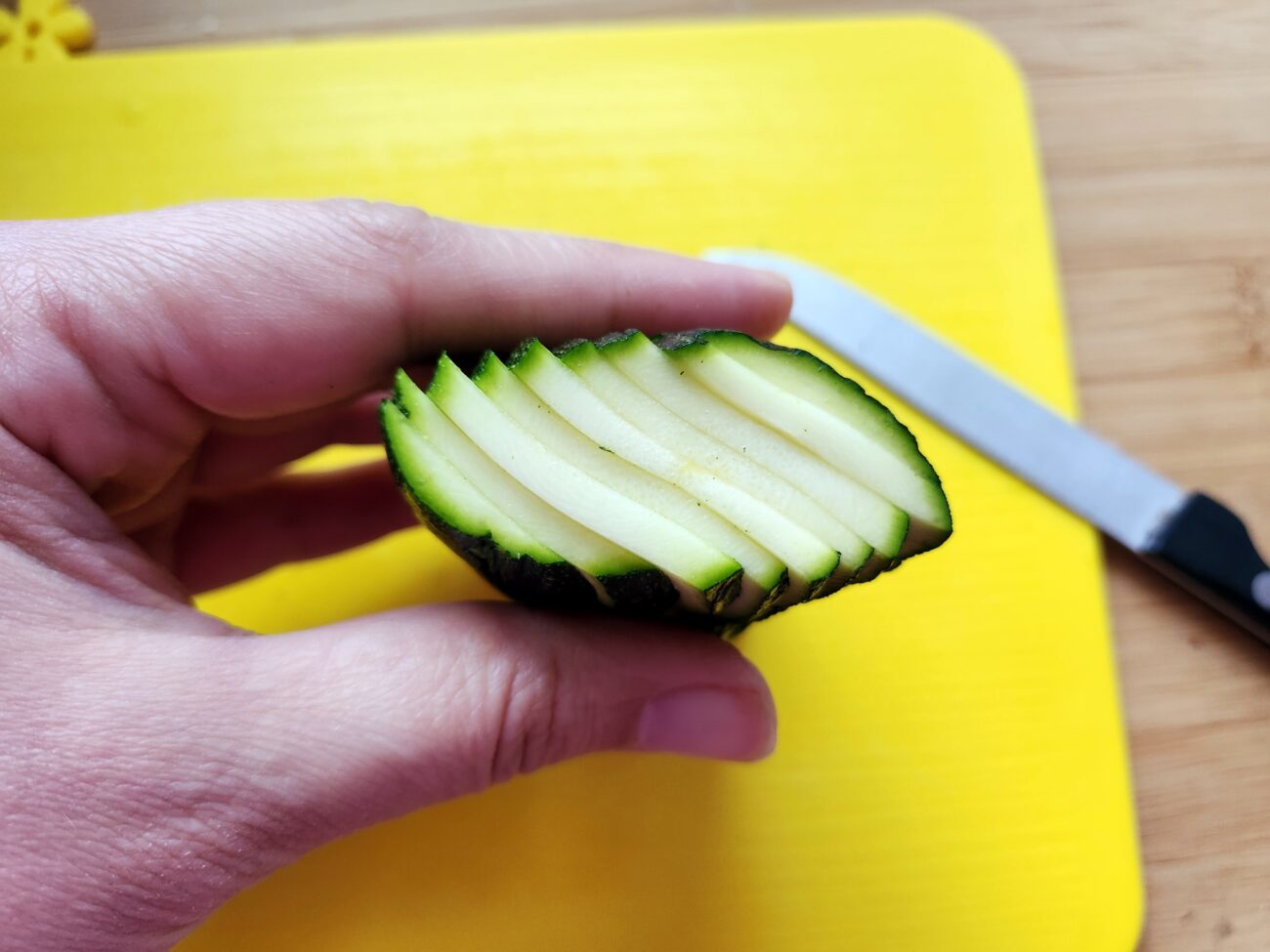 Die Zucchini erst längs in dünne Scheiben schneiden. In der Mitte nochmal längs teilen, dann in kleine Stifte schneiden. In ein Sieb geben und mit etwas Salz durchmischen. 10 min stehen lassen.