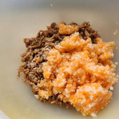 Das geschredderte Gemüse zum Fleisch geben (darf ruhig noch warm sein). Die Zucchini stark ausdrücken, so dass überschüssige Flüssigkeit abfließt und dann alles miteinander mit 1 EL Sesamöl gut durchrühren.