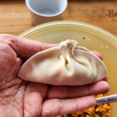 Ein Gefäß mit etwas kaltem Wasser füllen. Eine Teigplatte (Ø12cm) auf die Handfläche nehmen und den Rand mit Wasser bestreichen. Etwas Füllung in die Mitte geben und den Teig mittig zusammendrücken. Das Wasser funktioniert hierbei als Kleber.