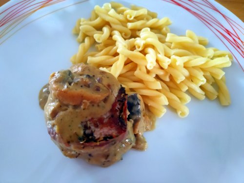 Die Hähnchenbrust wird bei diesem Rezept mit einem Salbeiblatt gefüllt und dann mit Speck umwickelt. Der Salbei gibt ein dezentes Aroma, der Speckmantel sorgt für das Salz, so dass keine weiteren Gewürze benötigt werden.