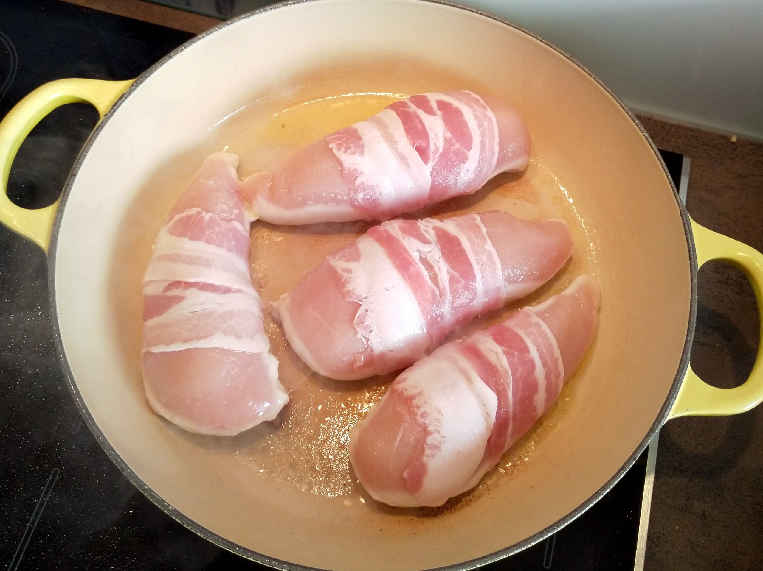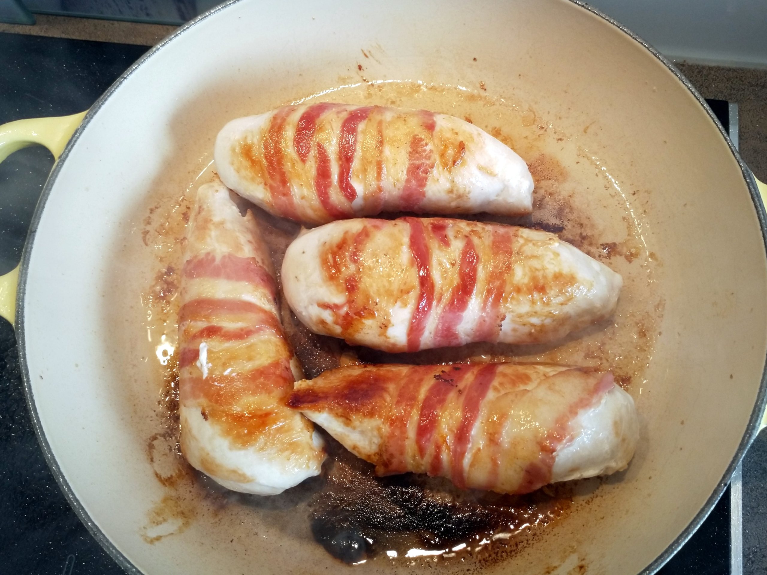 Man kann auf diese Weise mehrere Brüste hintereinander erst mal in der Pfanne anbraten und dann alle zusammen in den Ofen schieben.