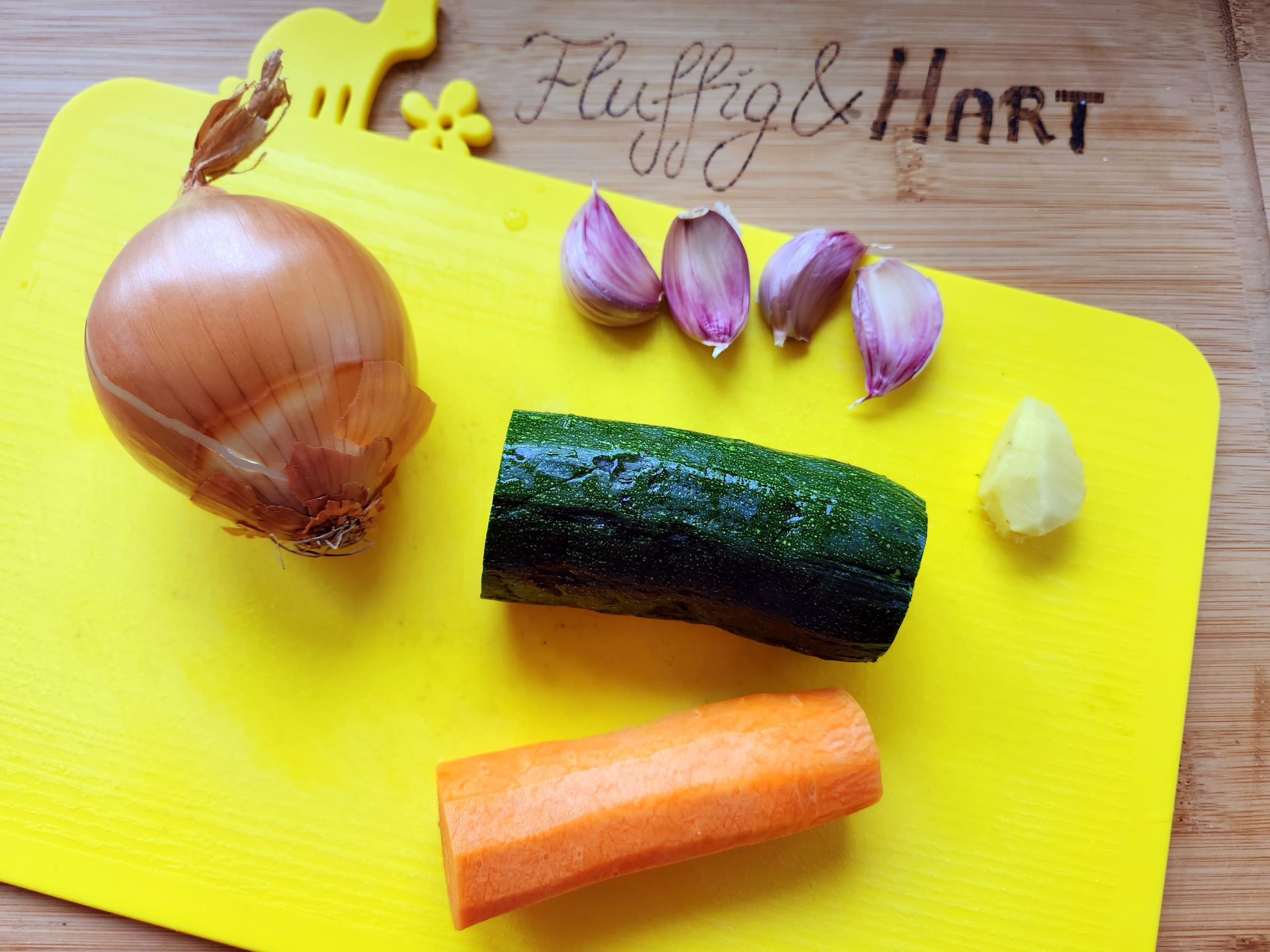 1. Das Gemüse waschen und möglichst klein schneiden. Zwiebeln, Karotte, Knoblauch und Ingwer gebe ich gerne in den Mixer (NICHT die Zucchini), da geht es am schnellsten. Die Gemüsemenge variiert je nach Geschmack, man kann auch die Karotte weglassen und nur Zucchini verwenden.