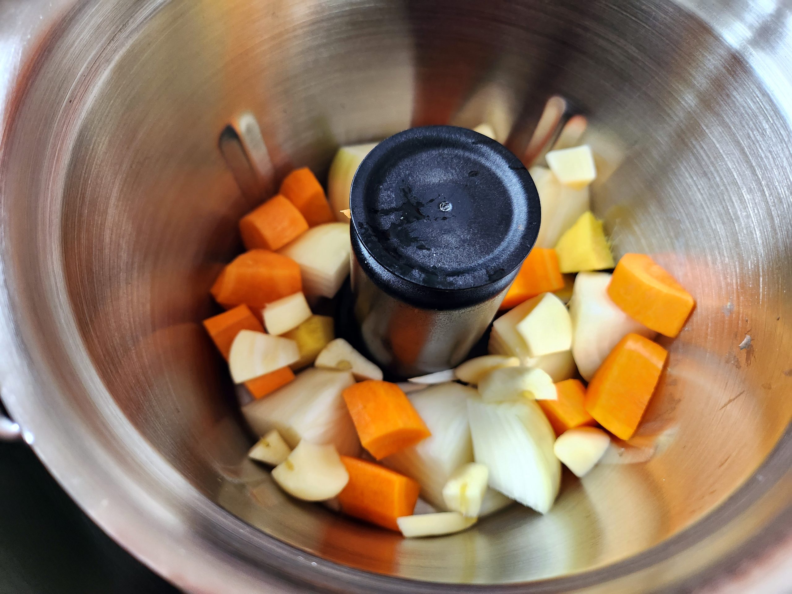 Bei Verwendung der Prep&Cook die Minischüssel einsetzen. Zwiebeln, Karotte, Knoblauch und Ingwer grob zerkleinern und auf Stufe 10 ca. 1 min schreddern, dabei vom Rand mehrmals runterschieben.
