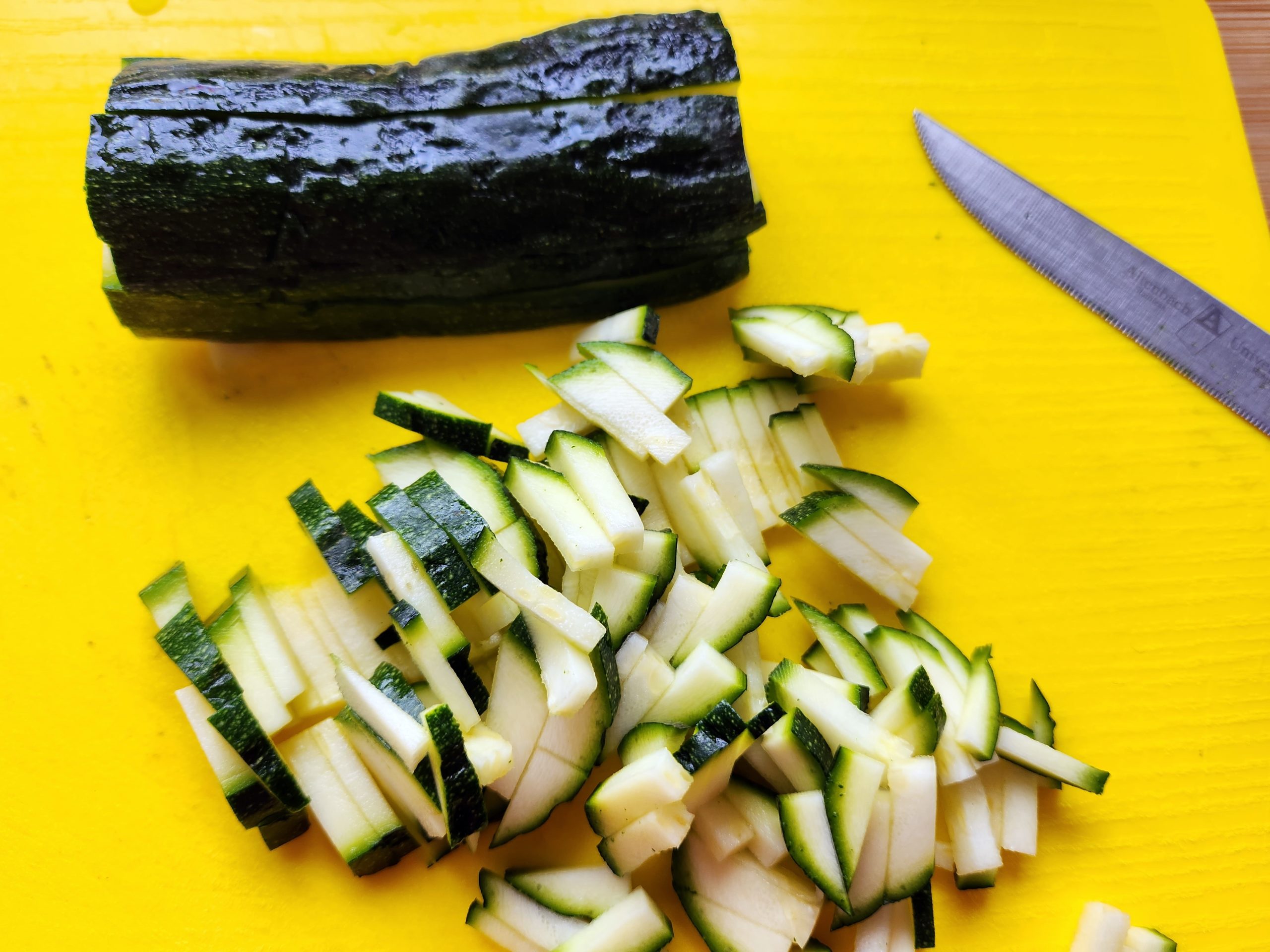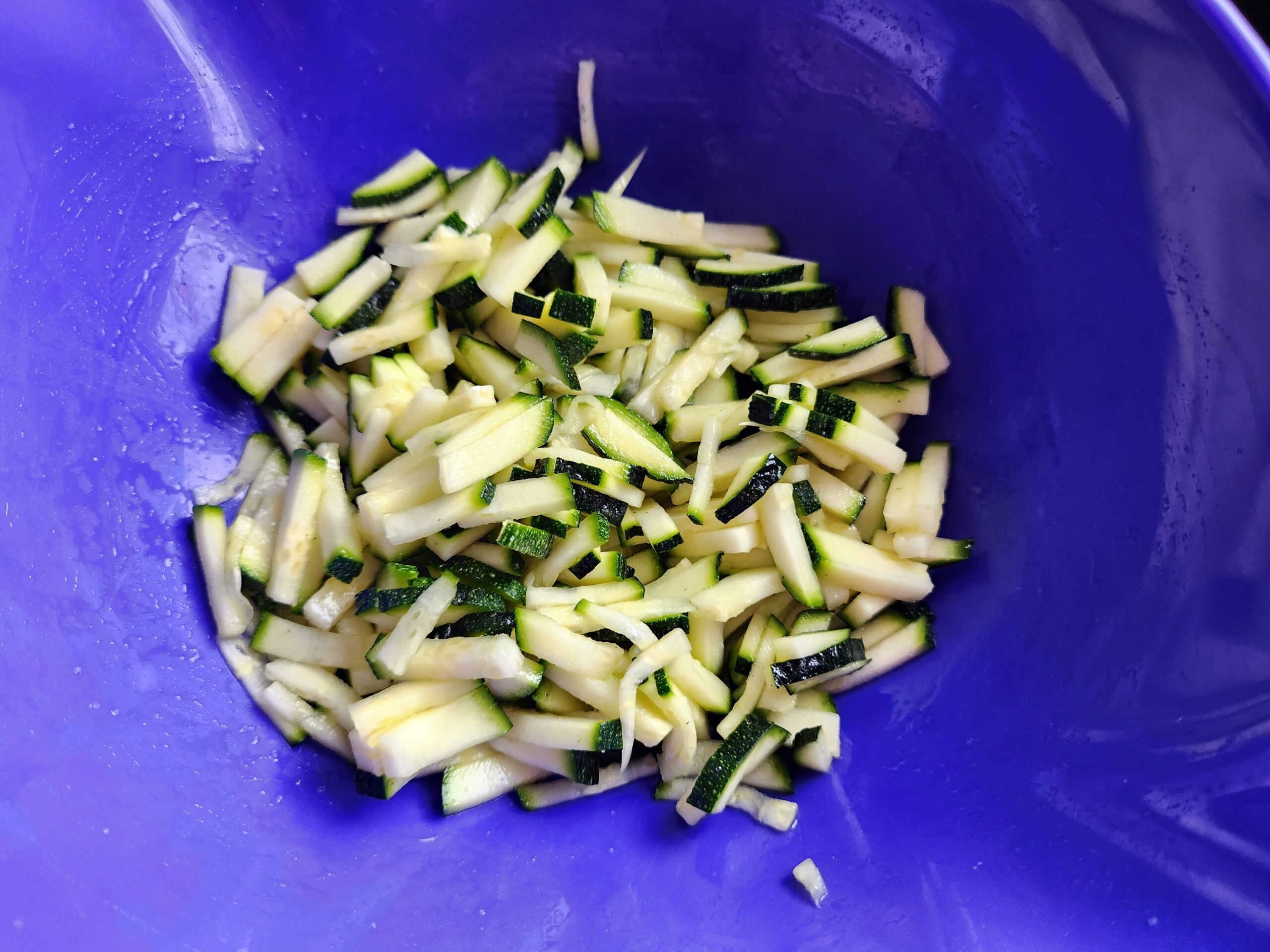 2. Die Zucchini erst längs in dünne Scheiben schneiden. In der Mitte nochmal längs teilen, dann in kleine Stifte schneiden. In ein Sieb geben und mit etwas Salz durchmischen. 10min stehen lassen.