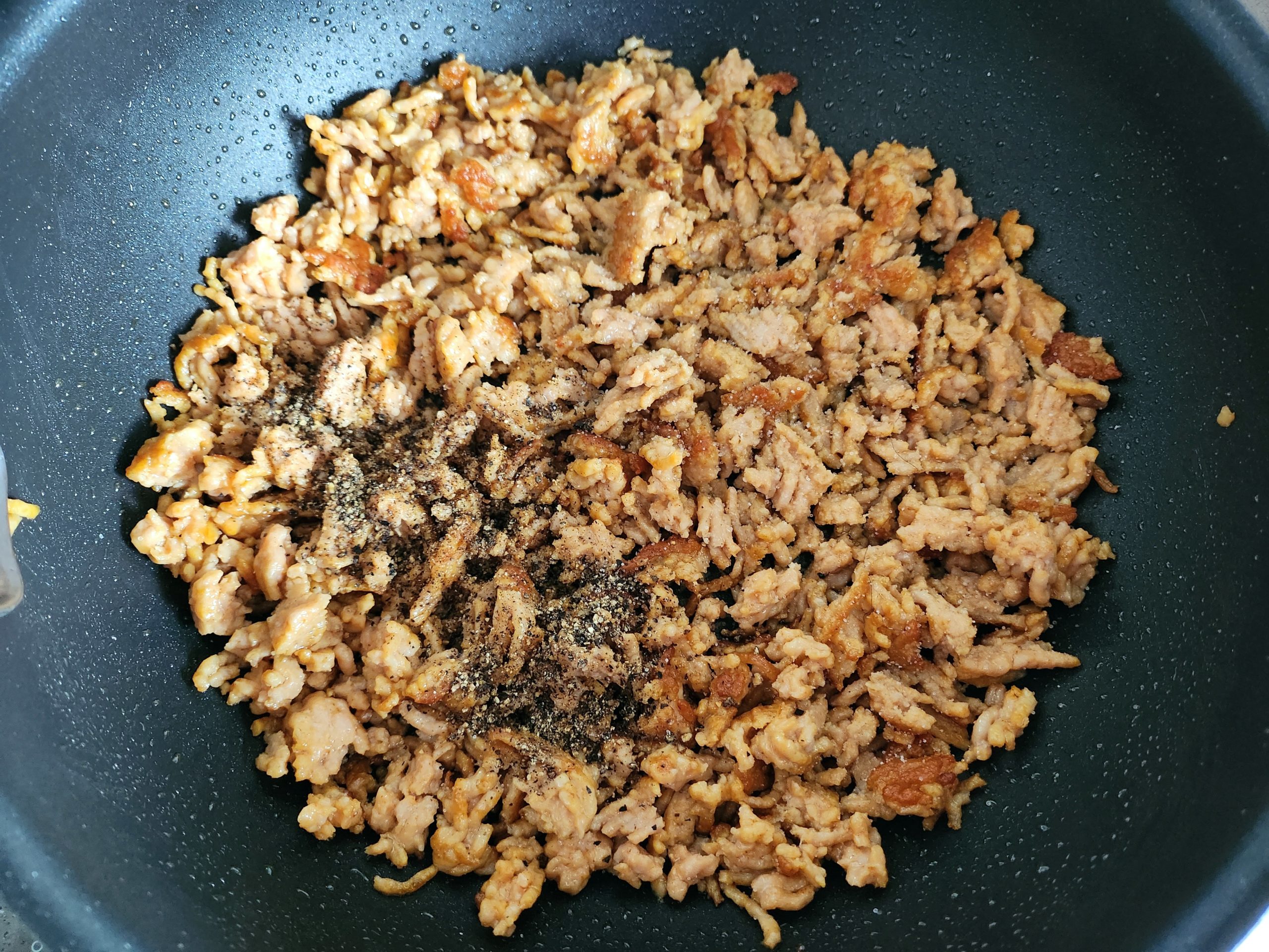 3. So lange die Zucchini "weint", das Hähnchenhackfleisch in 3 El Sesamöl anbraten. Mit Salz und Pfeffer würzen und in eine Schüssel geben.