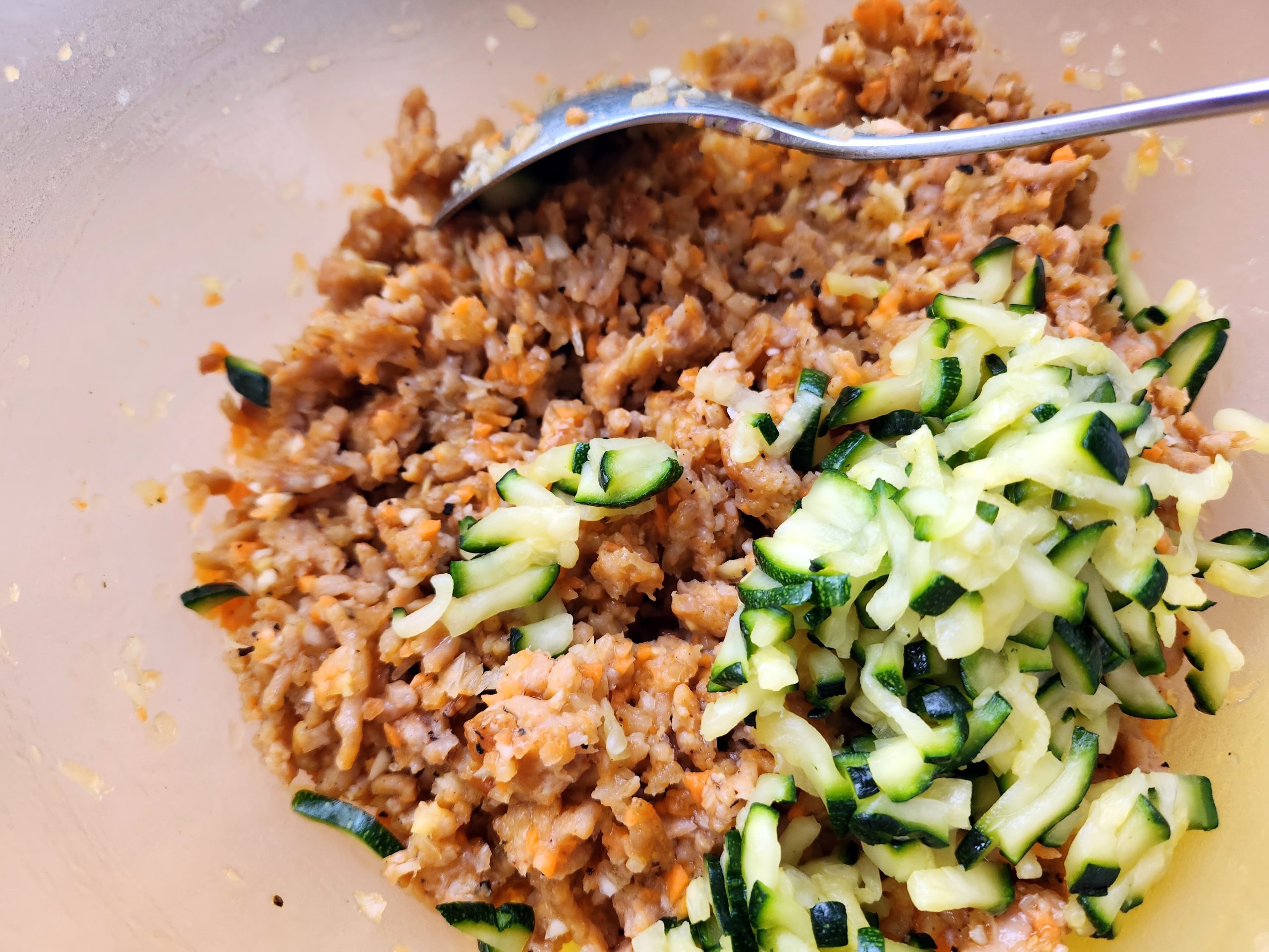 Das geschredderte Gemüse zum Fleisch geben (darf ruhig noch warm sein). Die Zucchini stark ausdrücken, so dass überschüssige Flüssigkeit abfließt und dann alles miteinander mit 1 EL Sesamöl gut durchrühren.