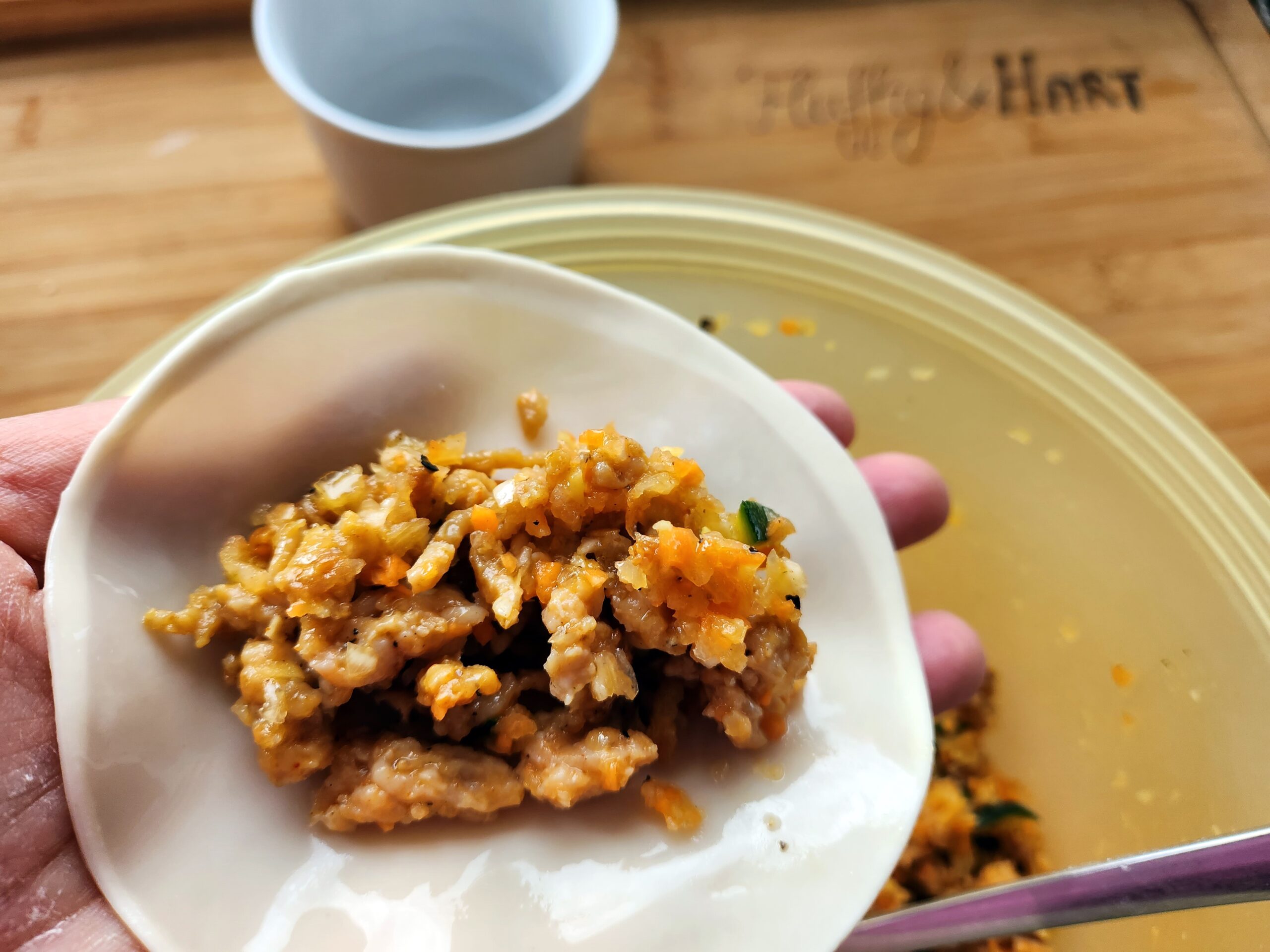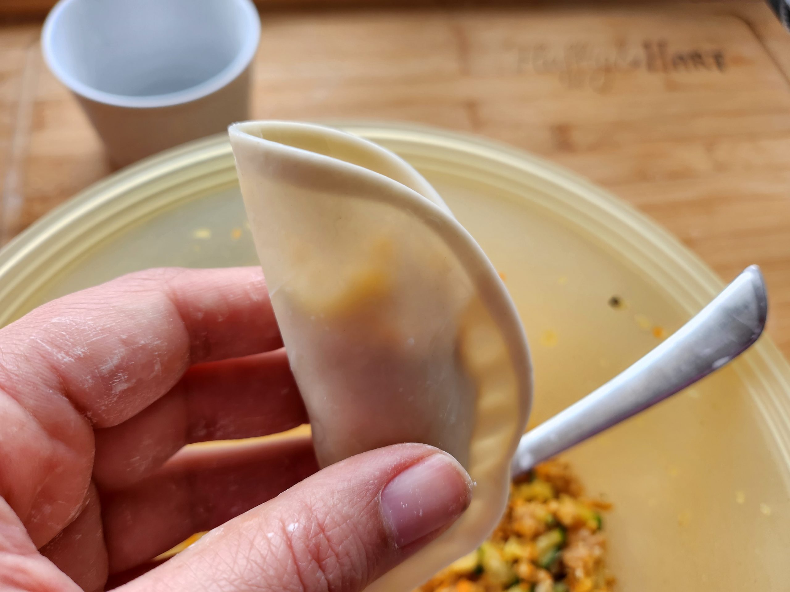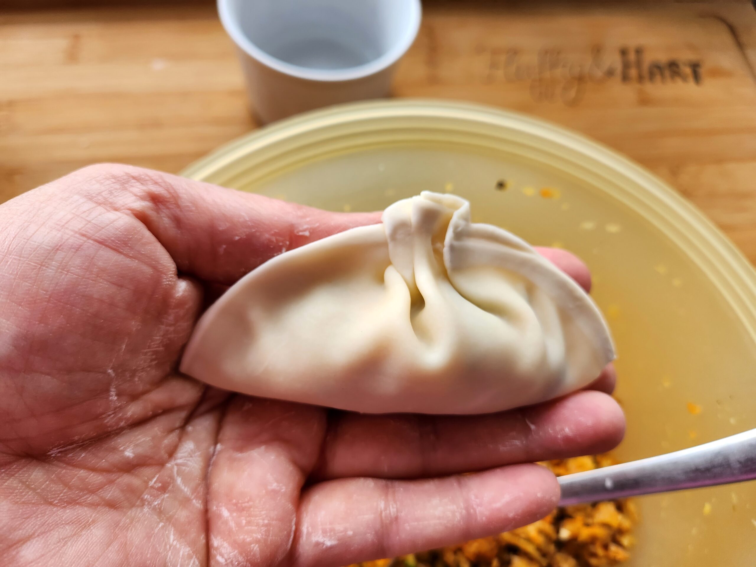 1. Ein Gefäß mit etwas kaltem Wasser füllen. Eine Teigplatte (Ø12cm) auf die Handfläche nehmen und den Rand mit Wasser bestreichen. Etwas Füllung in die Mitte geben und den Teig mittig zusammendrücken. Das Wasser funktioniert hierbei als Kleber.