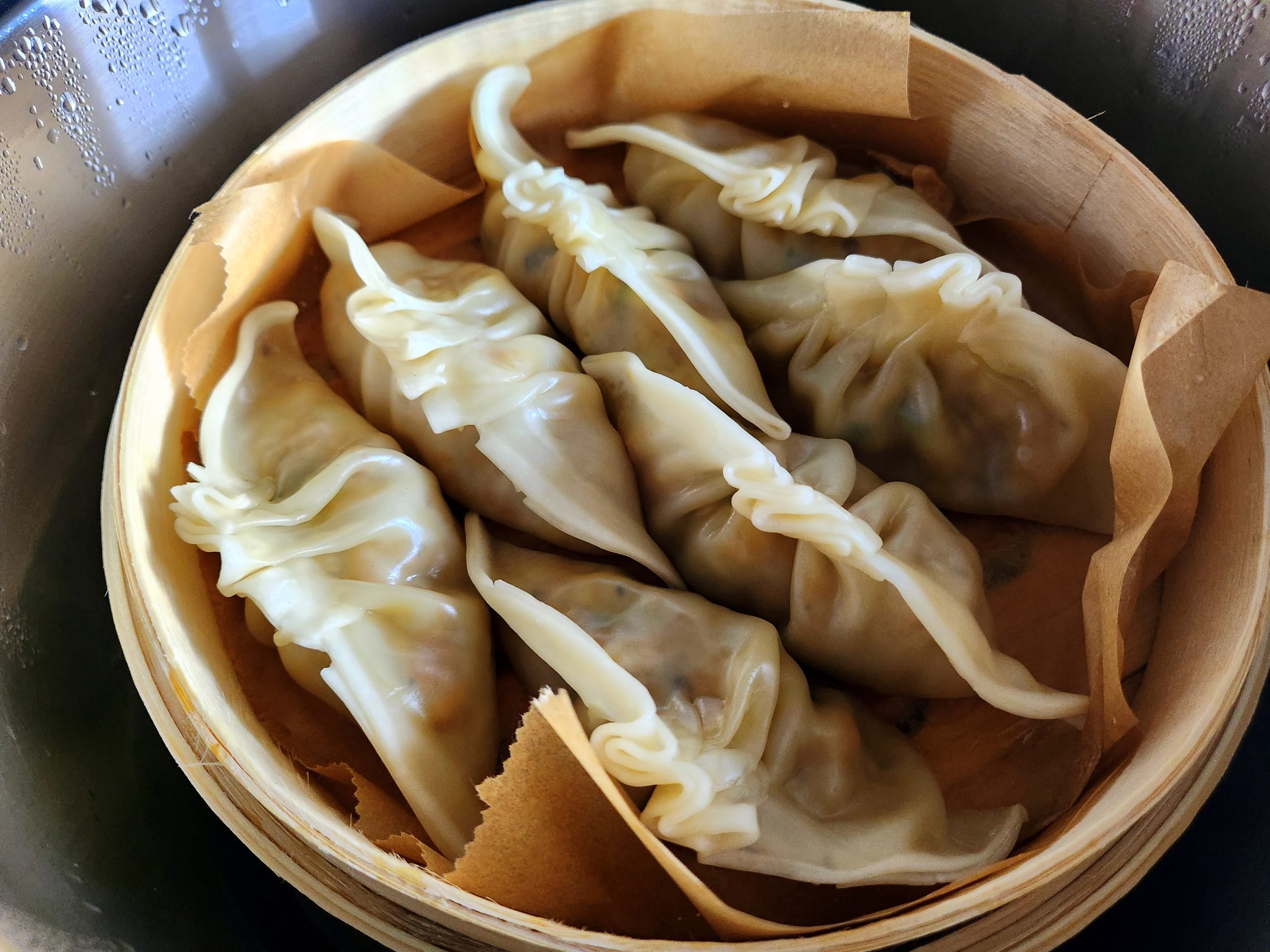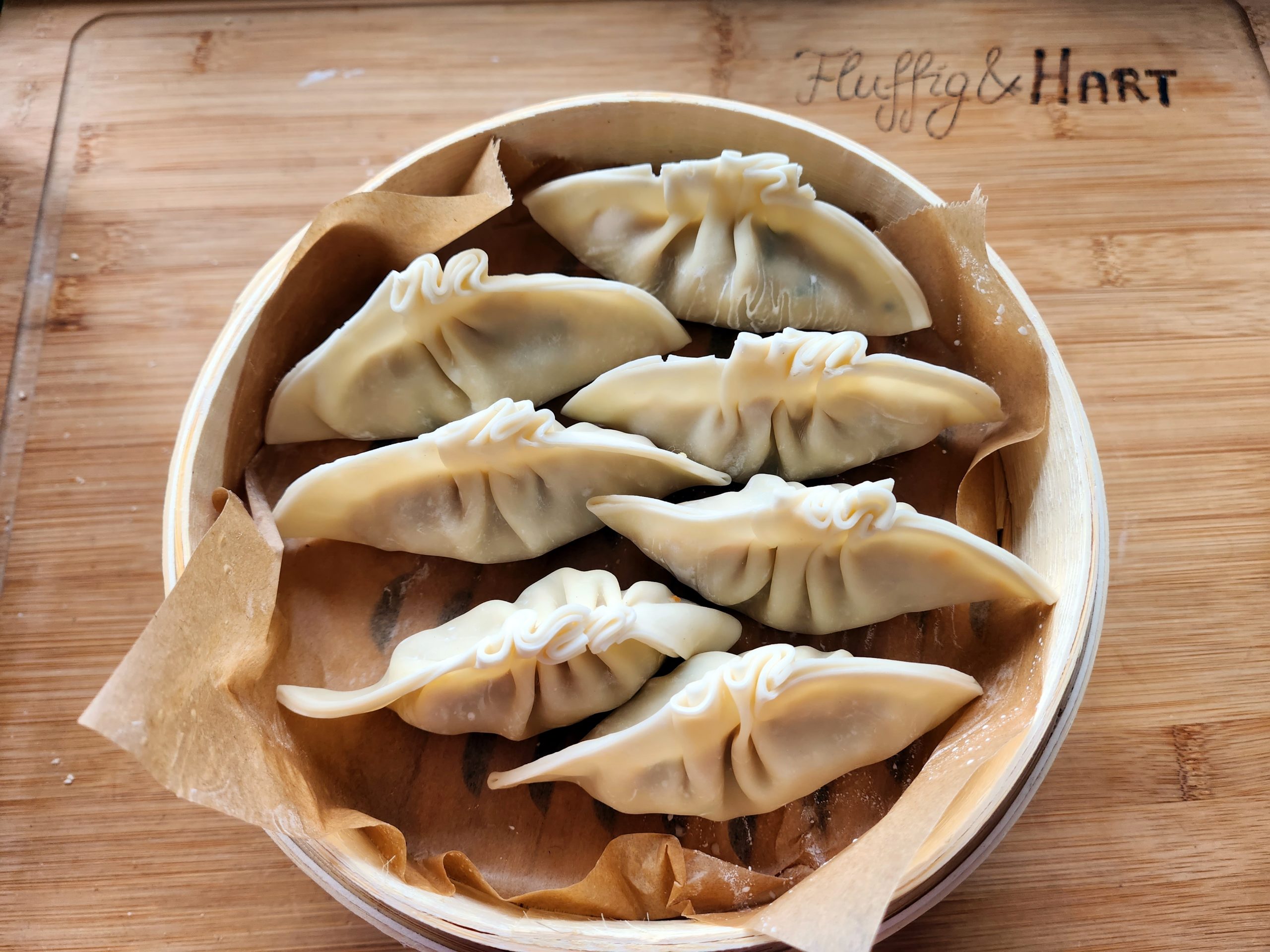 1. Einen Bambusdämpfer* mit Backpapier auslegen und die Mandu hineinsetzen.