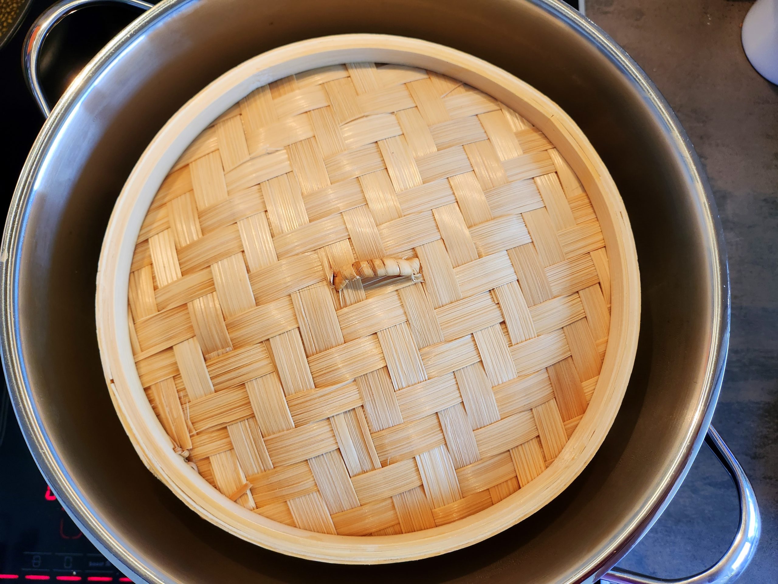 In einem ausreichend großen Topf soviel Wasser einfüllen, dass der Dämpfer ca. 2,5cm im Wasser steht. Deckel auf den Topf und das Ganze zum Kochen bringen. Auf niedrige Hitze schalten, dass das Wasser nur noch köchelt.