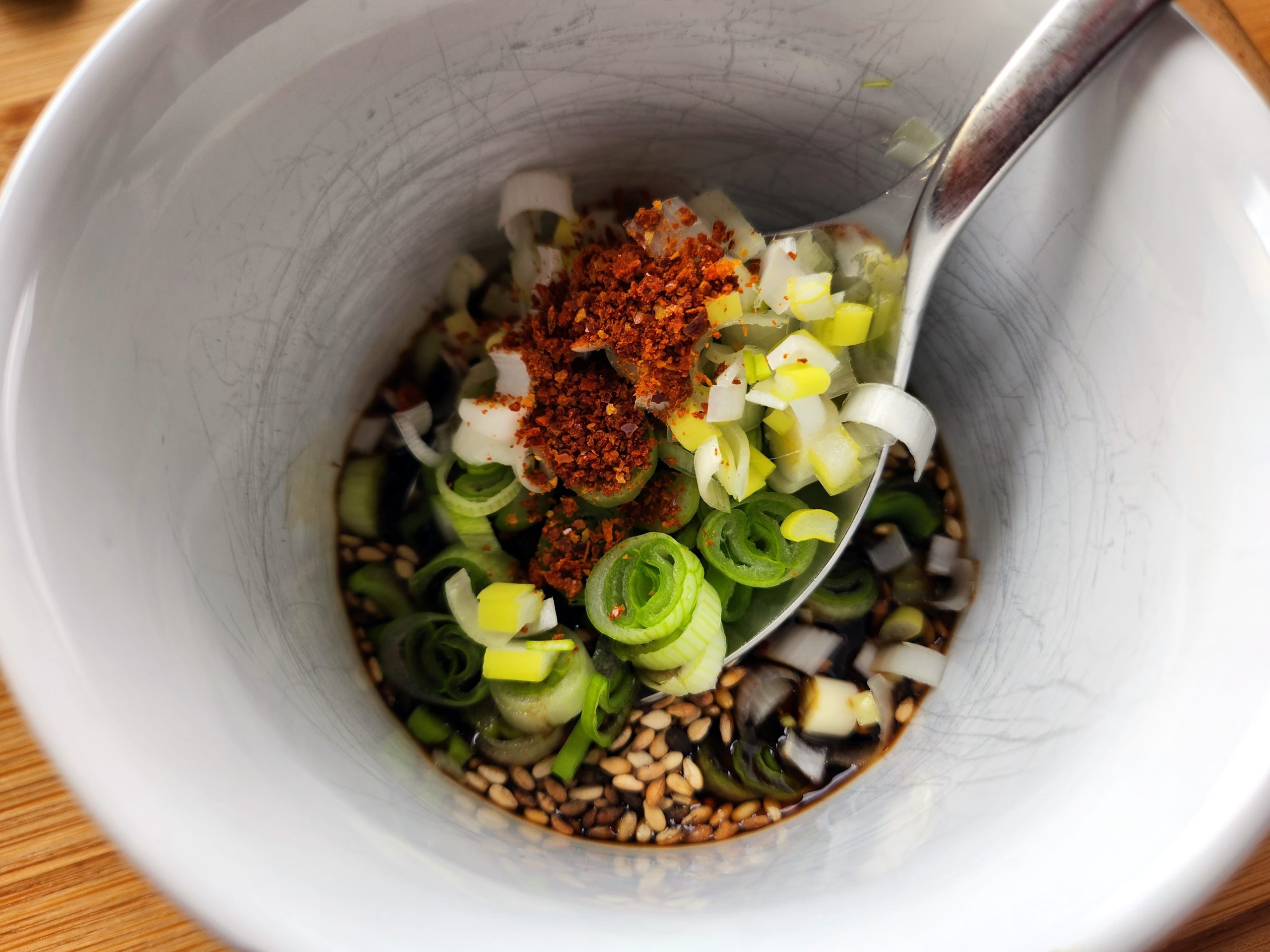 1. Die Frühlingszwiebel in feine Ringe schneiden und mit den restlichen Zutaten mischen.