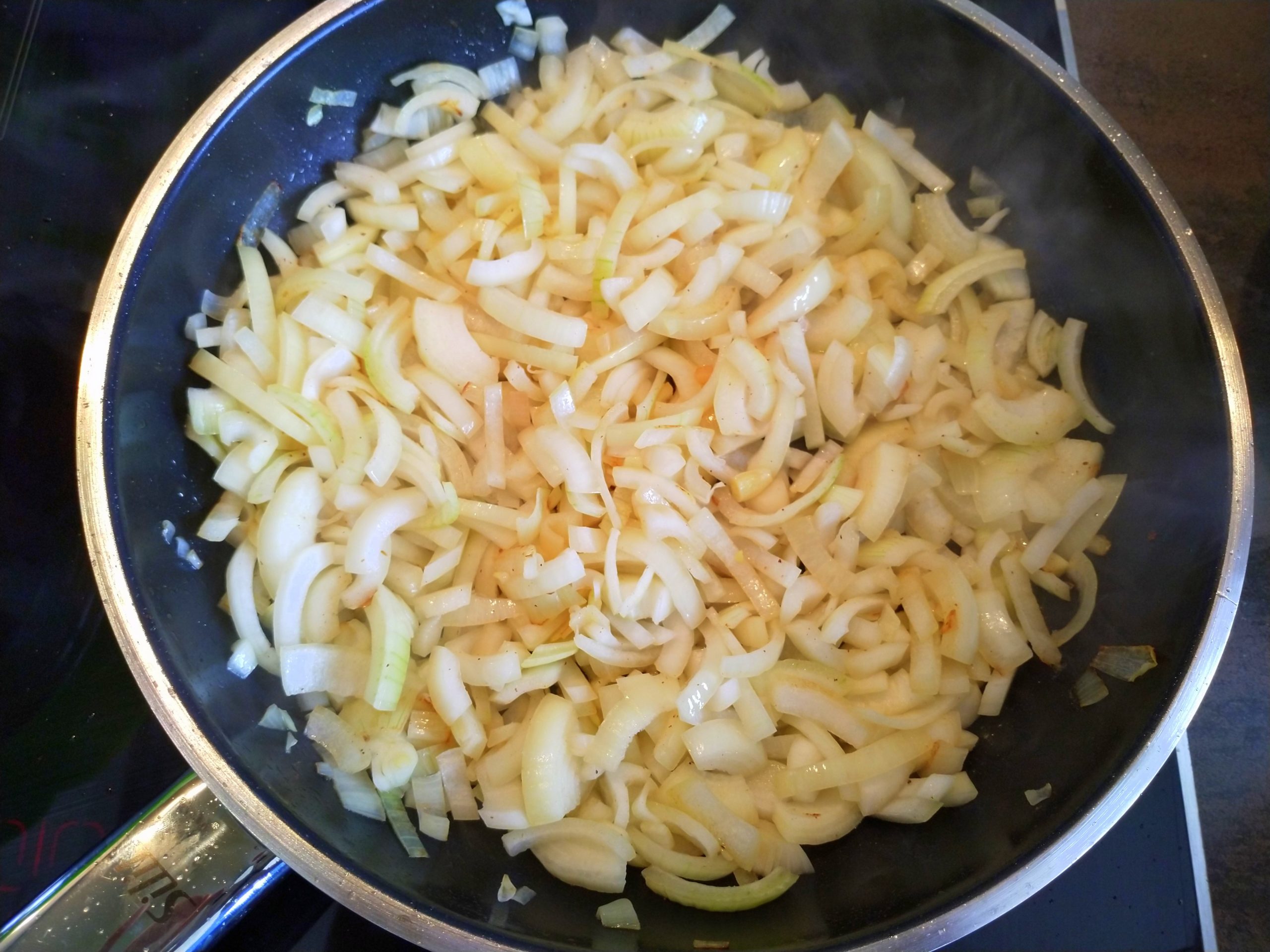 Währenddessen die Zwiebeln in Ringe oder breite Scheiben schneiden und mit der Butter in einer Pfanne schön anbraten, etwas salzen.