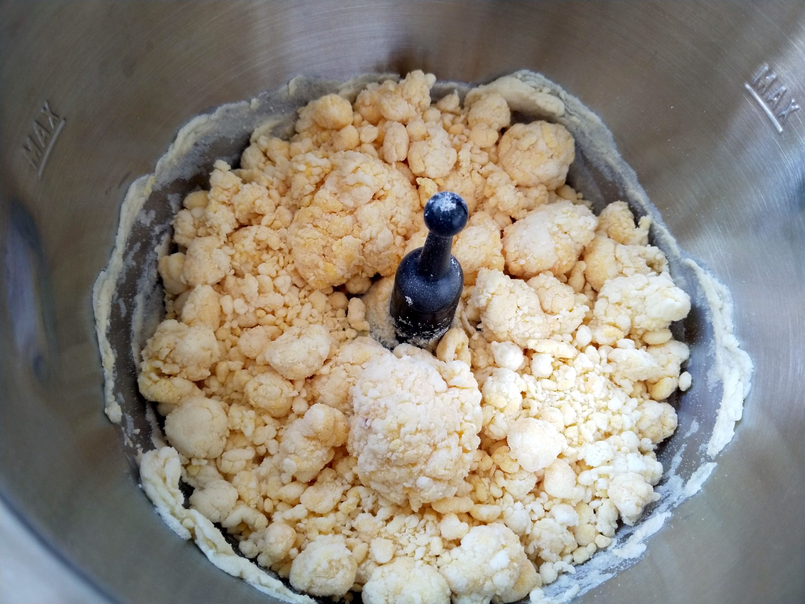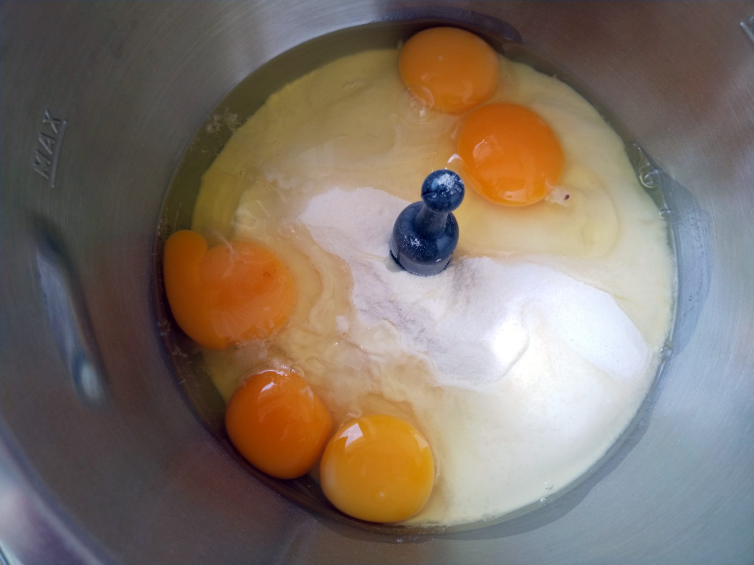 Mehl mit 2 TL Salz vermischen und die Eier dazugeben. Mit dem Rührgerät gut vermengen. Ca. 150-200 ml Wasser nach und nach zugeben, damit ein zäher Teig entsteht, der langsam von den Rührbesen runtertropft.