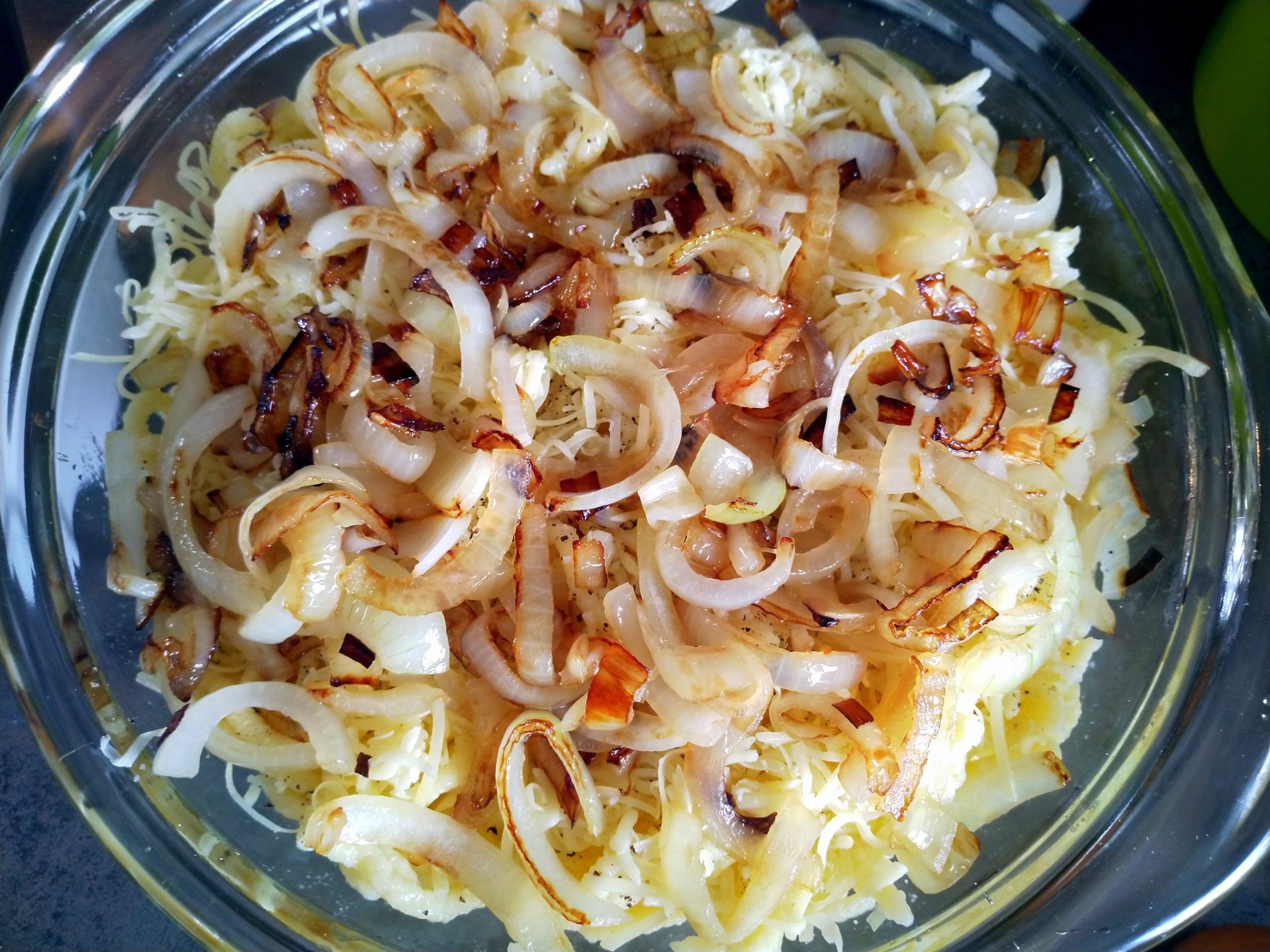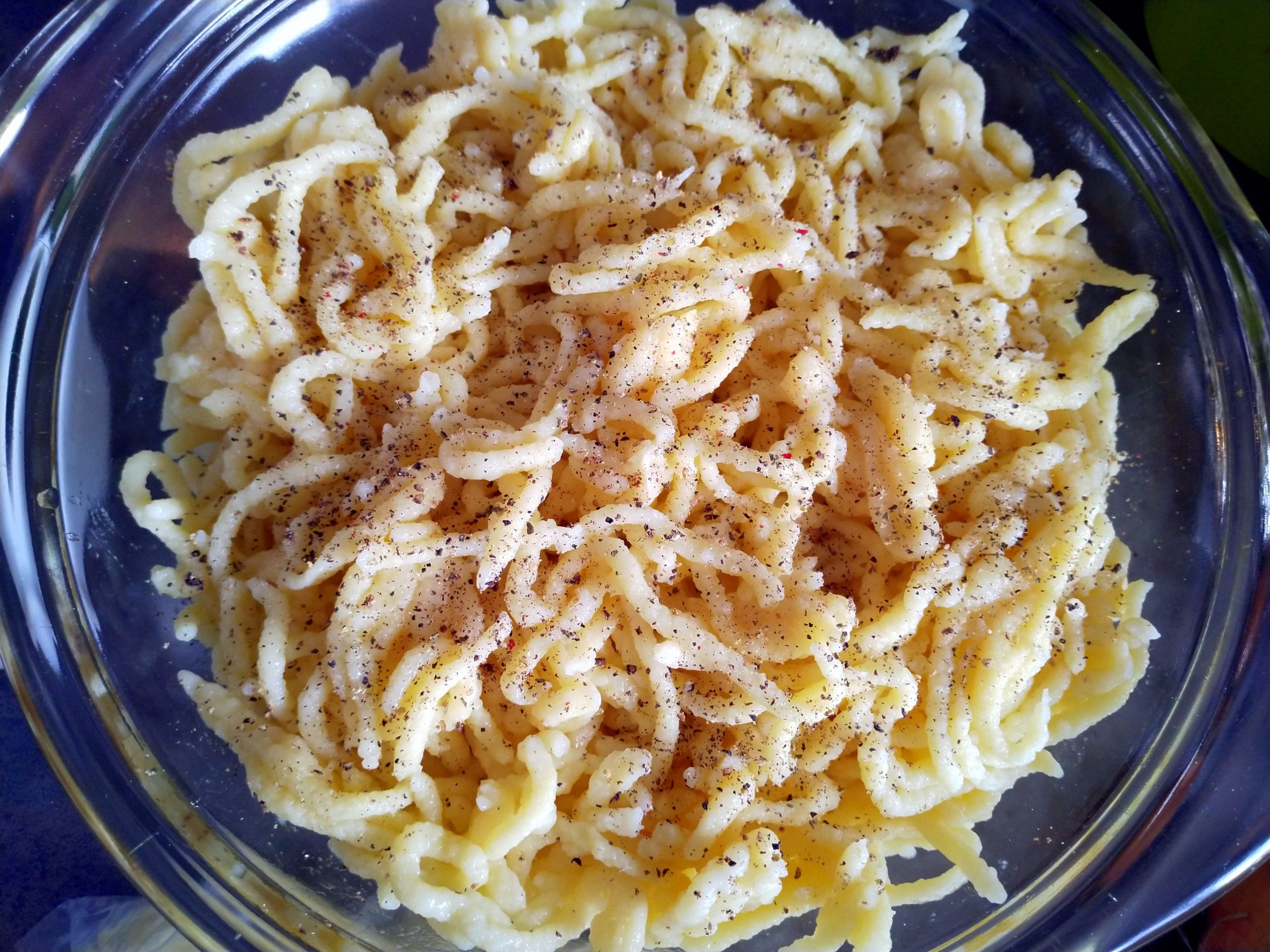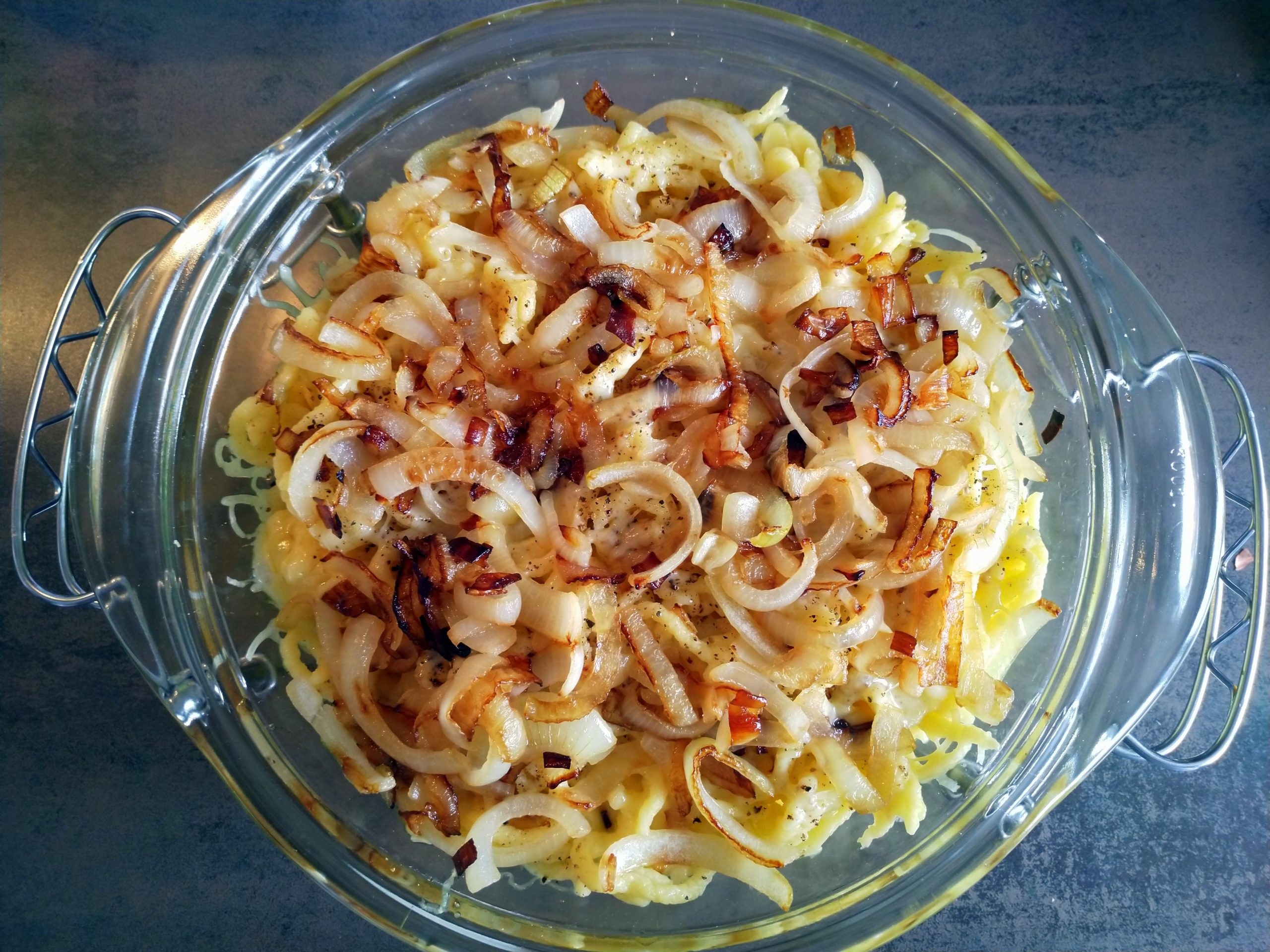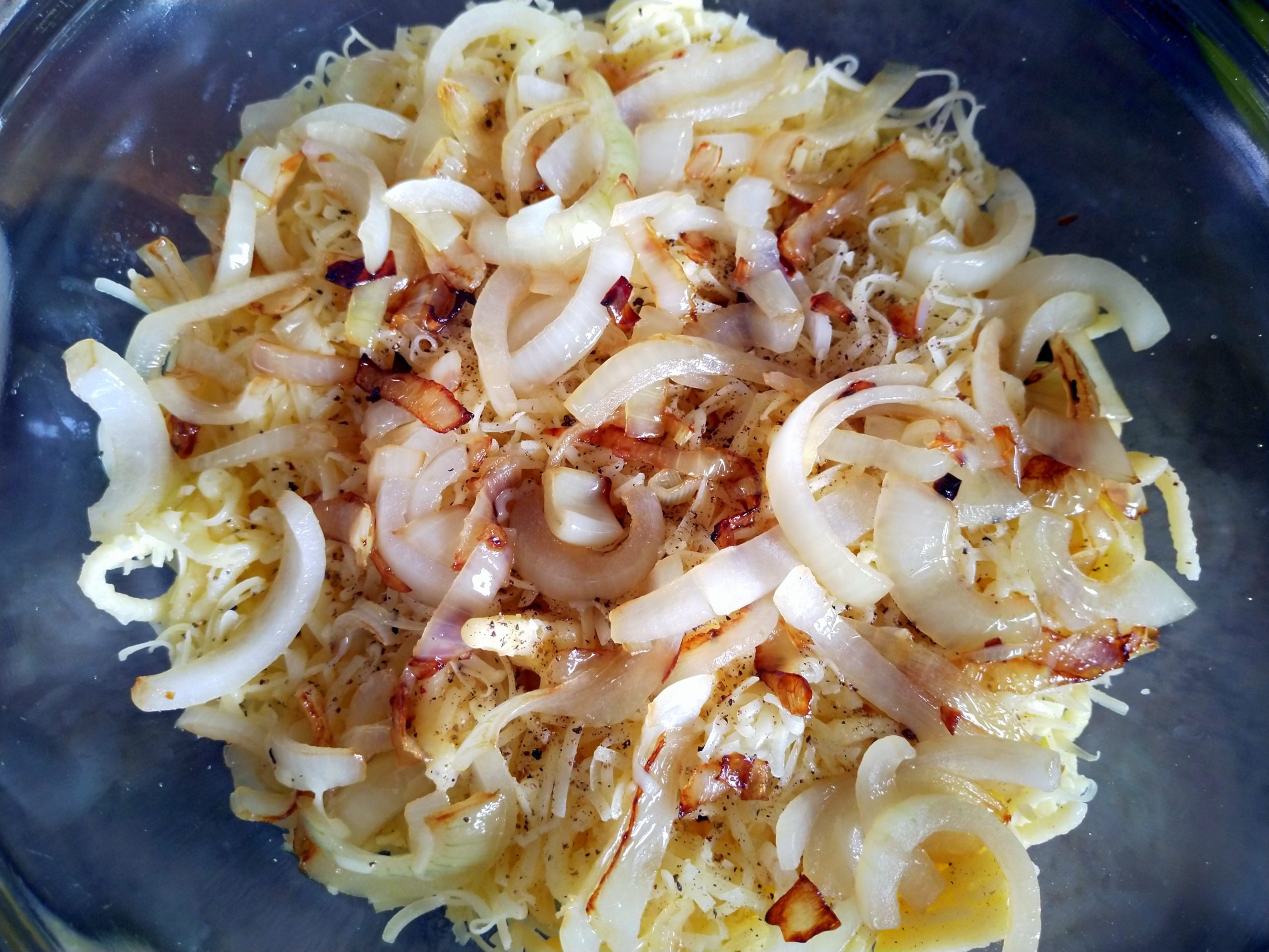 Bis die nächste Portion fertig ist, etwas Pfeffer, Käse und Zwiebeln über die fertigen Spätzle geben. Nacheinander mehrere Schichten machen, die oberste Schicht mit etwas Käse und ordentlich Zwiebeln bedecken.