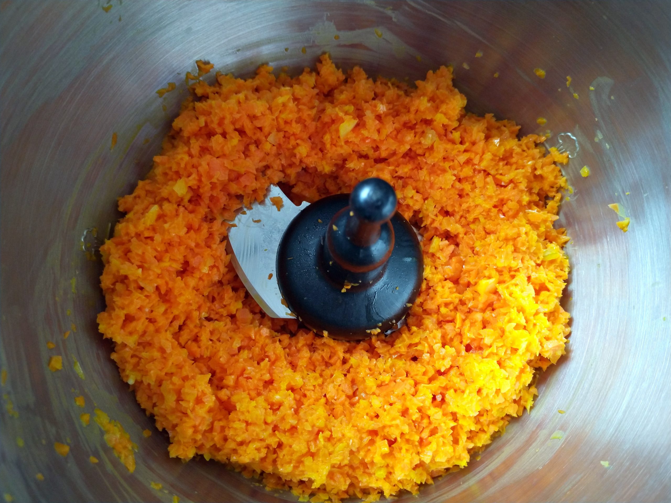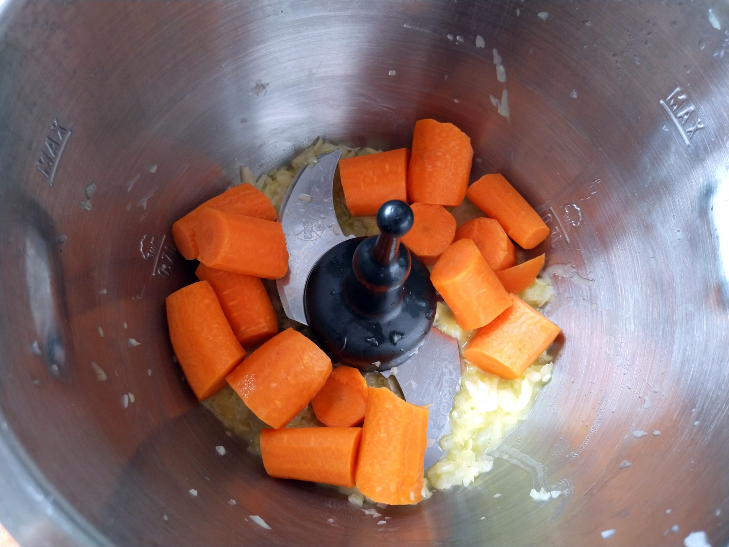 Bei Verwendung der Prep&Cook grob zerkleinerte Möhren zugeben und 30 s auf Stufe 10 zerkleinern. Restliche Zutaten zugeben und 10 min bei 95°C auf Stufe 2 dünsten.