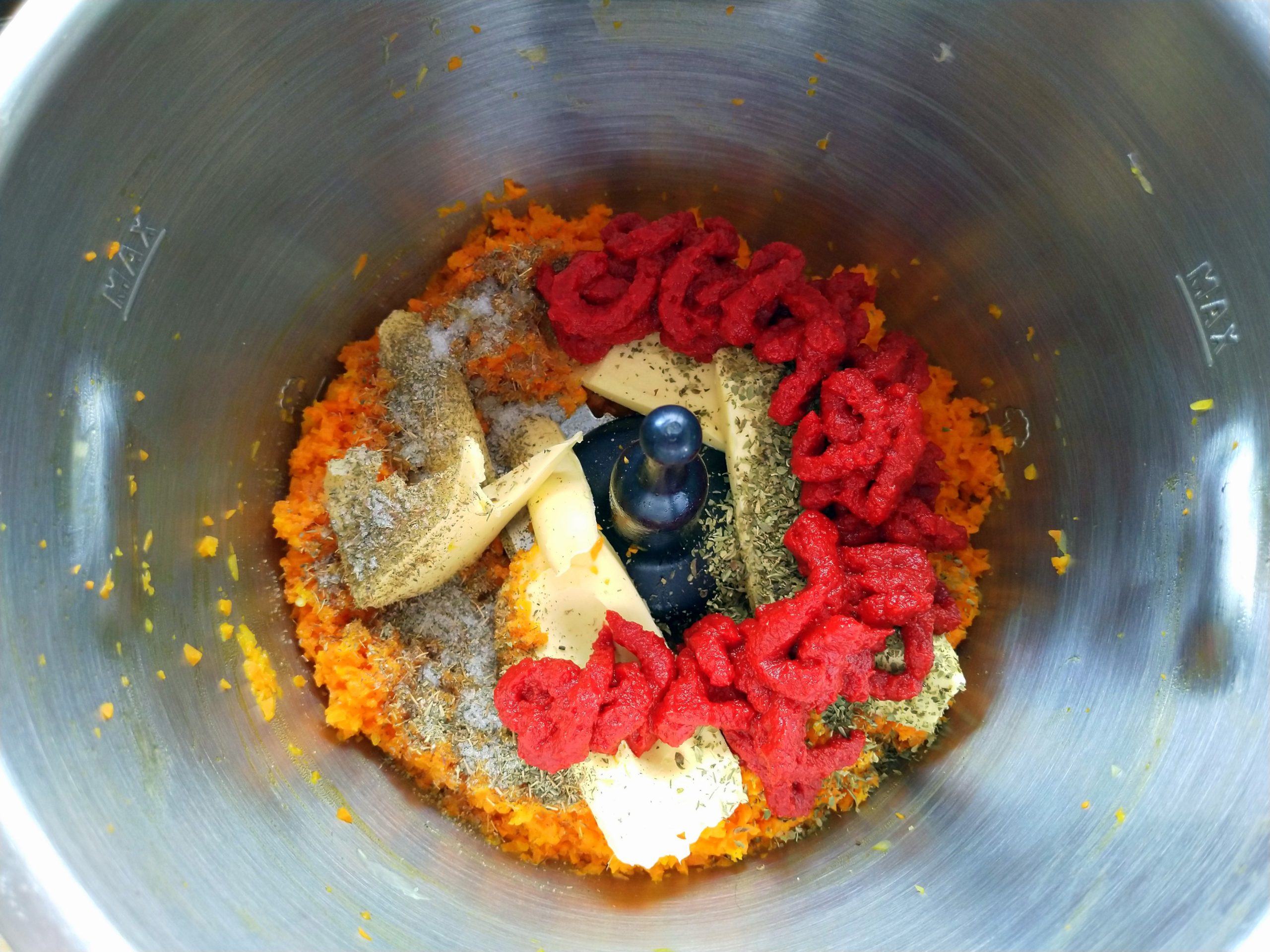 3. Geraspelte Möhren und restliche Butter zugeben und mit den übrigen Zutaten ca. 10 min auf niedriger Stufe dünsten.