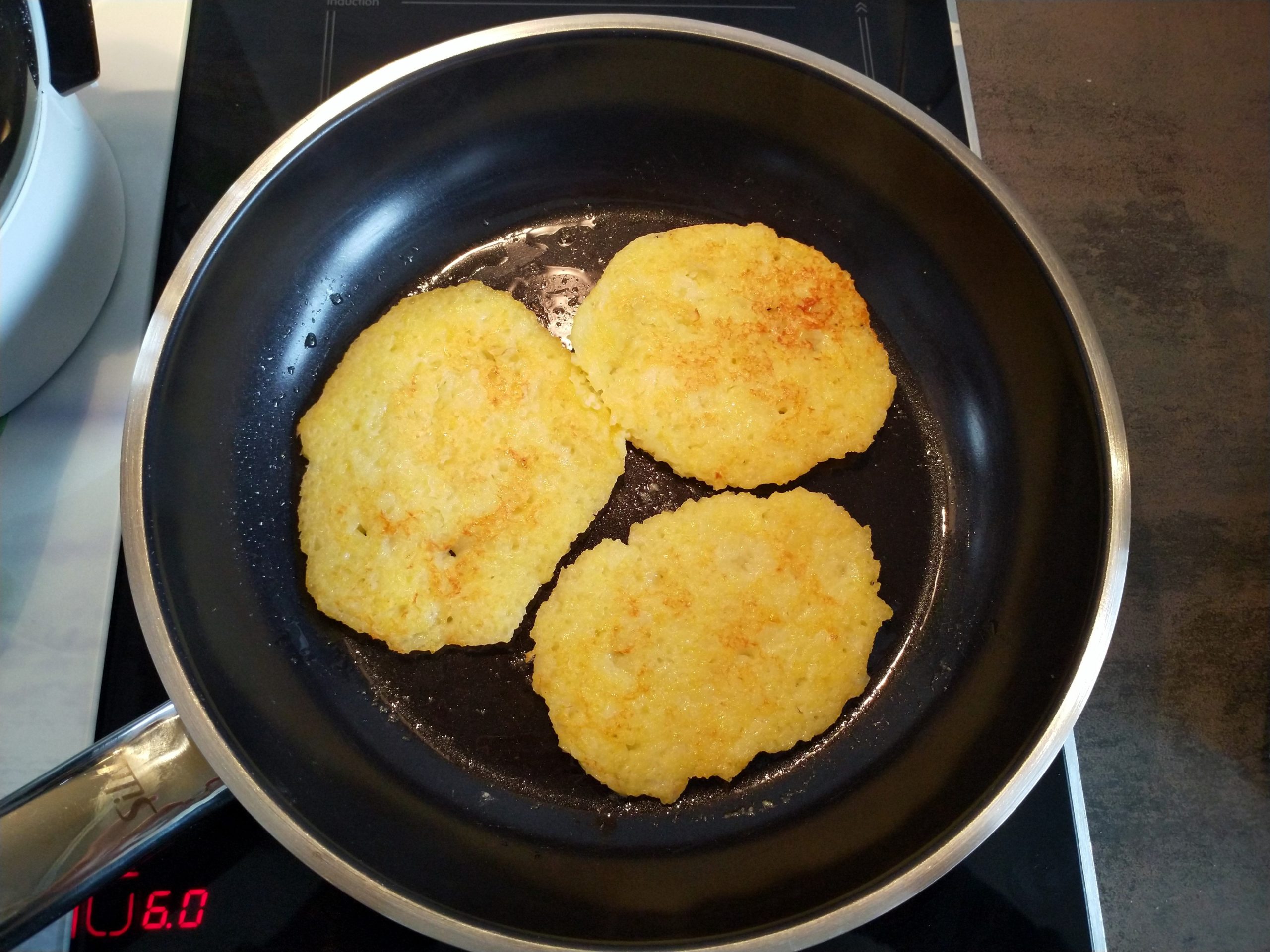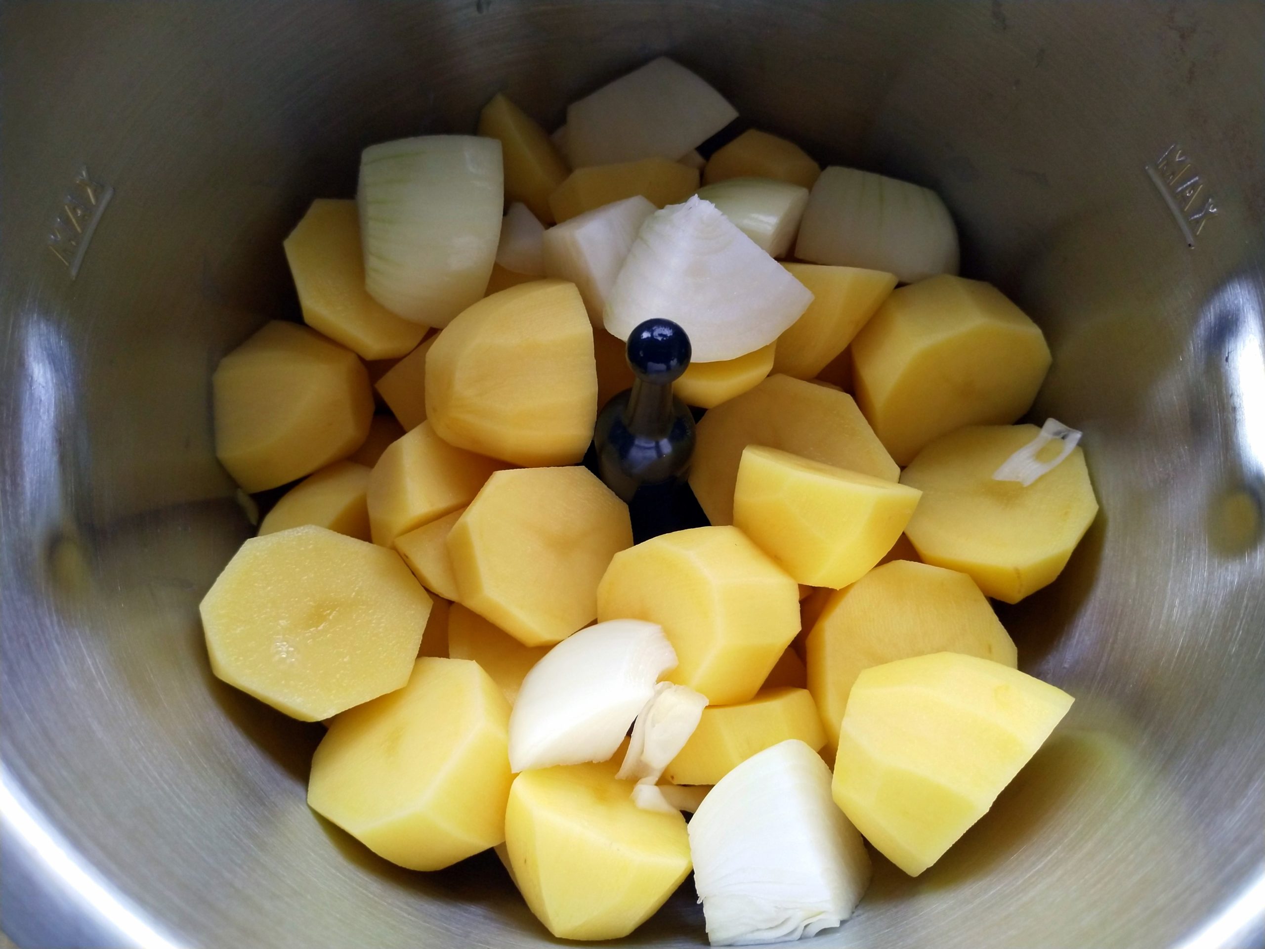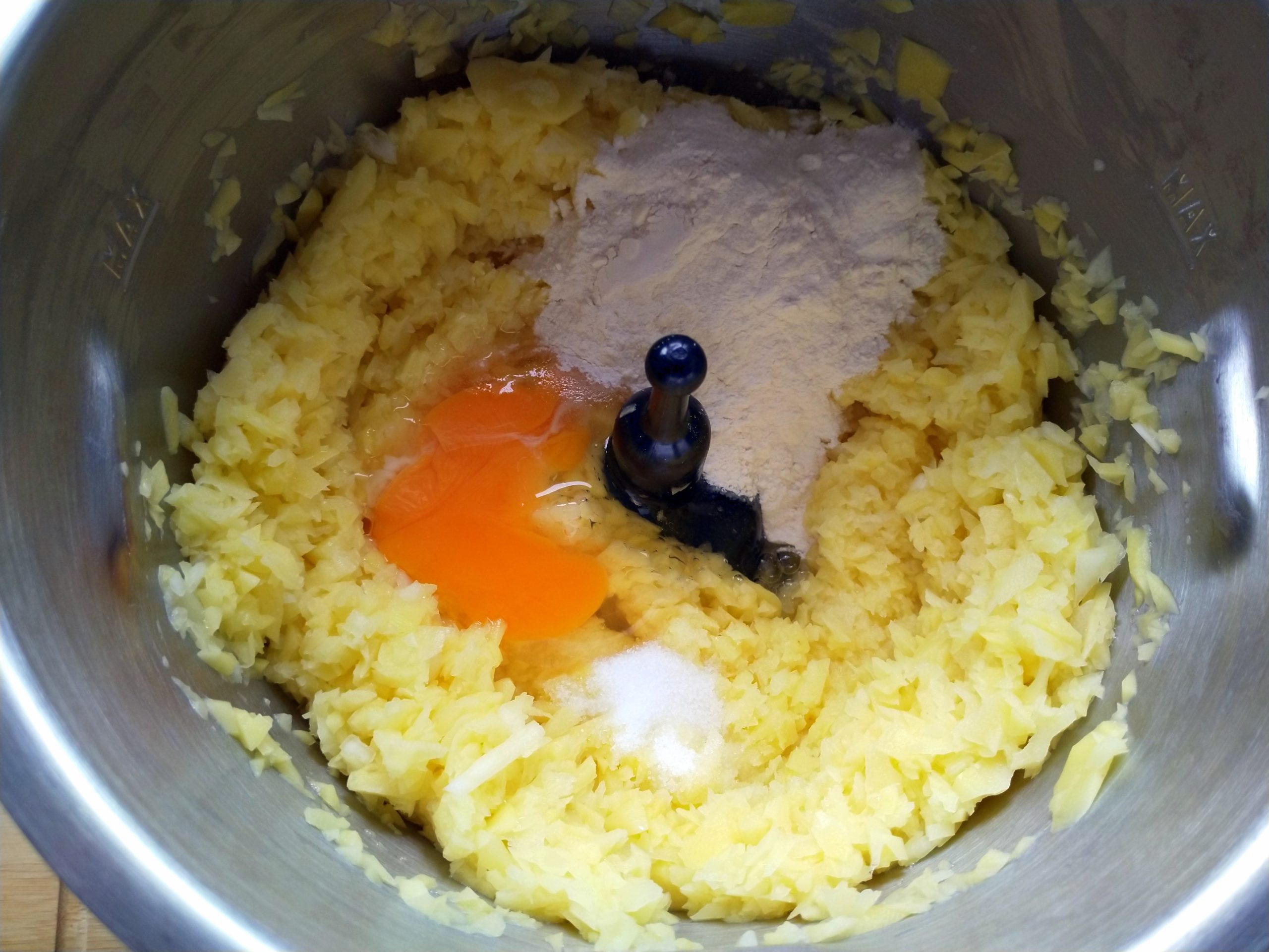 Kartoffeln schälen, grob vierteln, Zwiebeln ebenfalls vierteln. Ultrablade-Messer einsetzen und auf Stufe 10 fein hacken. Anschließend Ei, Mehl und Salz dazu und nochmal auf Stufe 7 verrühren, ggf. mit einem Schaber/Löffel nochmal nachrühren. Danach weiter bei Schritt 3.