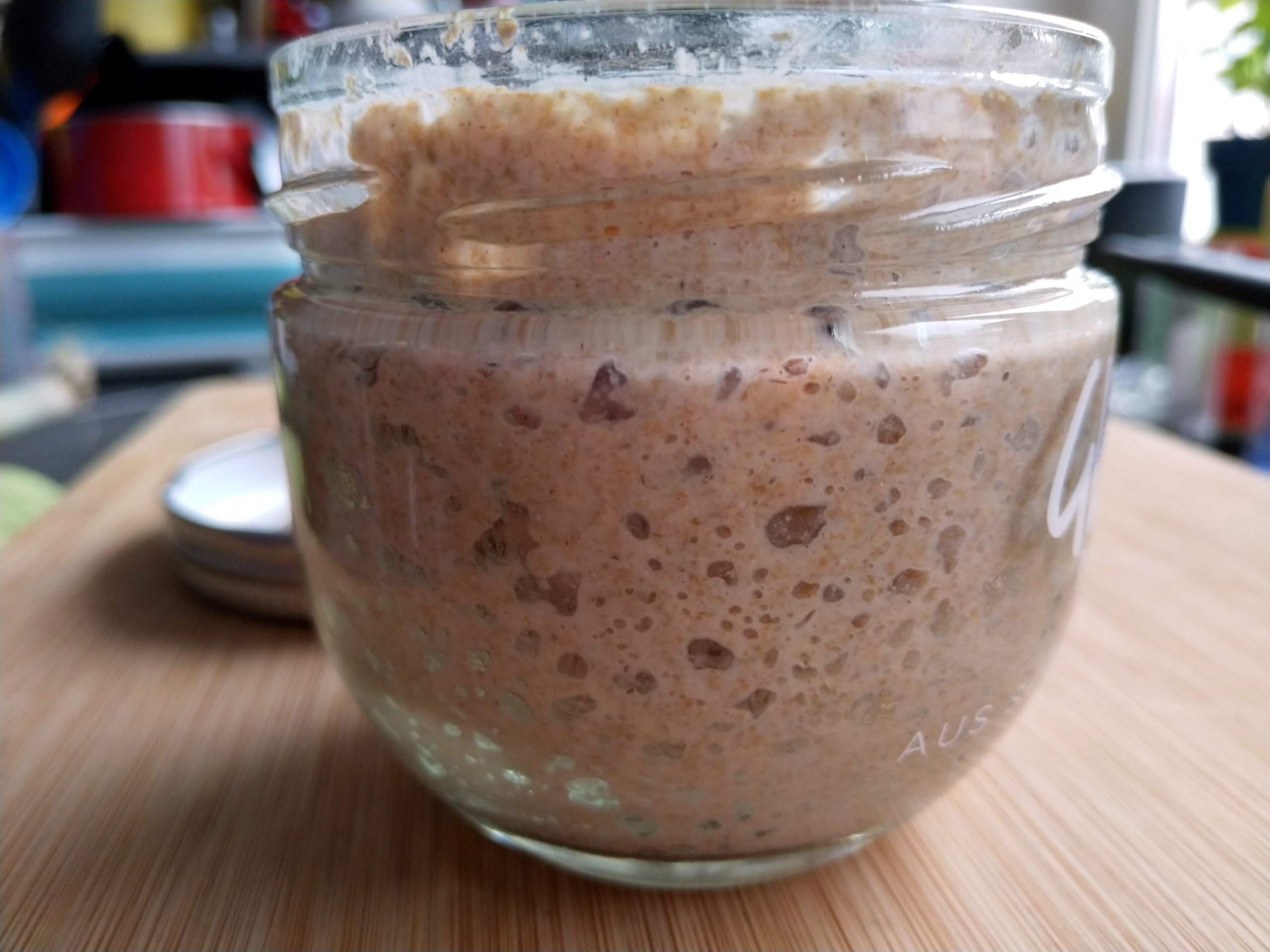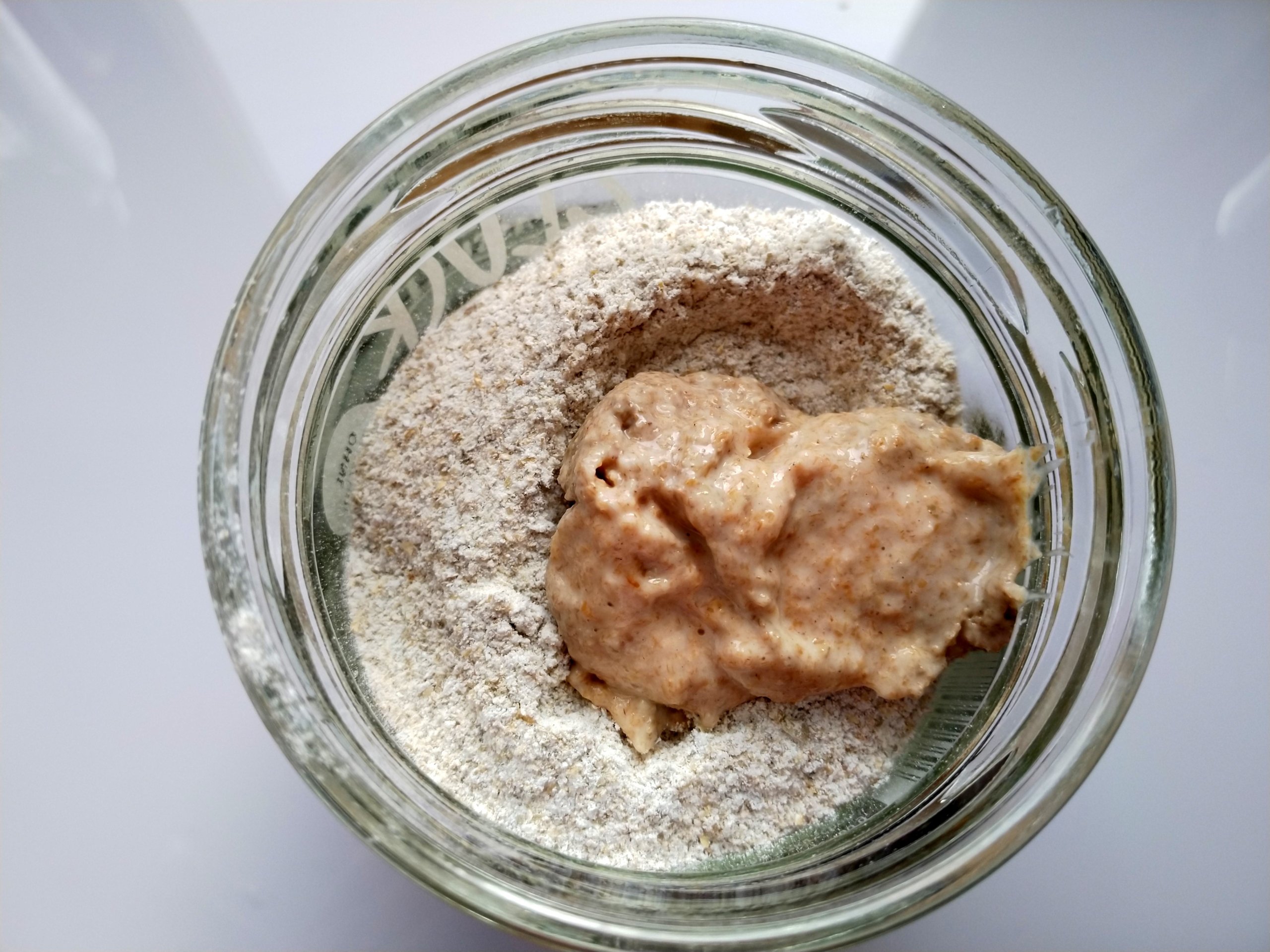 Anstellgut (schon bestehender Sauerteig) mit Mehl und Wasser vermischen und 24 h bei Raumtemperatur stehen lassen.