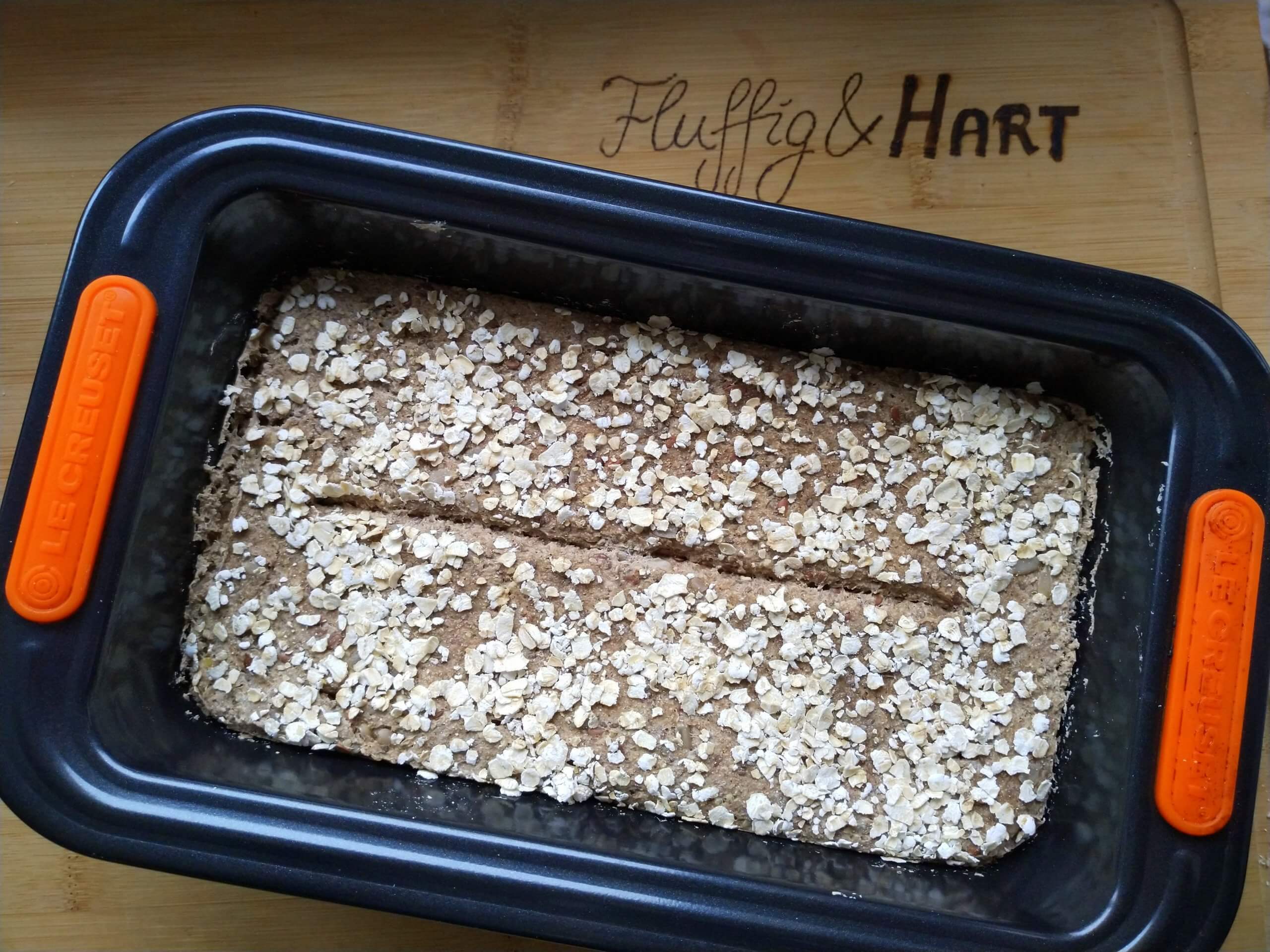 Mit Haferflocken bestreuen, leicht andrücken und einritzen. Mit einem Küchentuch abgedeckt 24 h bei Raumtemperatur gehen lassen. Anschließend im vorgeheizten Backofen bei 230°C backen.