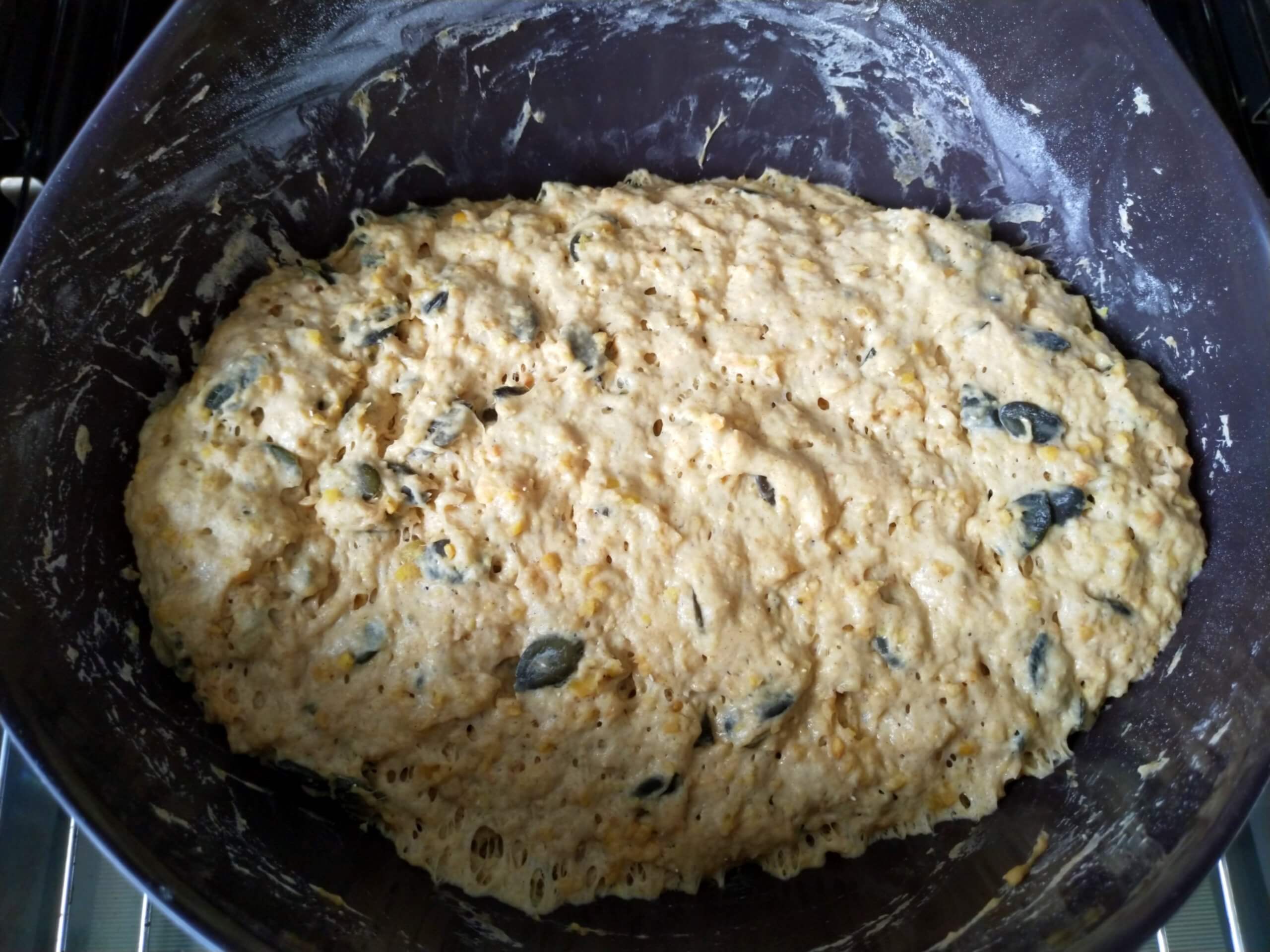Schüssel abdecken und an einem warmen Ort 45 min gehen lassen. Nochmal durchkneten, zu einem Brotlaib formen und erneut 45 min gehen lassen.